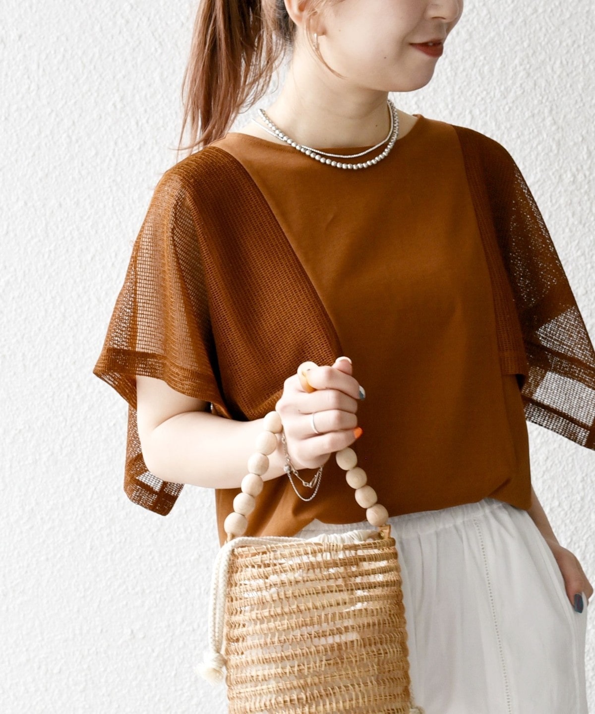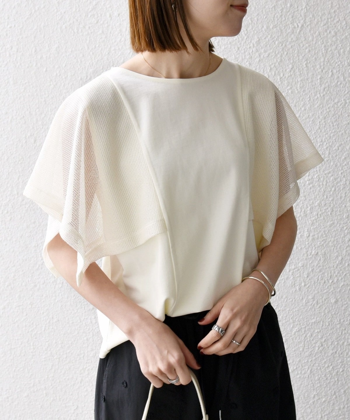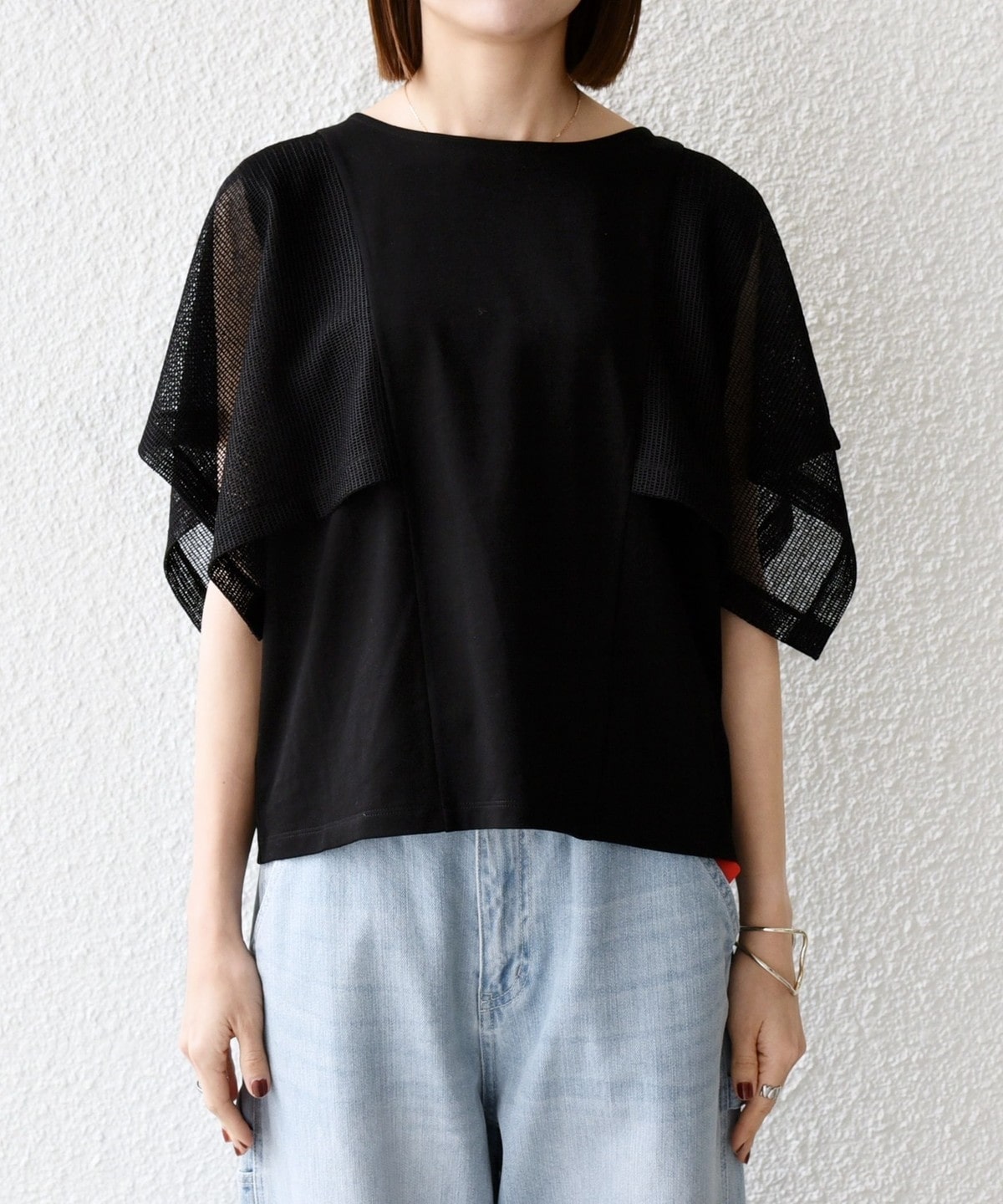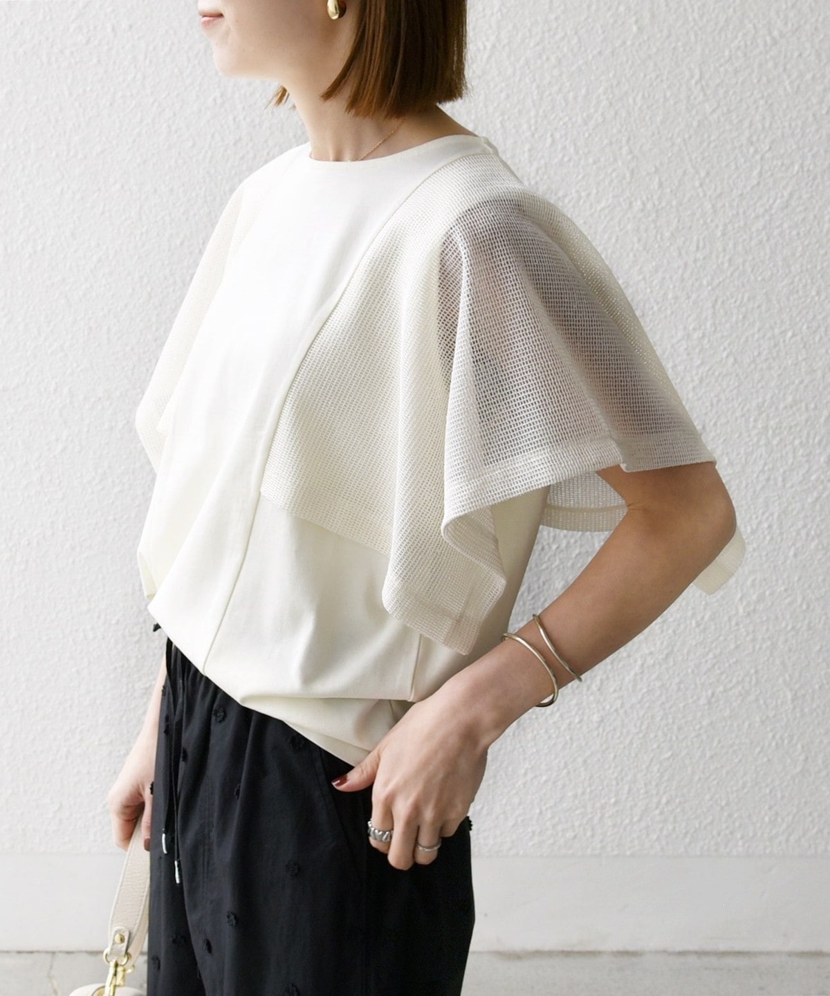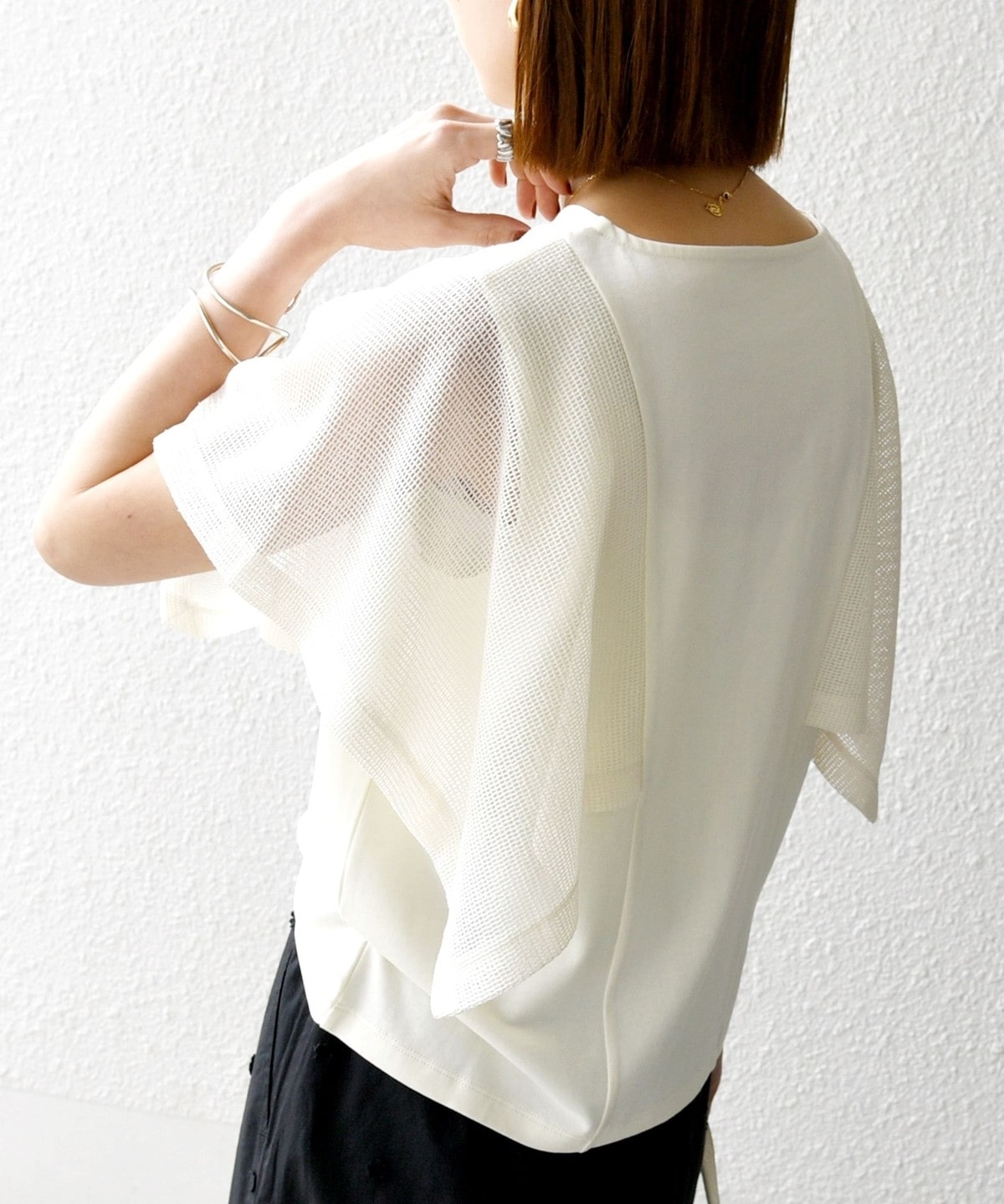 シアーでトレンド感のあるメッシュ素材の袖が、涼しげな印象のデザインTシャツ。