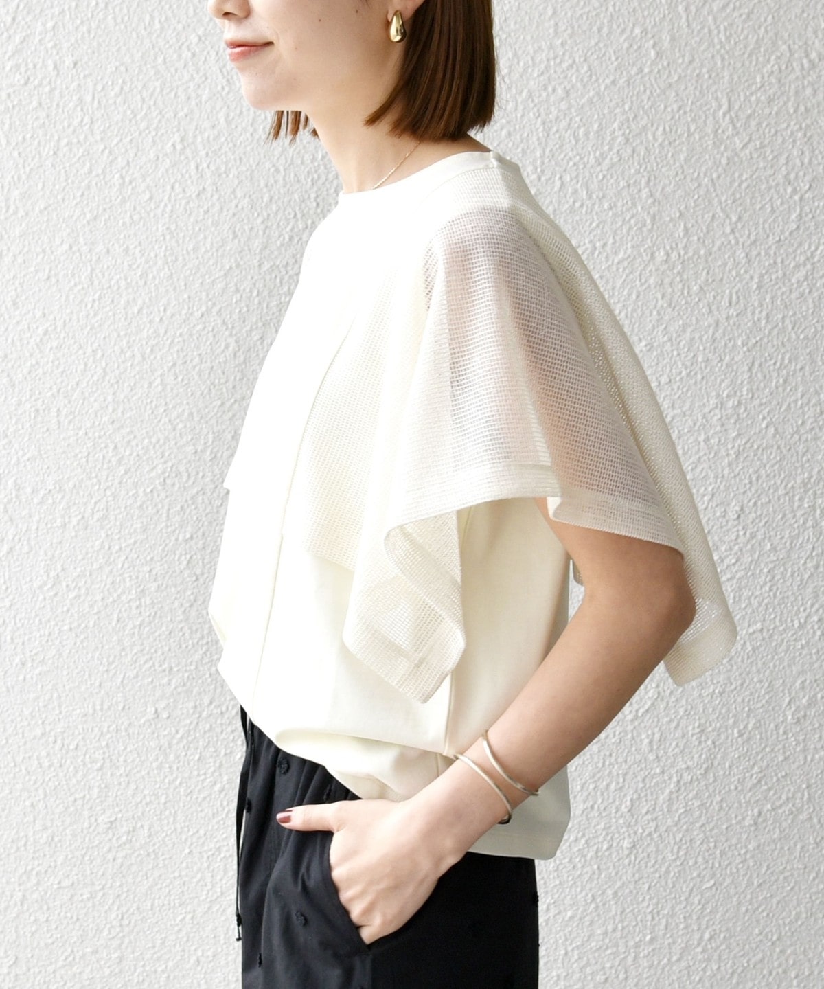 SHIPS any:〈手洗い可能〉メッシュ シアー ハンカチ スリーブ ドッキング TEE