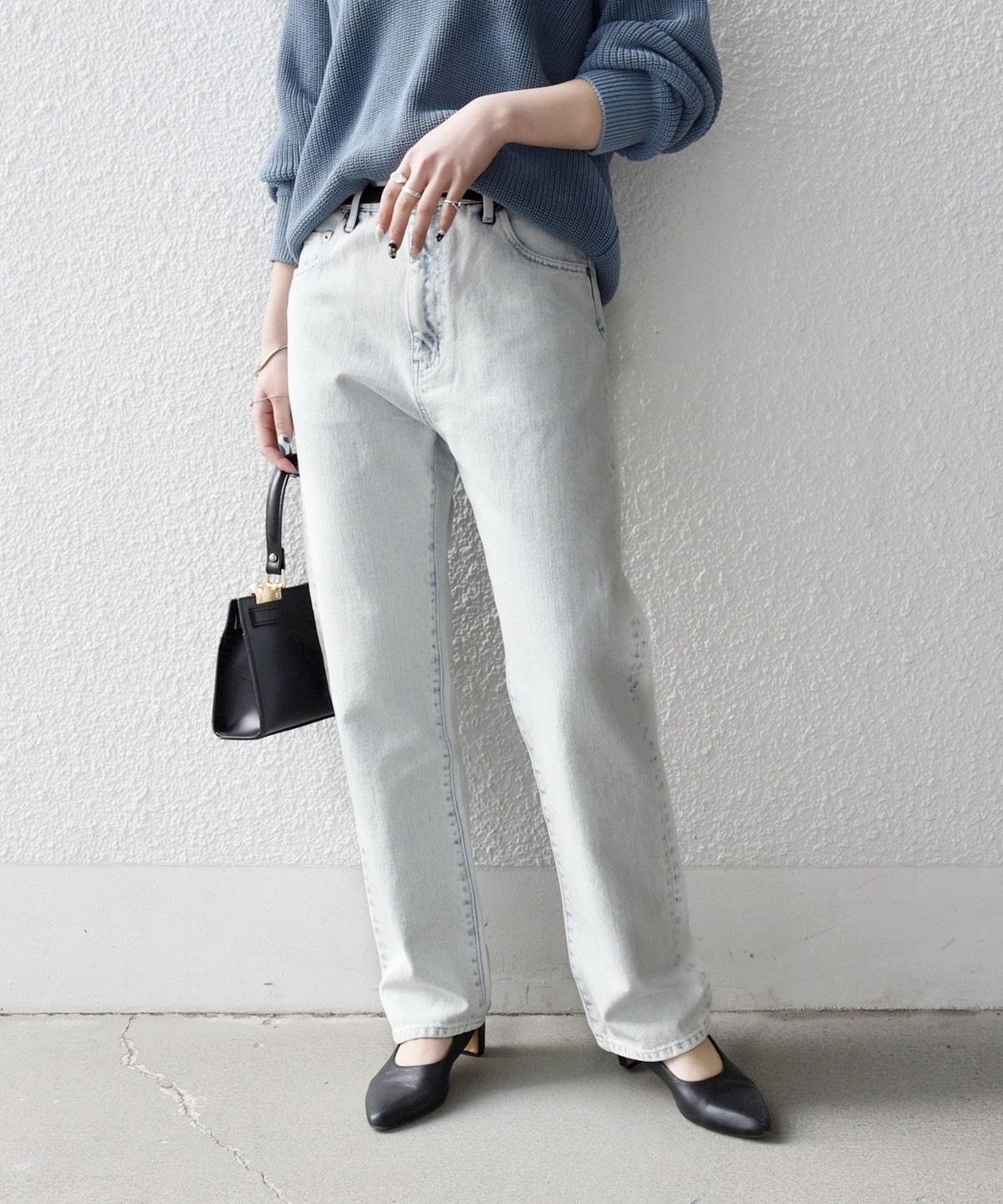 股上深めのハイライズで、ヒップ周りがややゆったりとした細すぎないカーヴィーなシルエットのデニムパンツ。