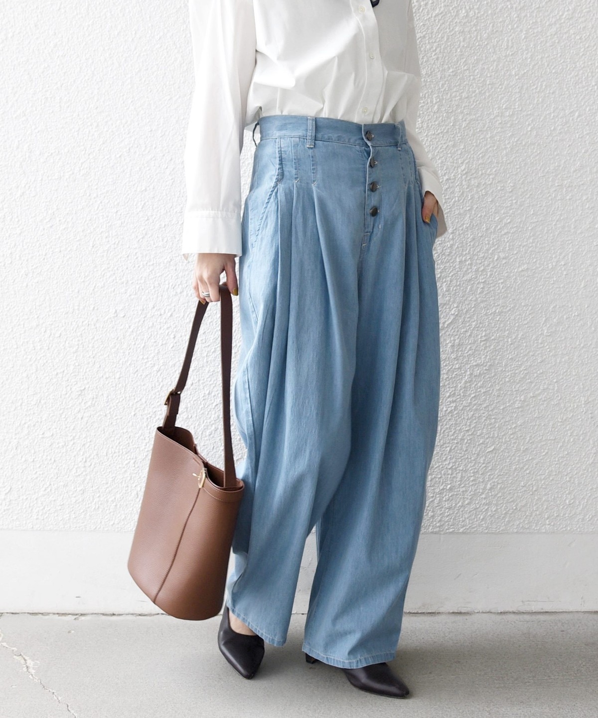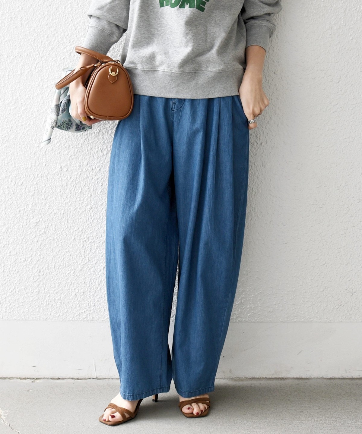 ふんわりしたバレルシルエットがポイントのワイドパンツ。