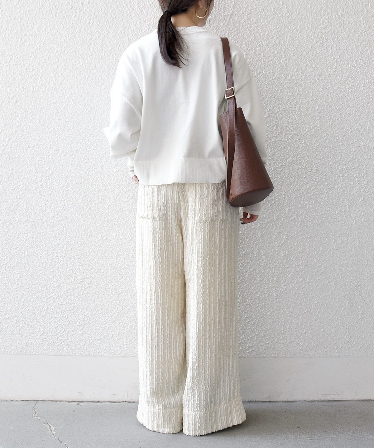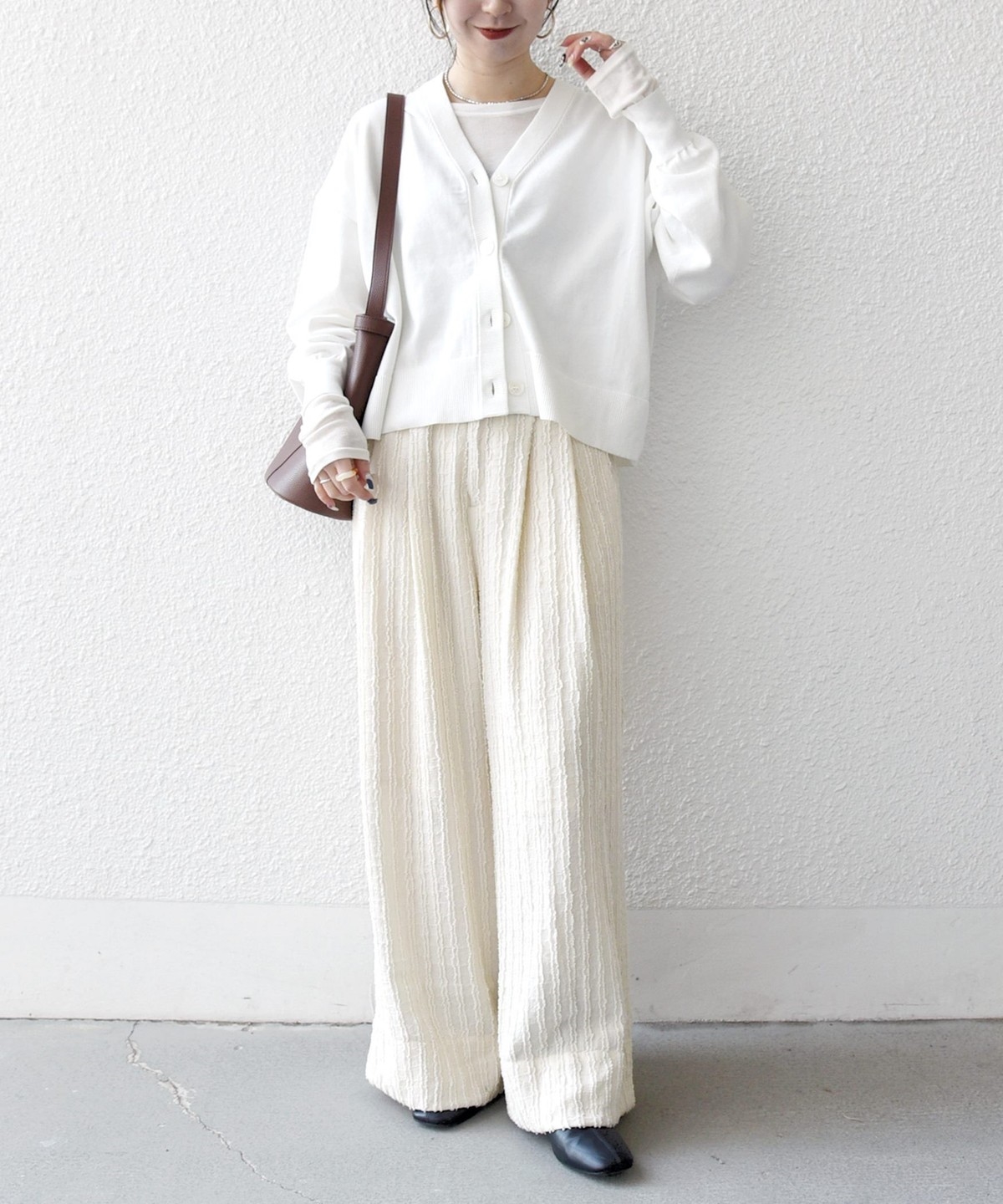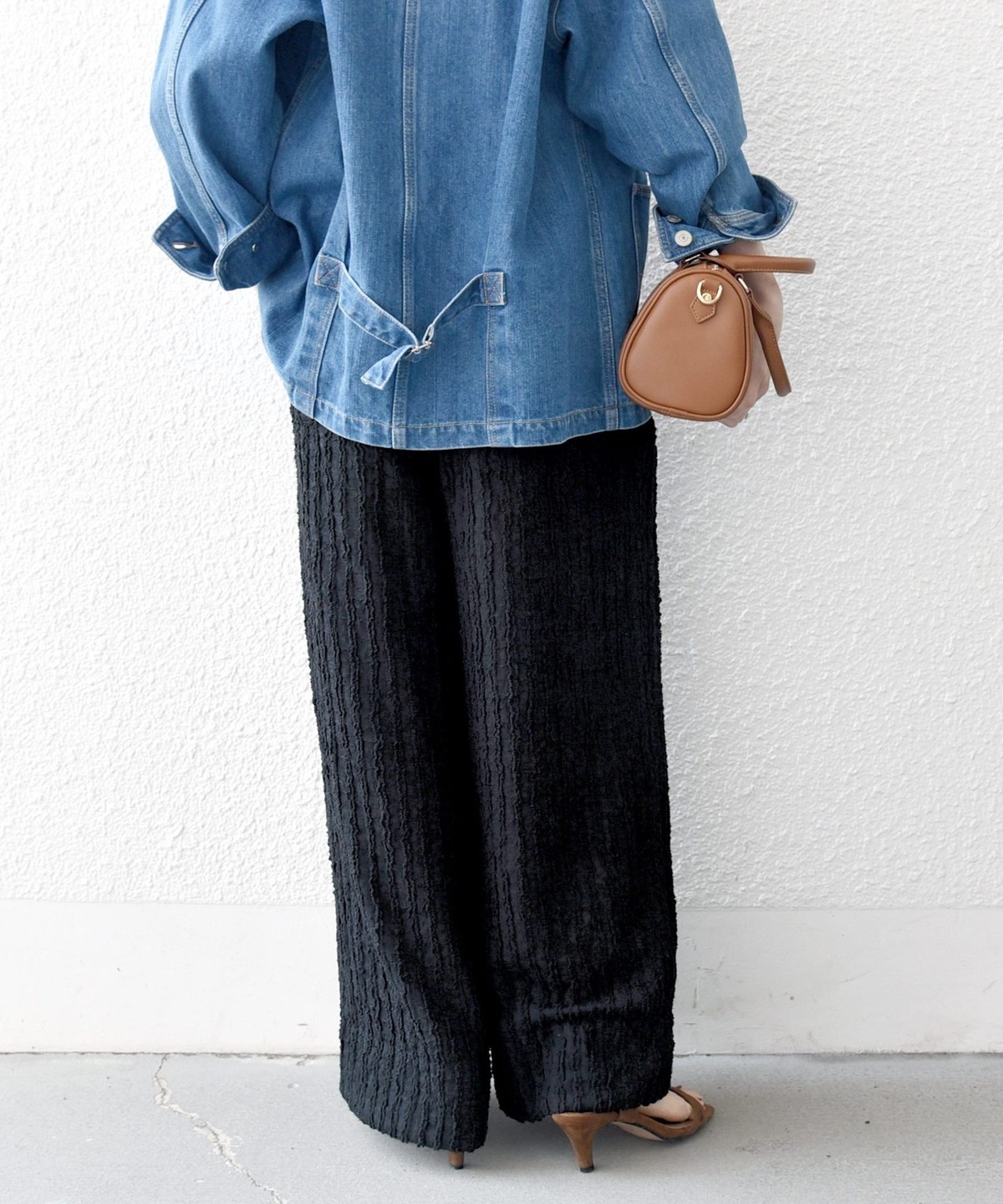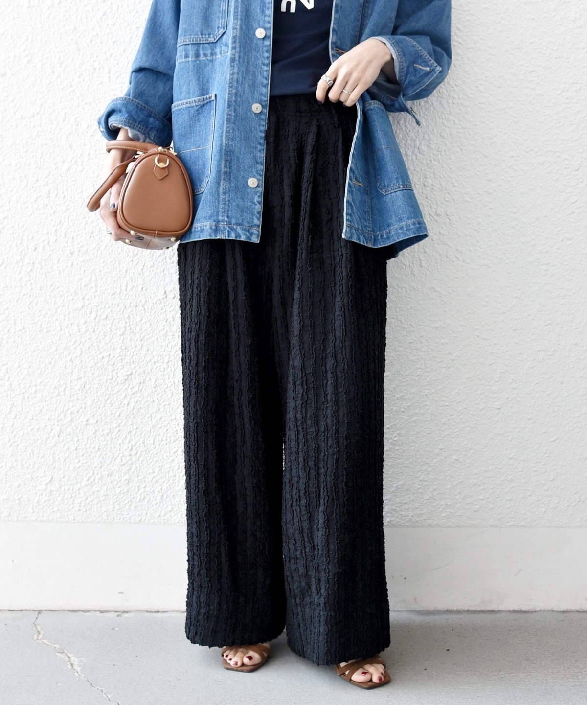 ワイドシルエットながら落ち感があり、ショート丈トップスとも好相性です。