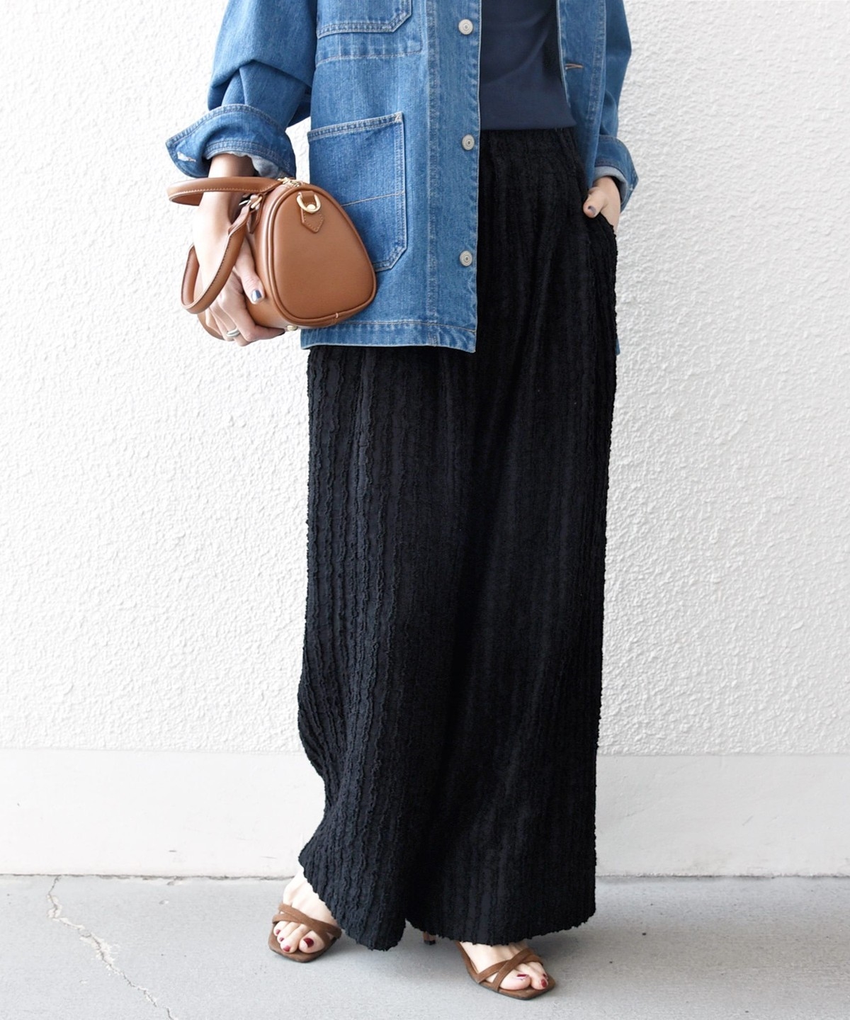 素材感が映えるため、シンプルなトップス合わせでもサマになる一着。