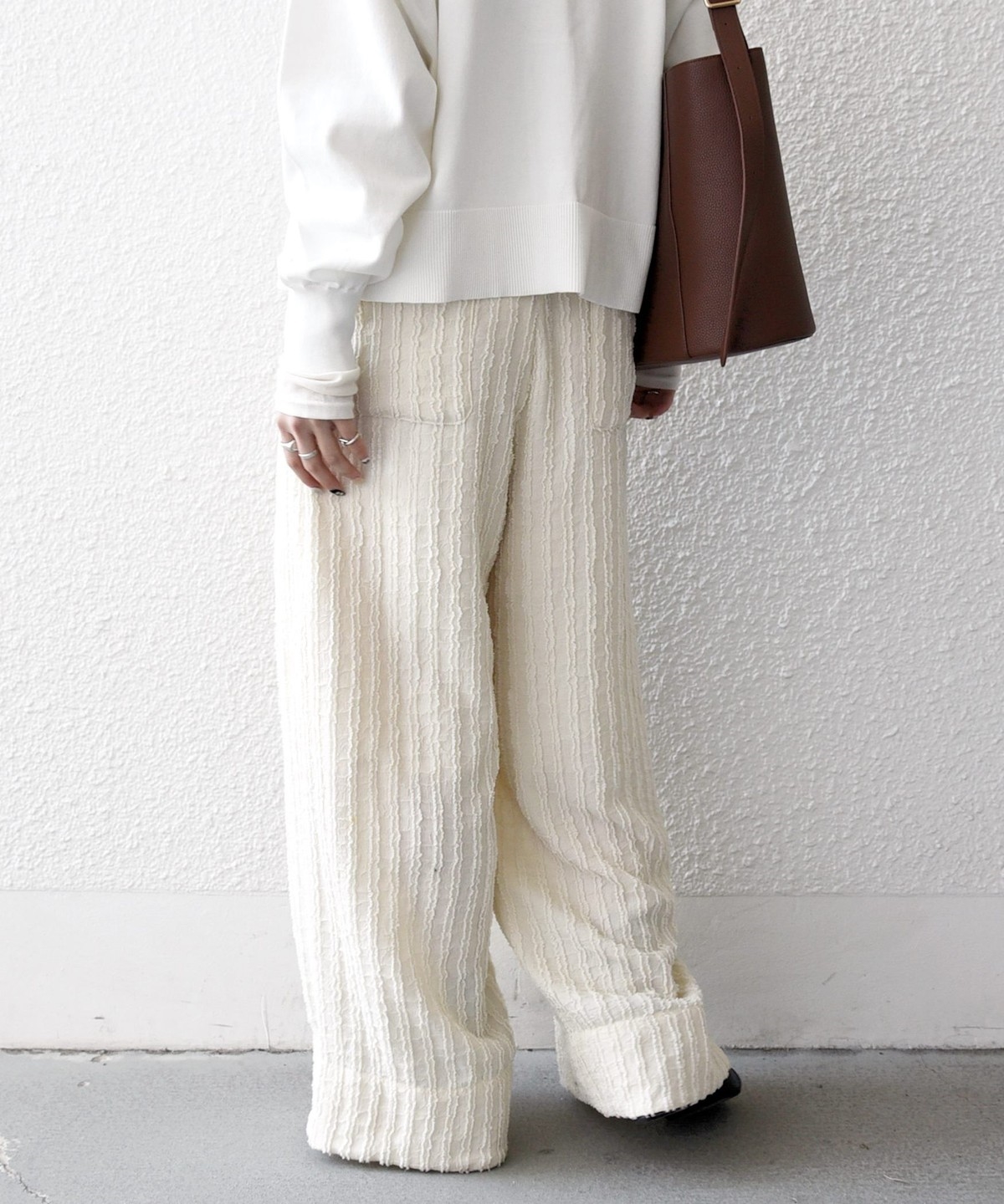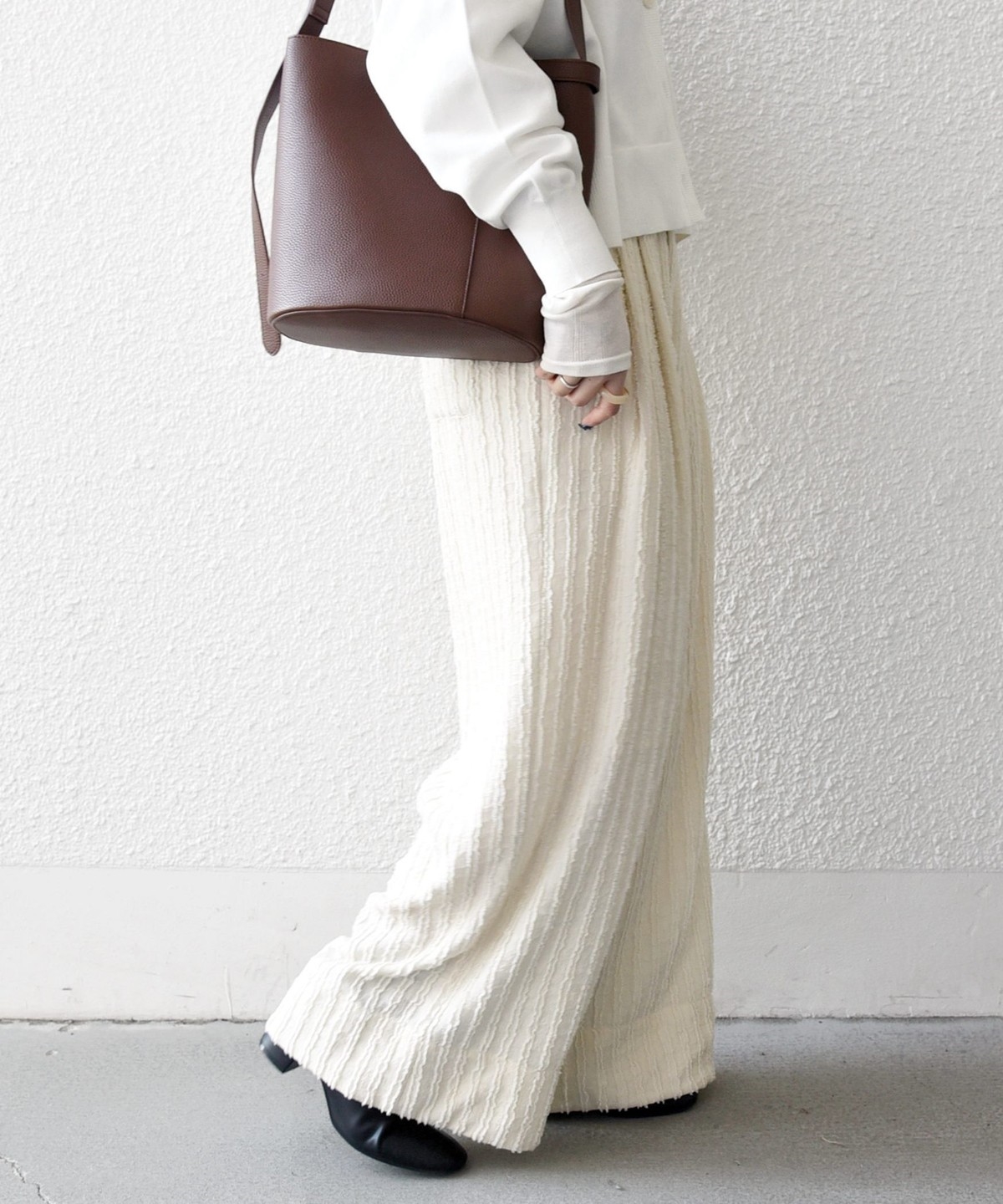 表情のある素材を活かした、シンプルながら存在感のあるワイドパンツ。