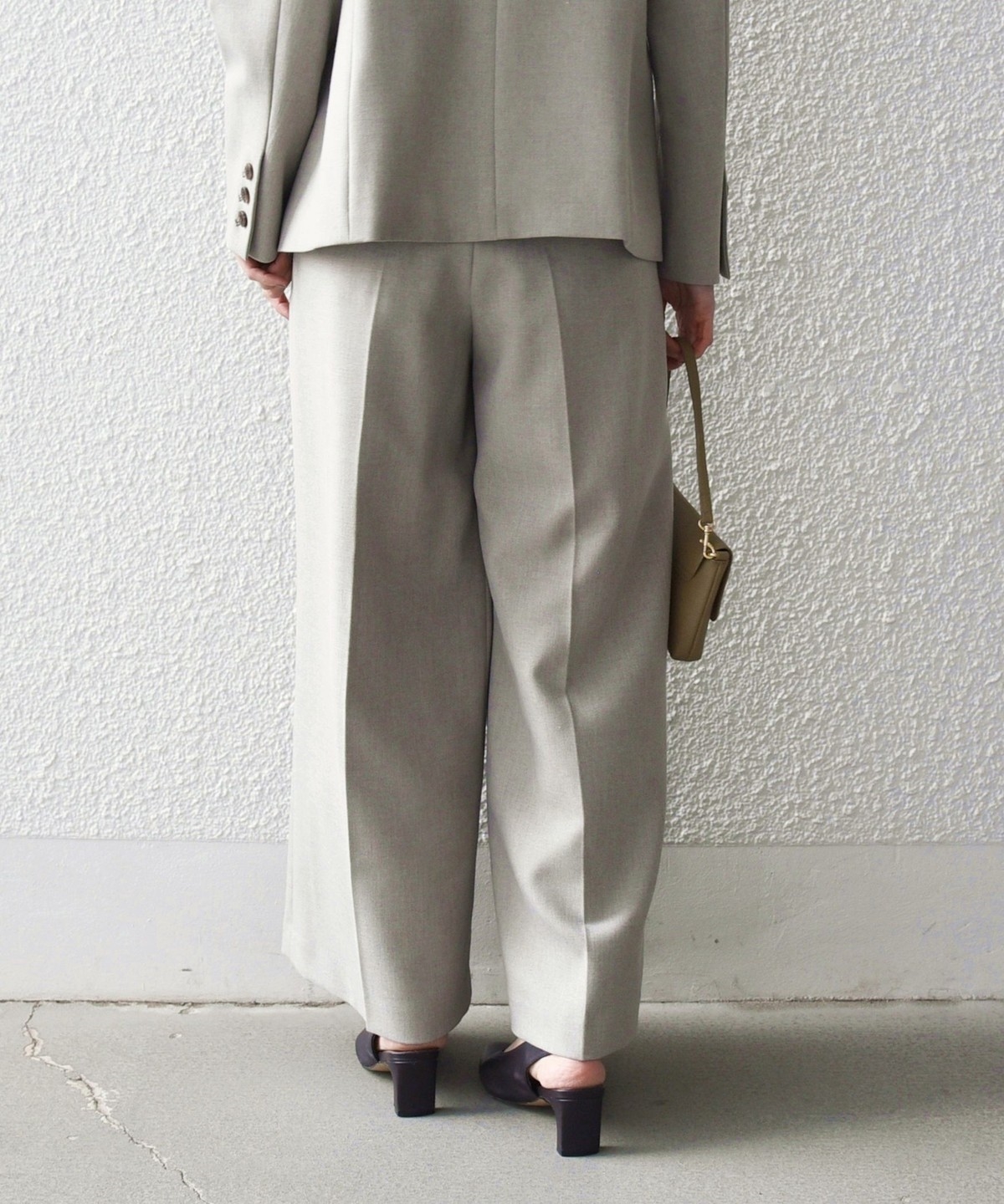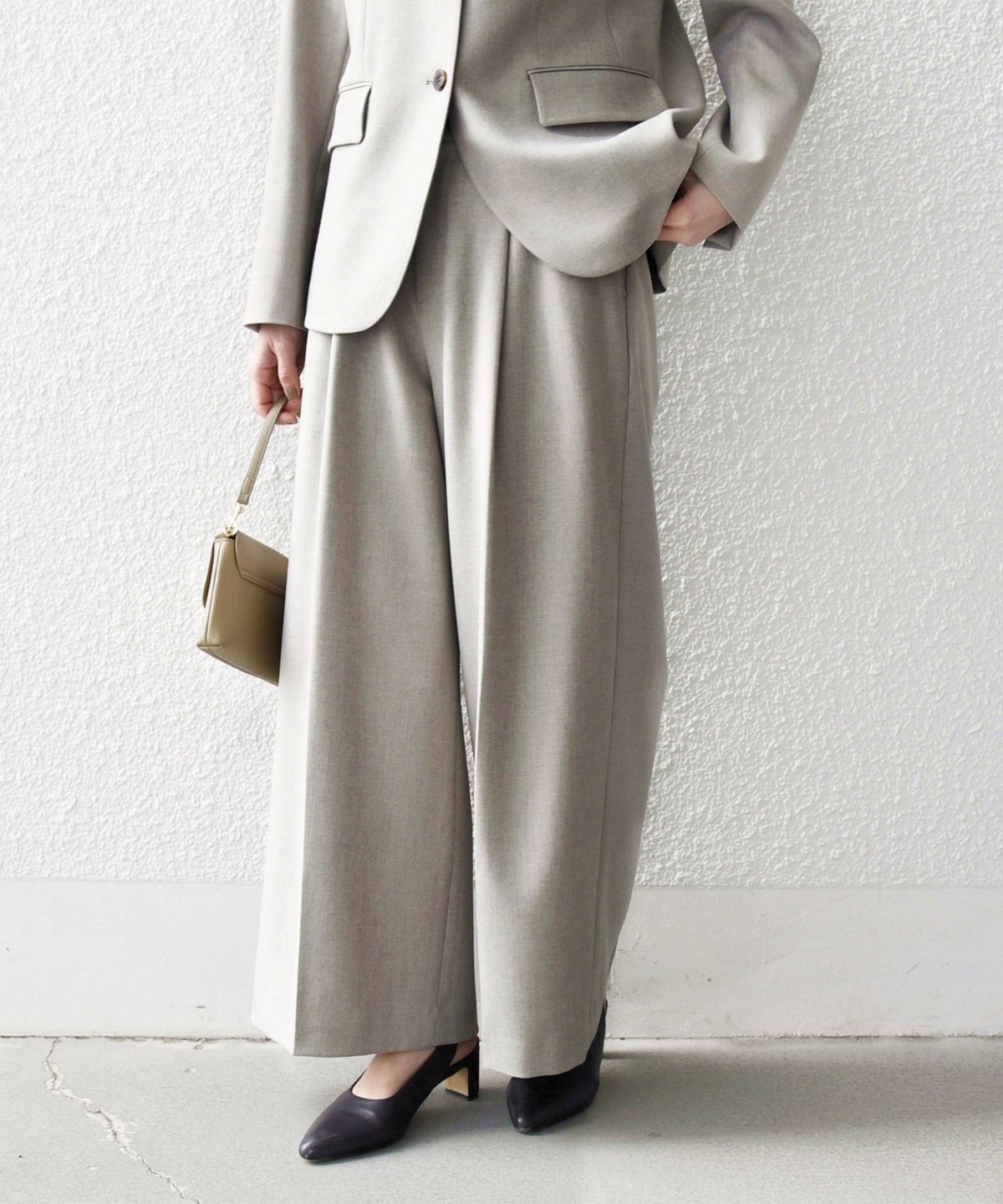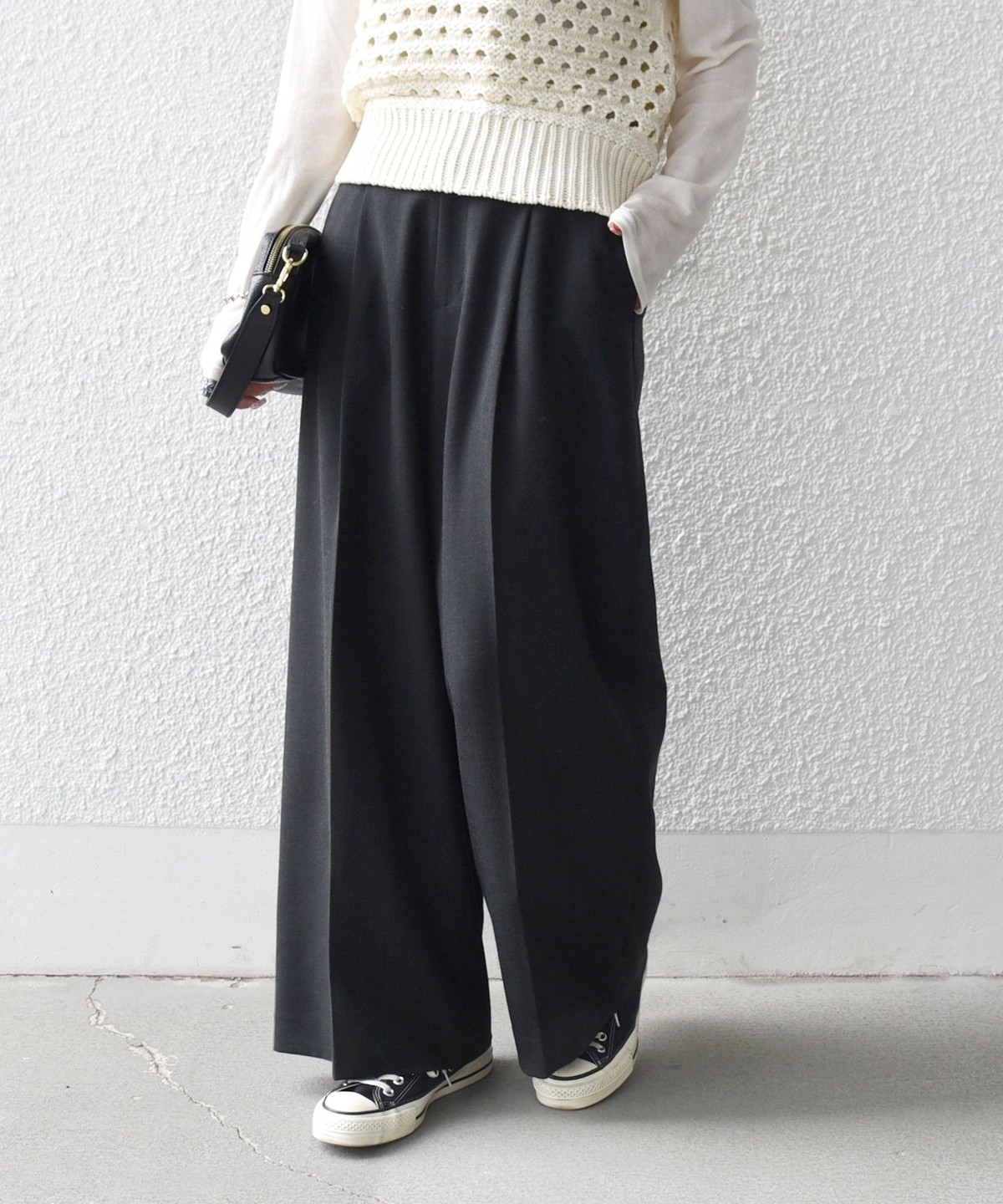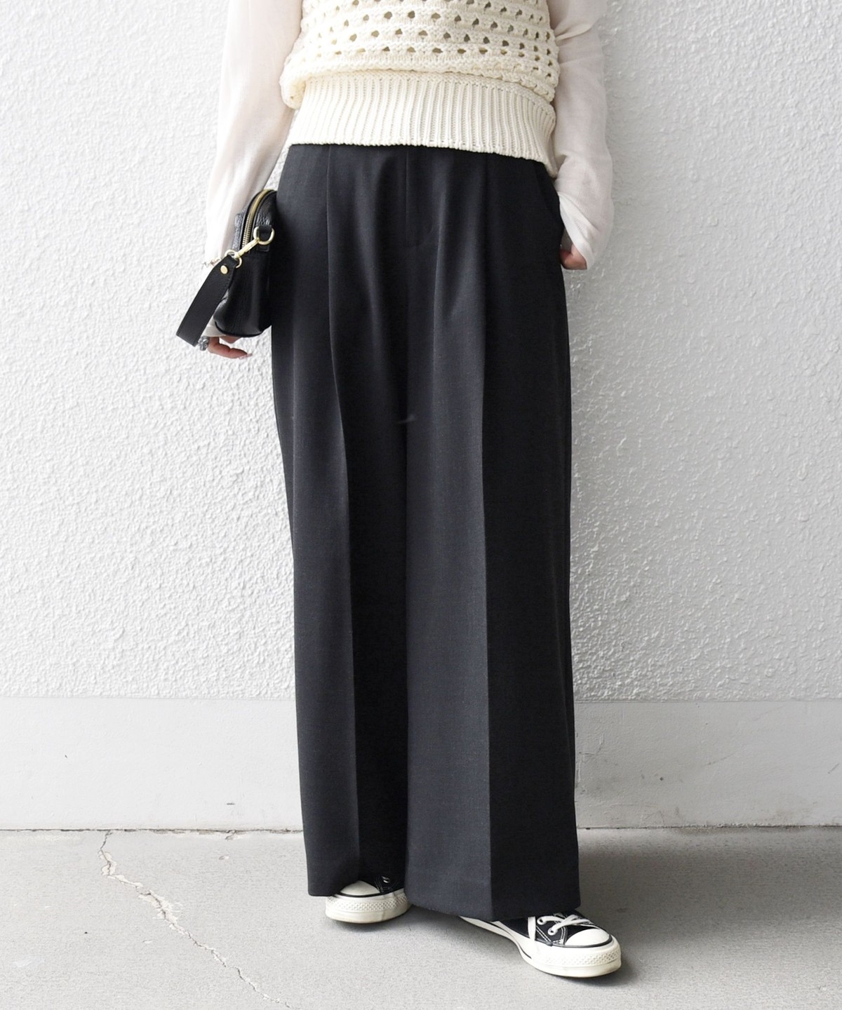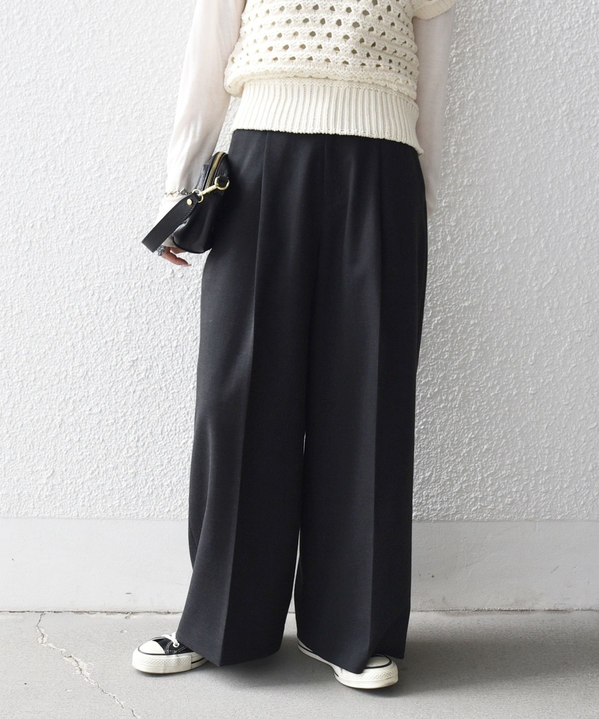 フロントのタックと折山ラインが縦のラインを強調し、ワイドながらもすっきりとした印象に。