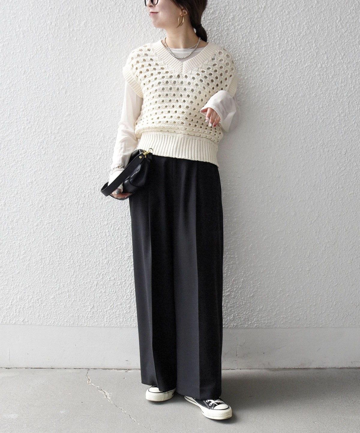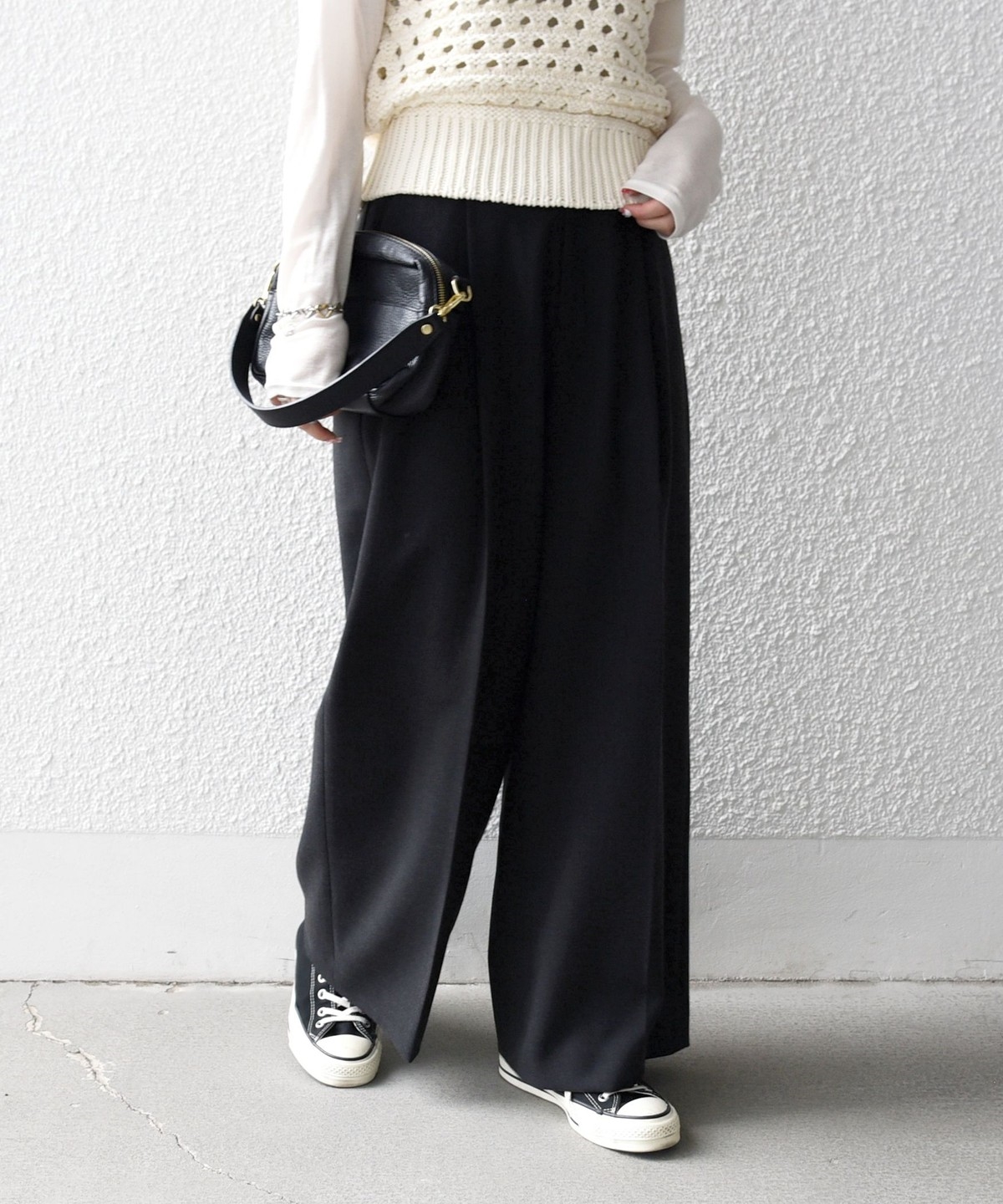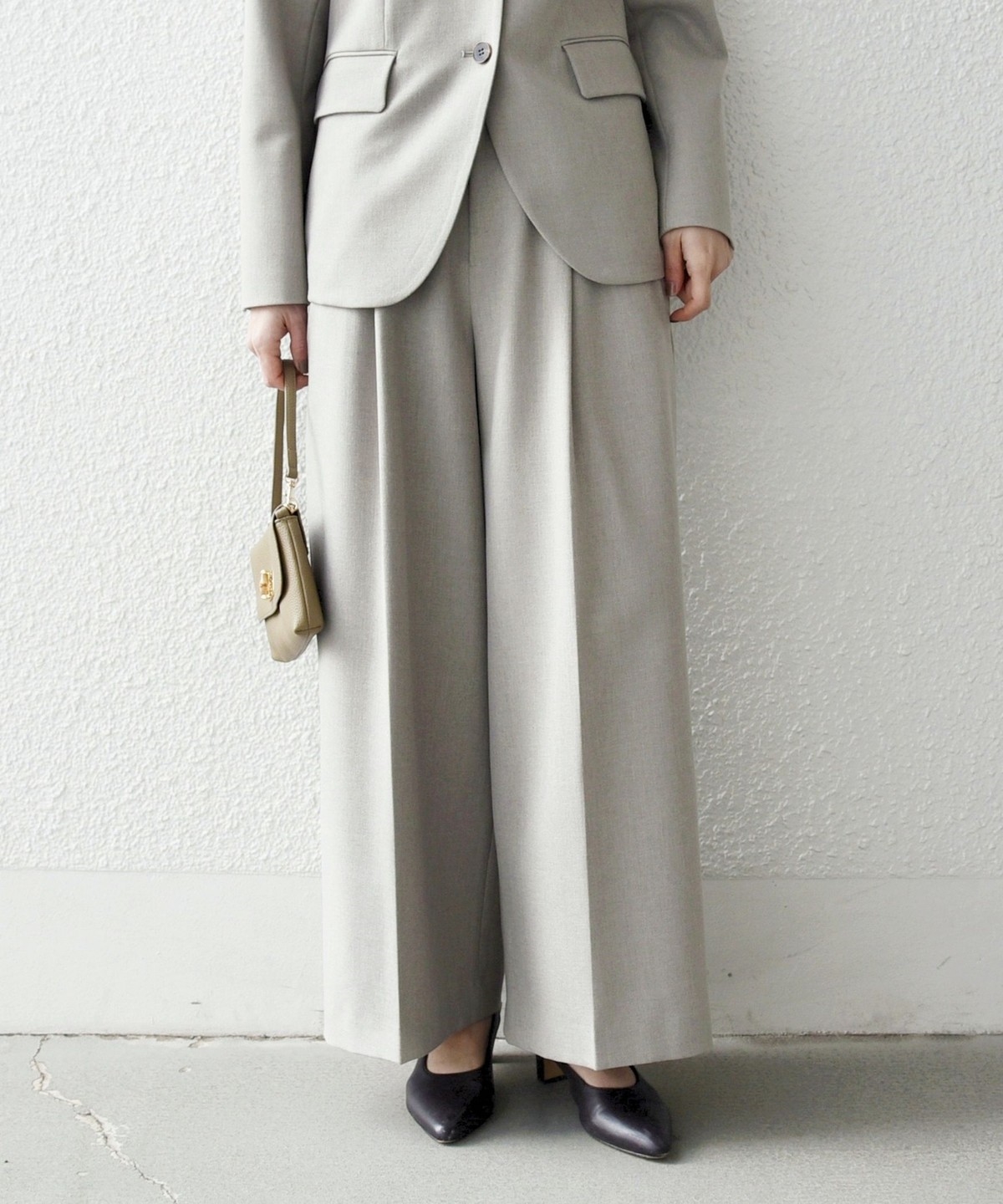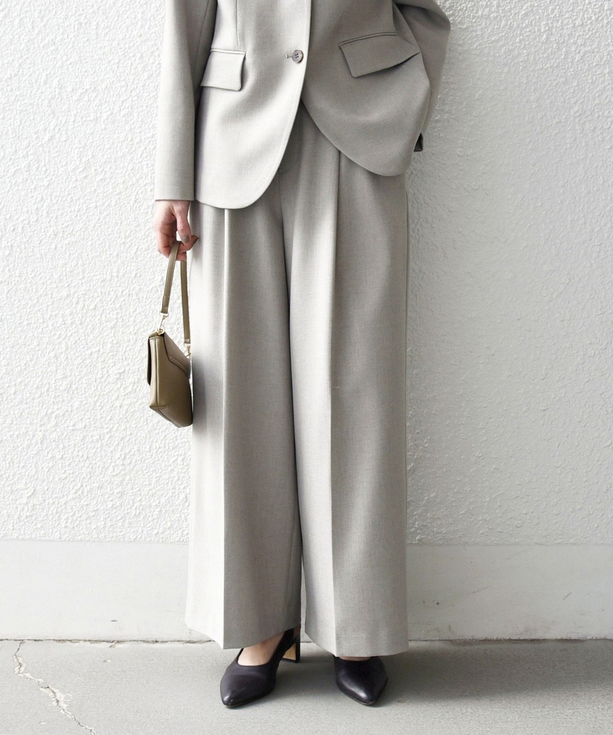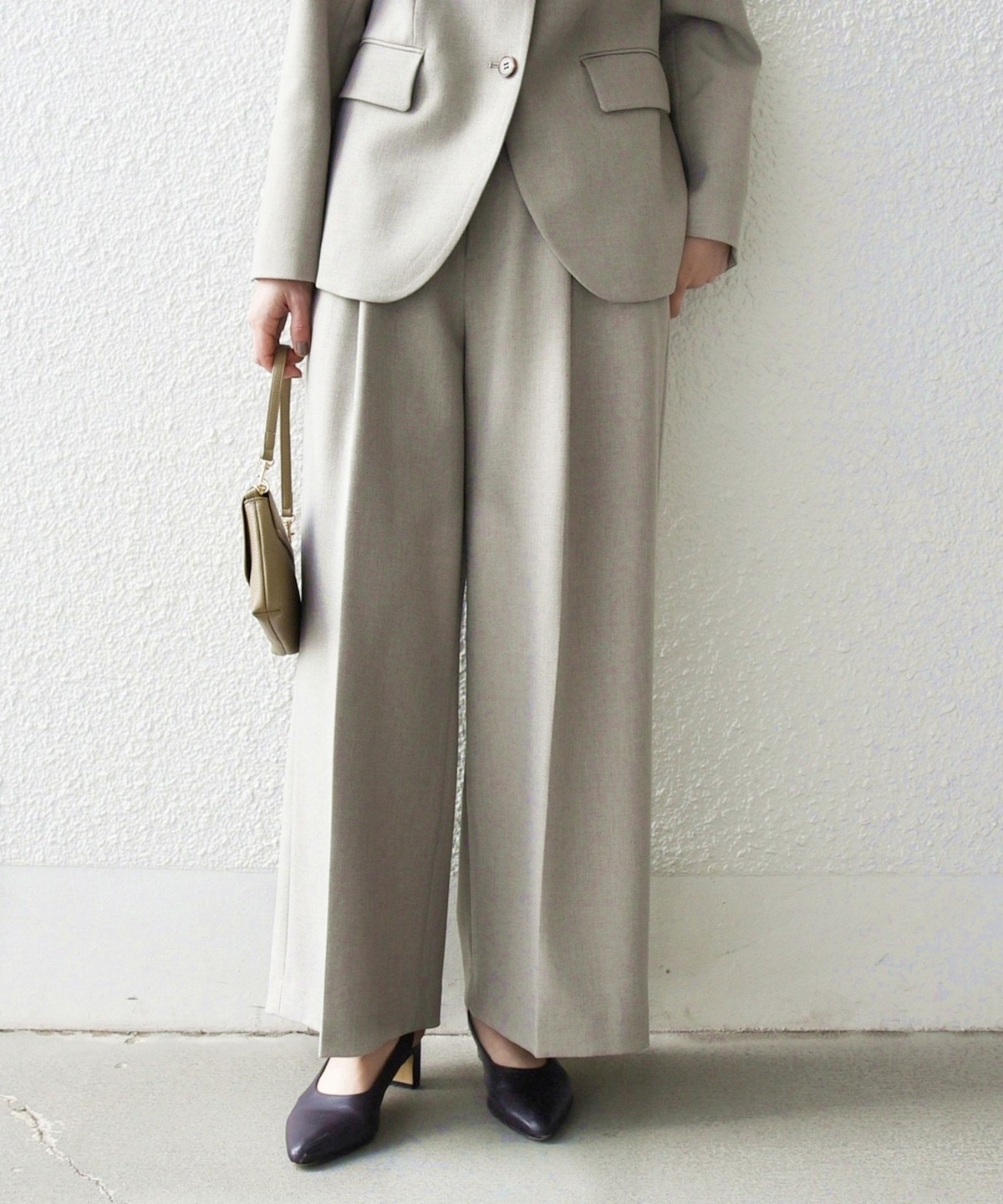 フロントのタックと折山ラインが縦のラインを強調し、ワイドながらもすっきりとした印象に。