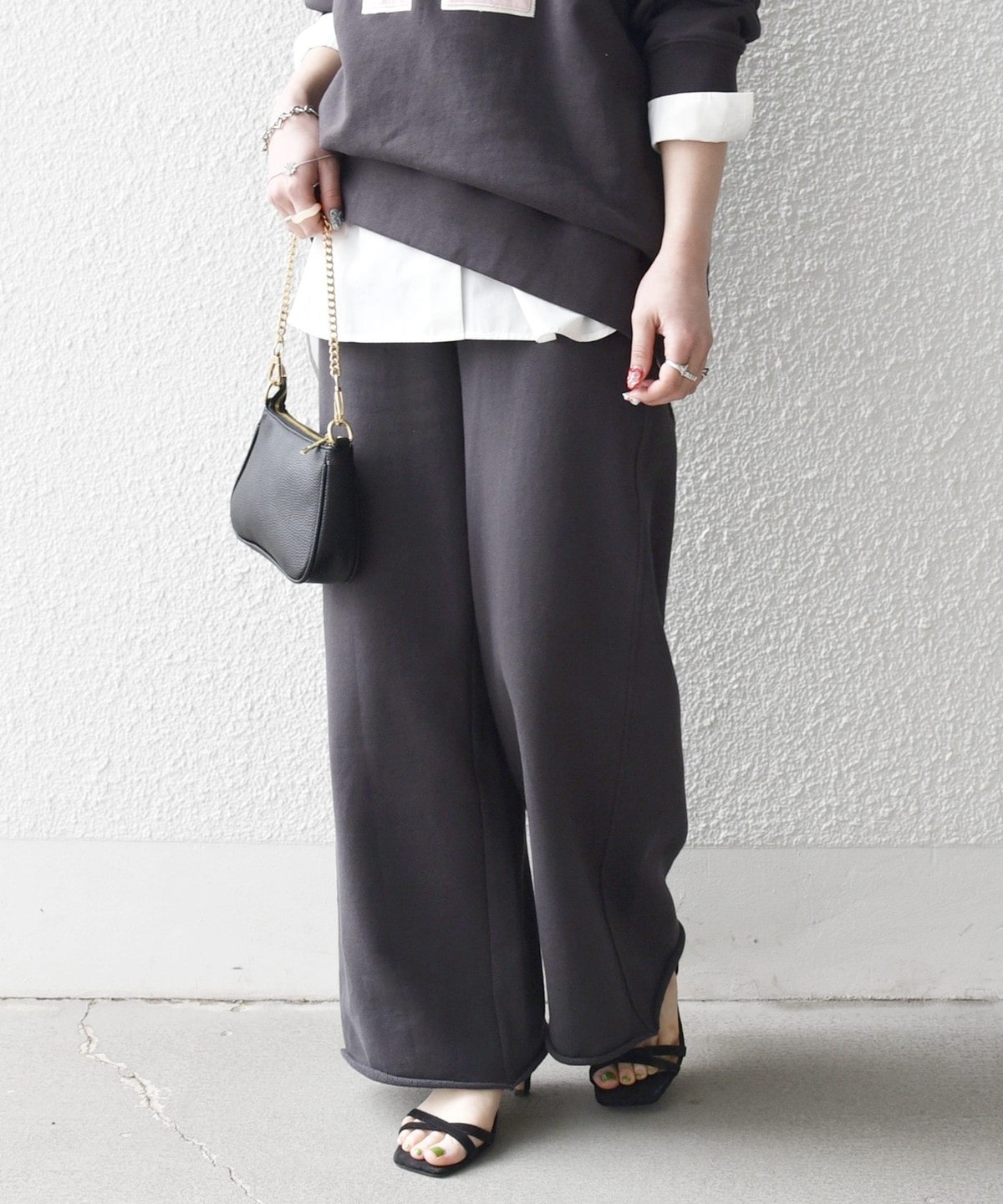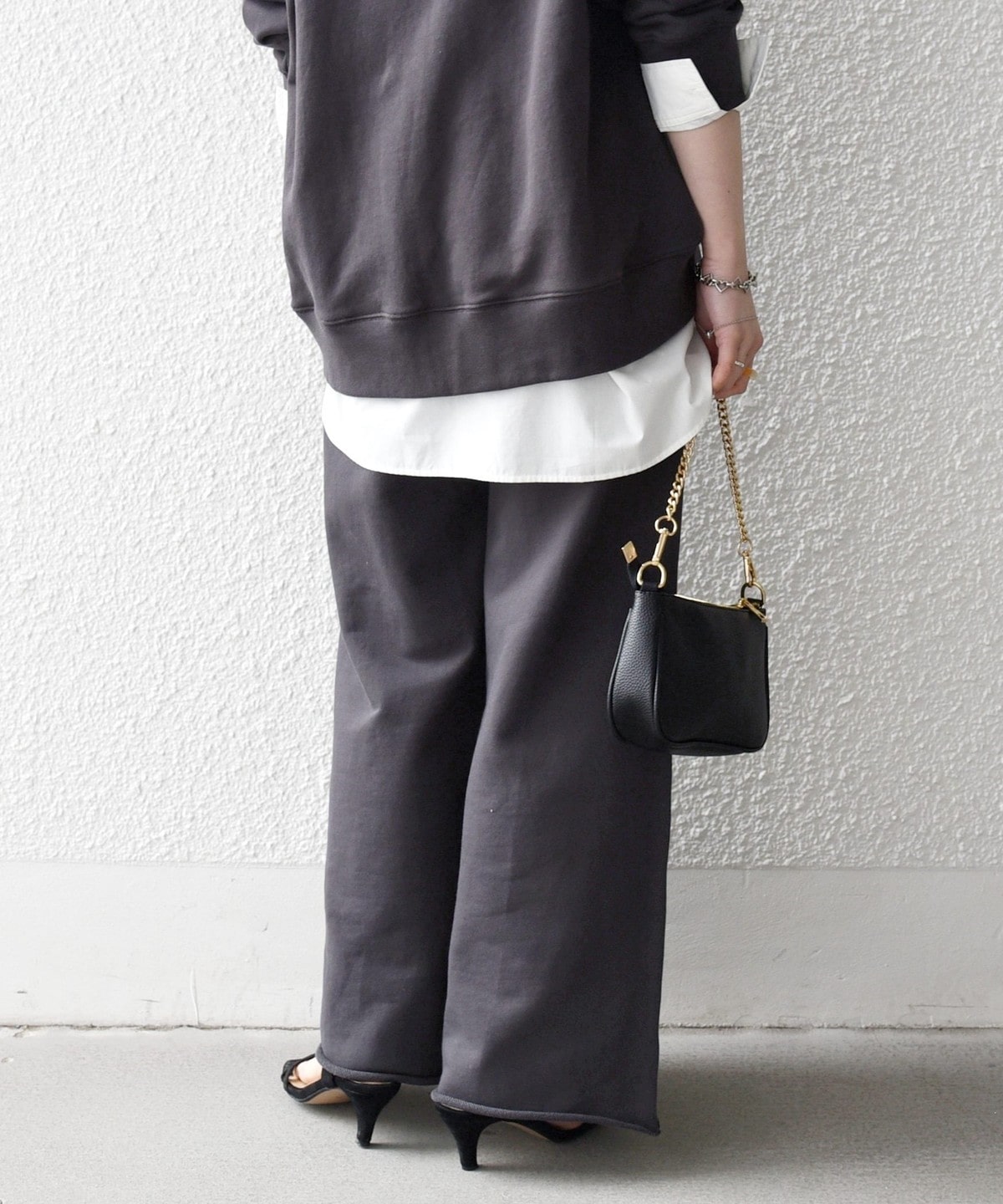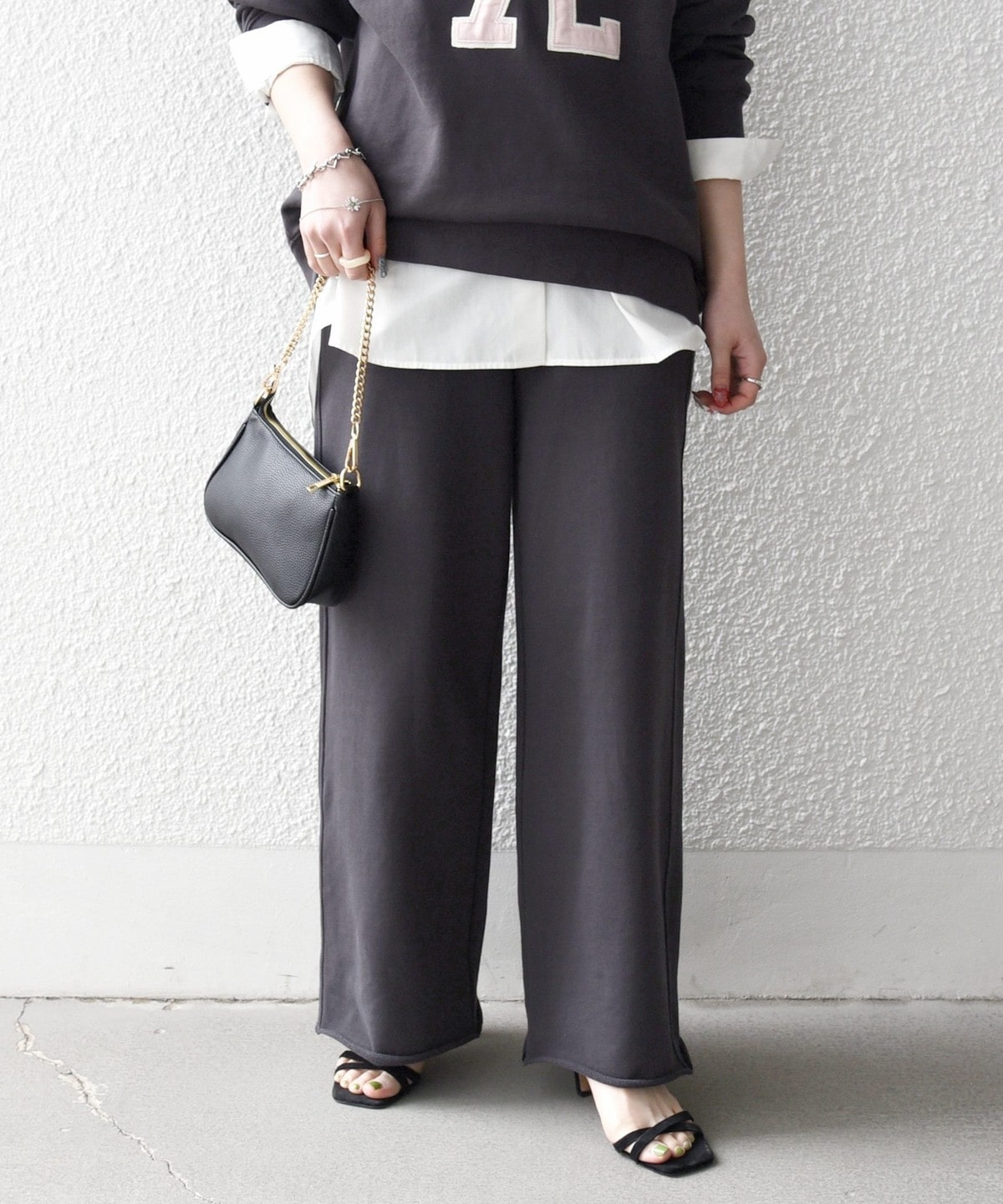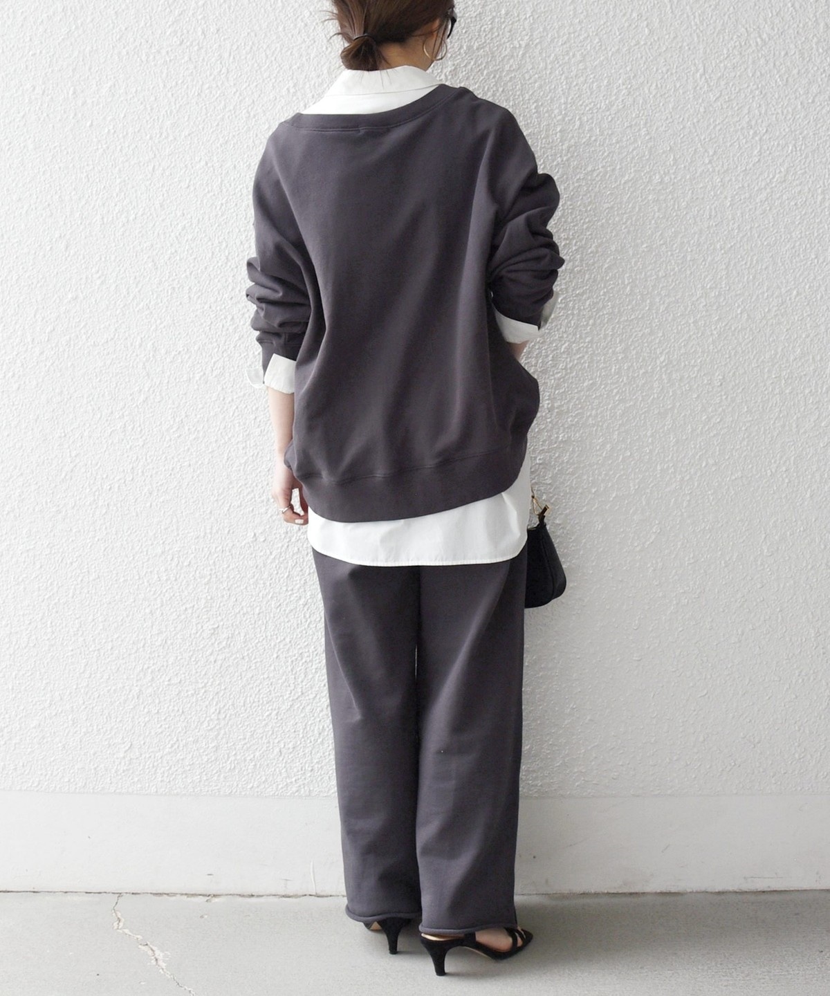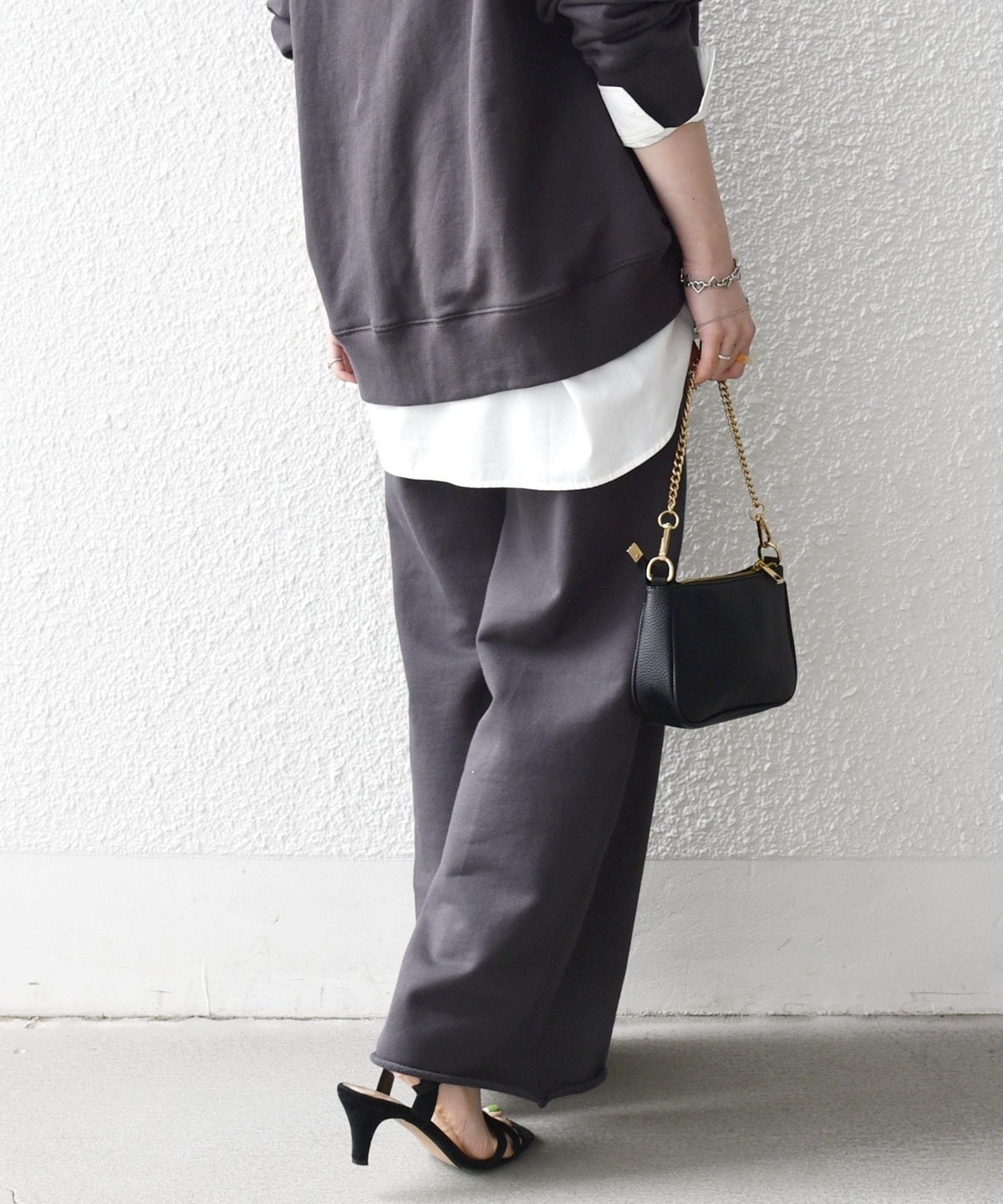 ラフなスウェットパンツも、大人っぽくバランスの取れたスタイリングを楽しめます。