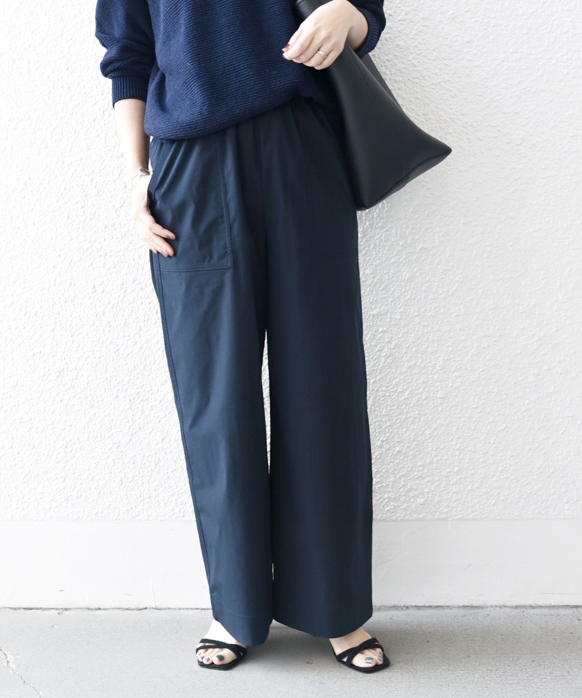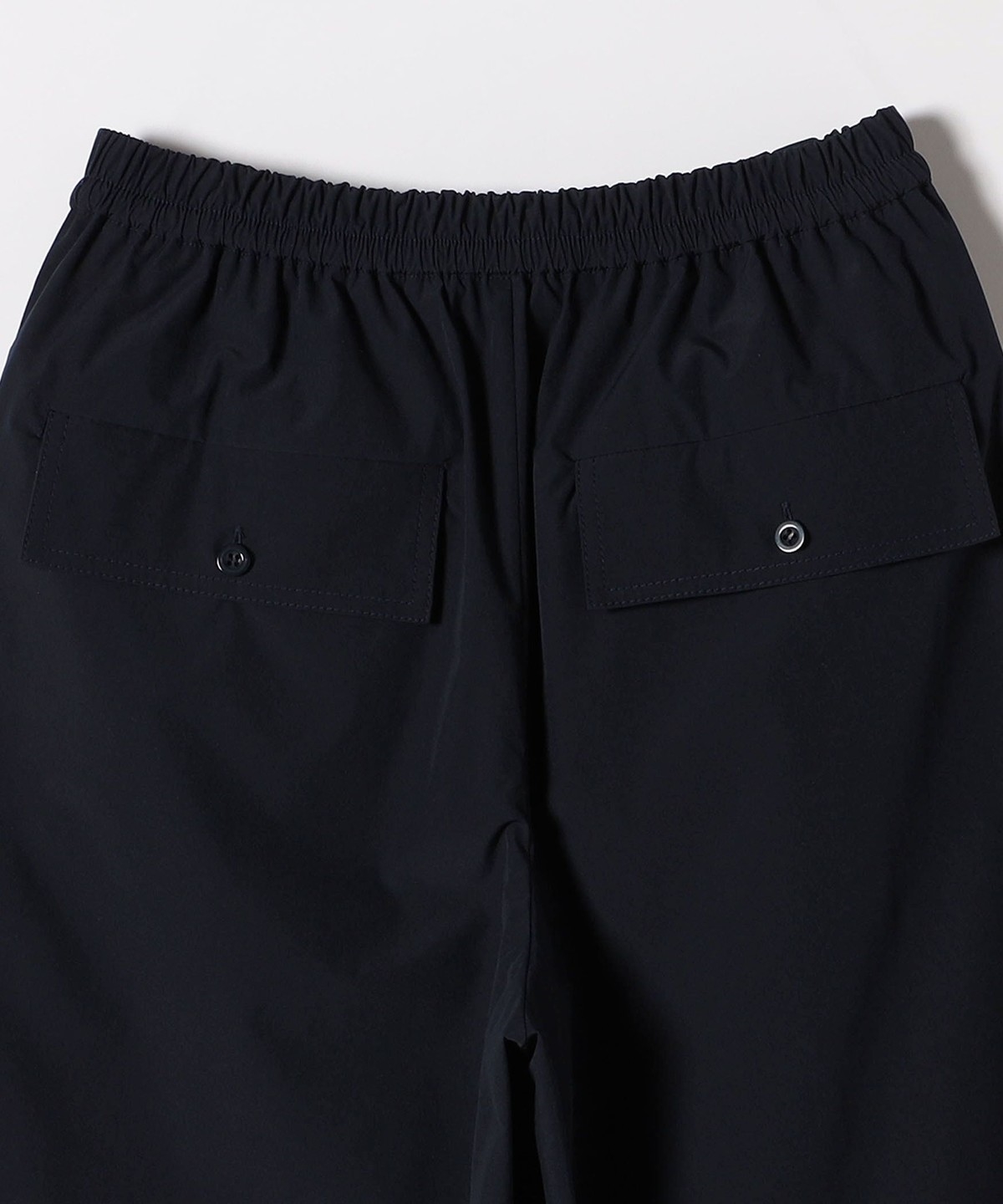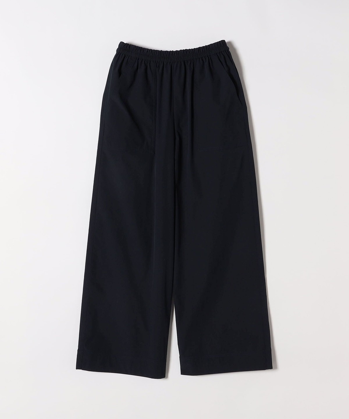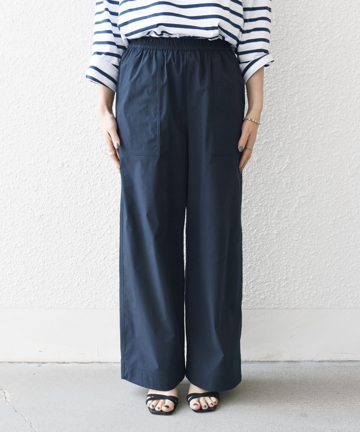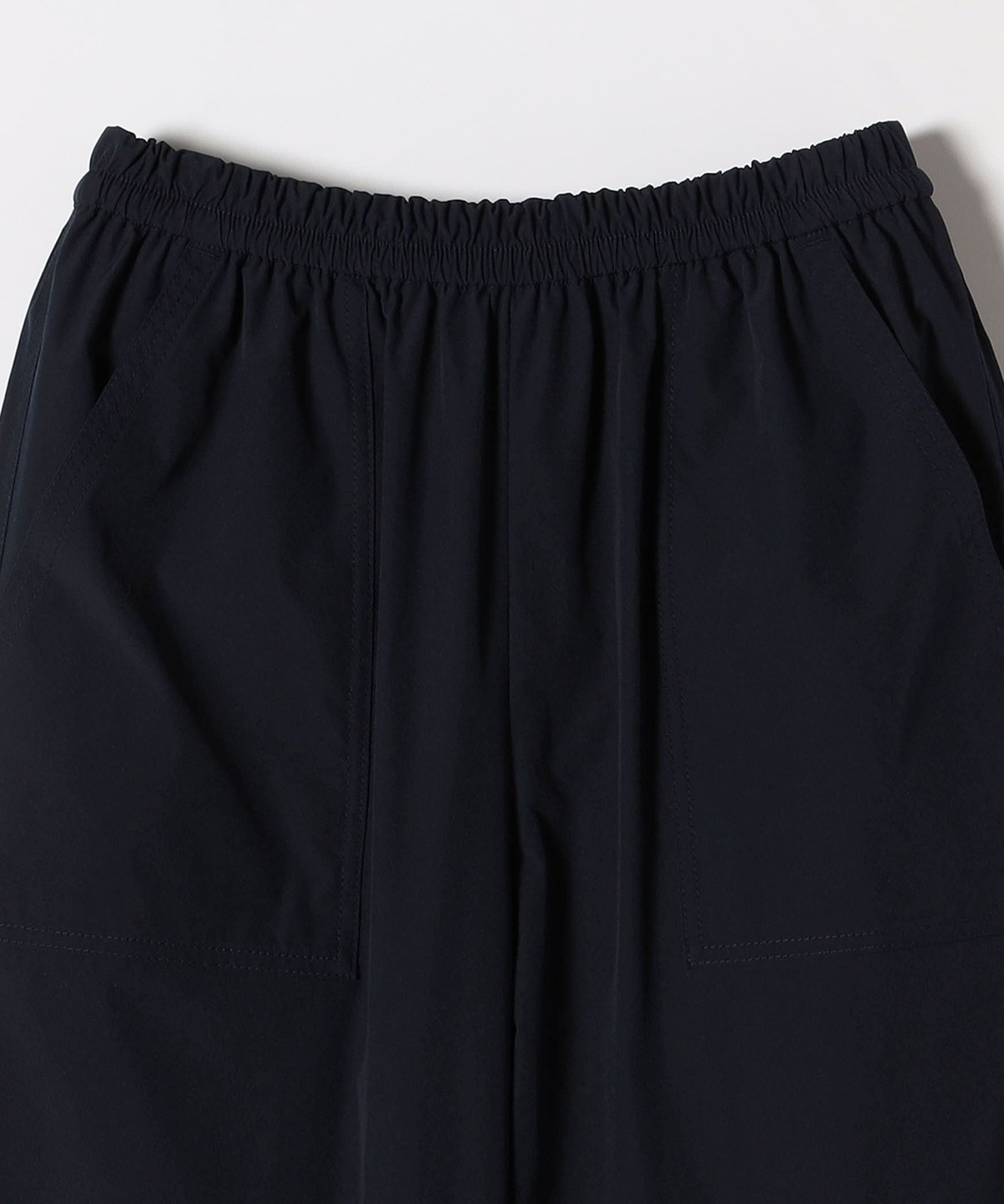 張りのある素材感ながら、ウエストは総ゴムで楽な穿き心地のイージーパンツ仕様。
