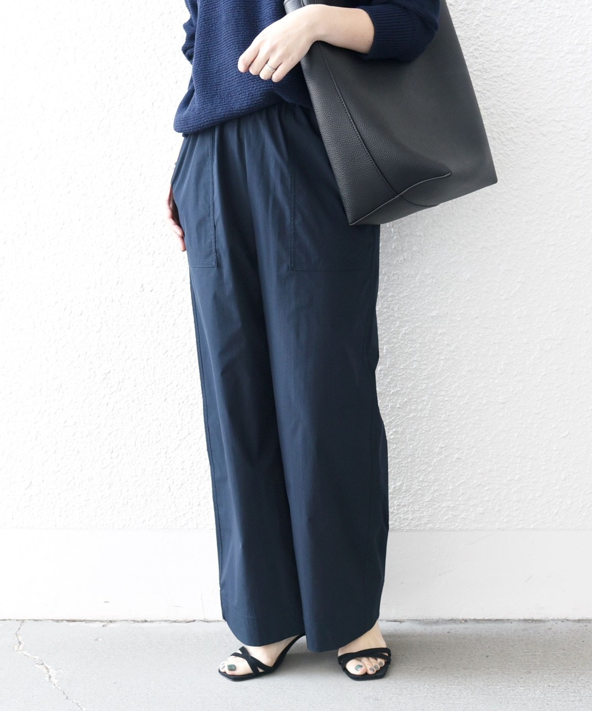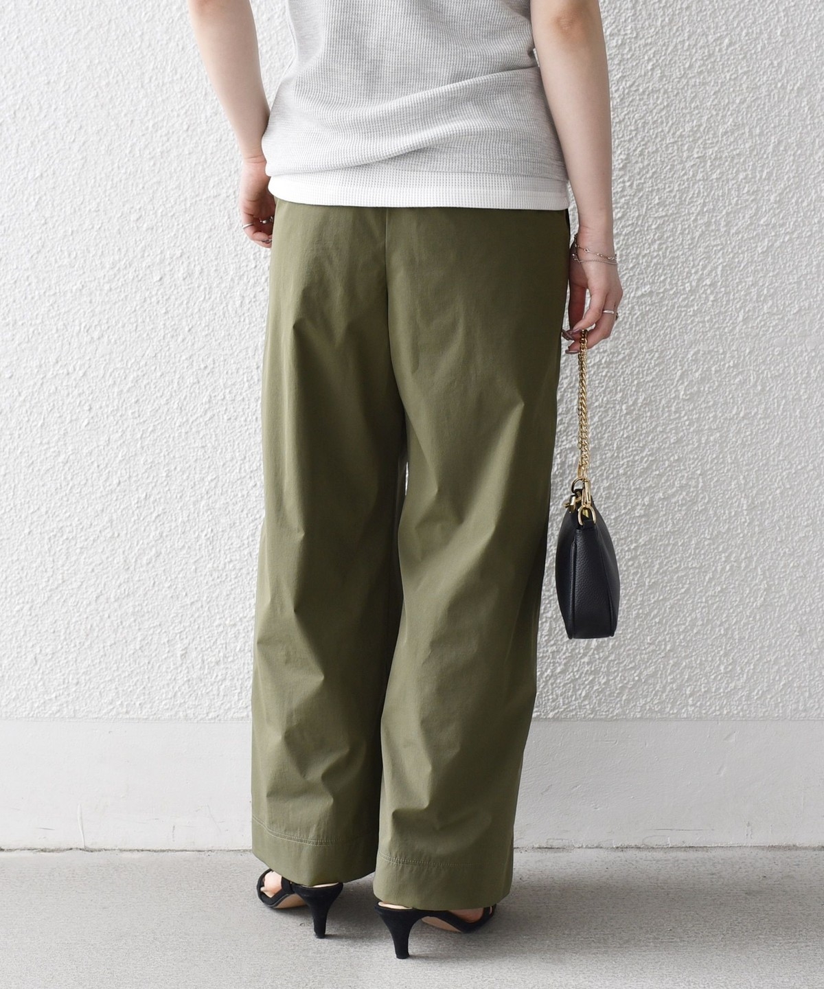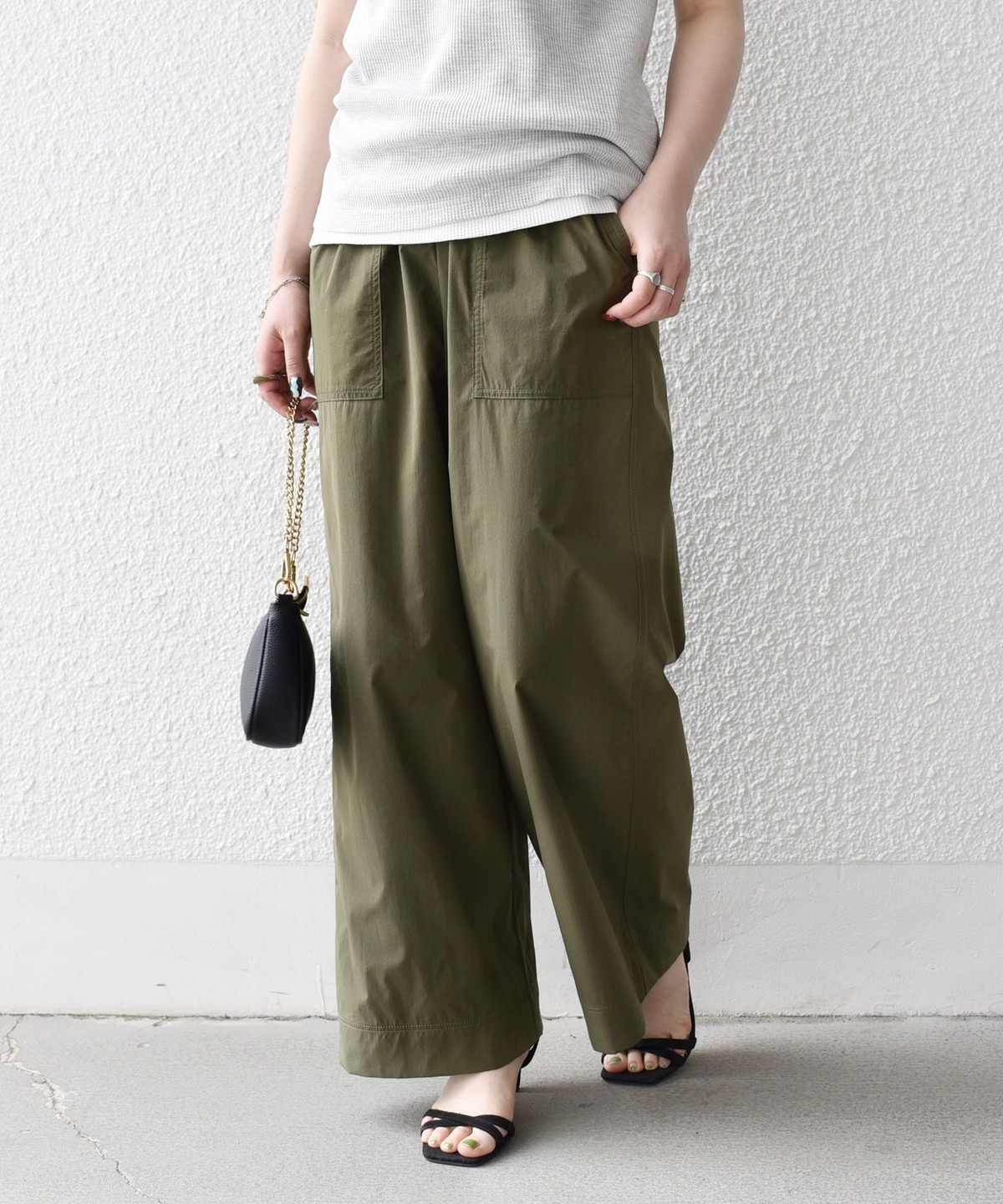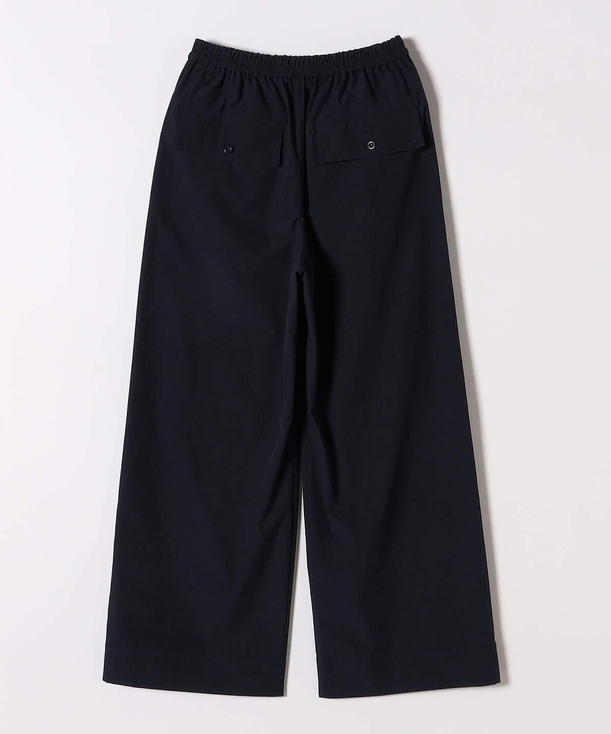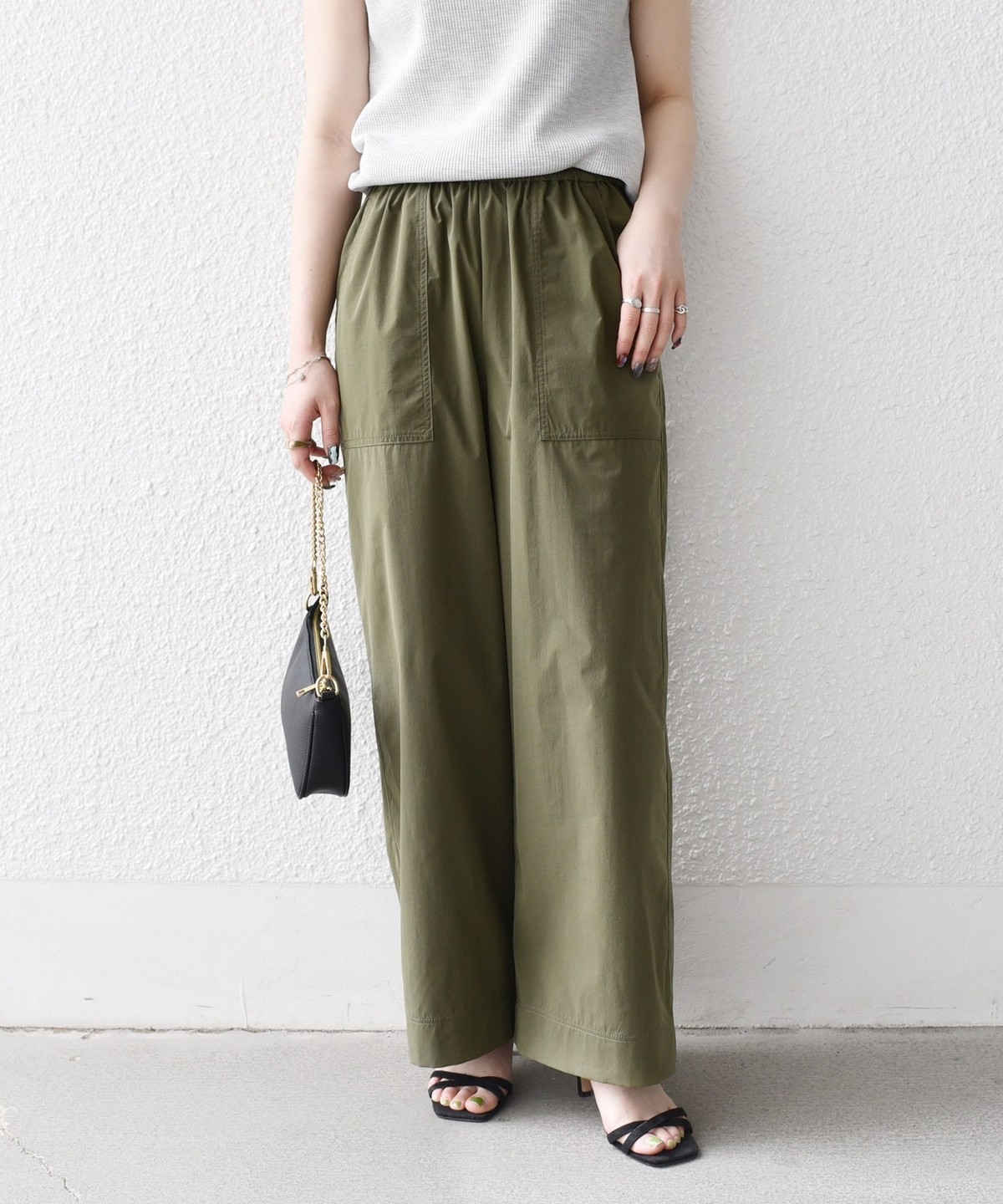 張りのある素材感ながら、ウエストは総ゴムで楽な穿き心地のイージーパンツ仕様。