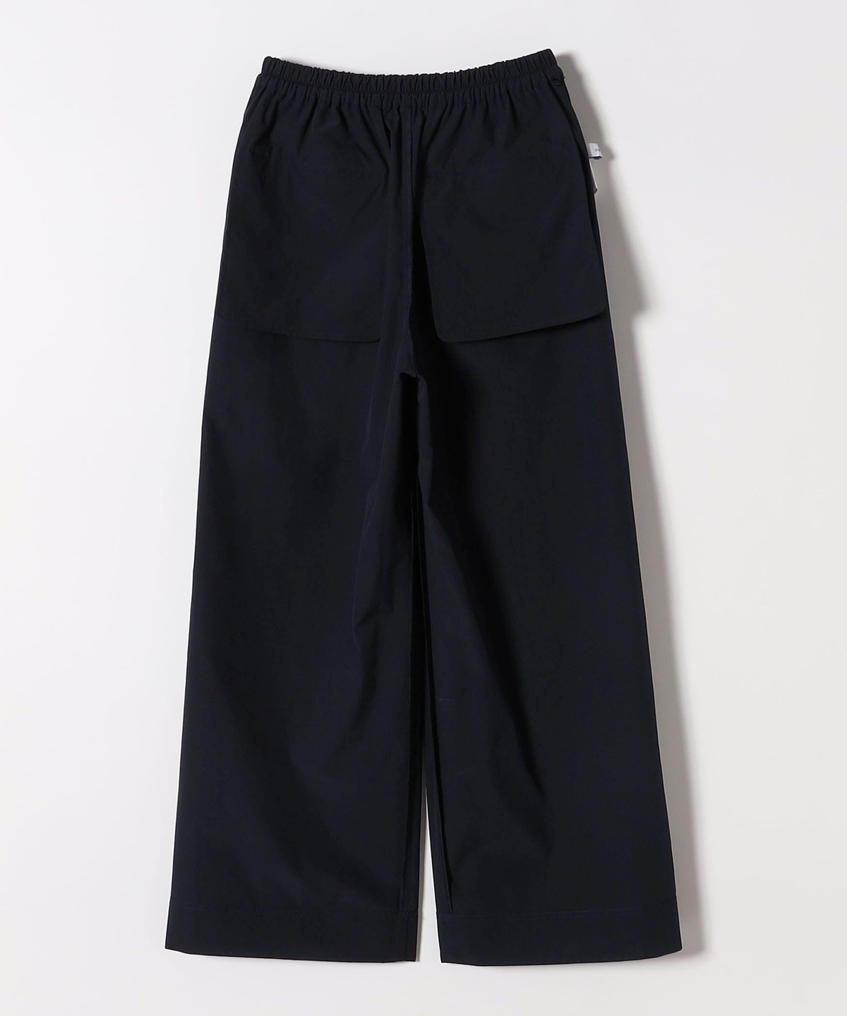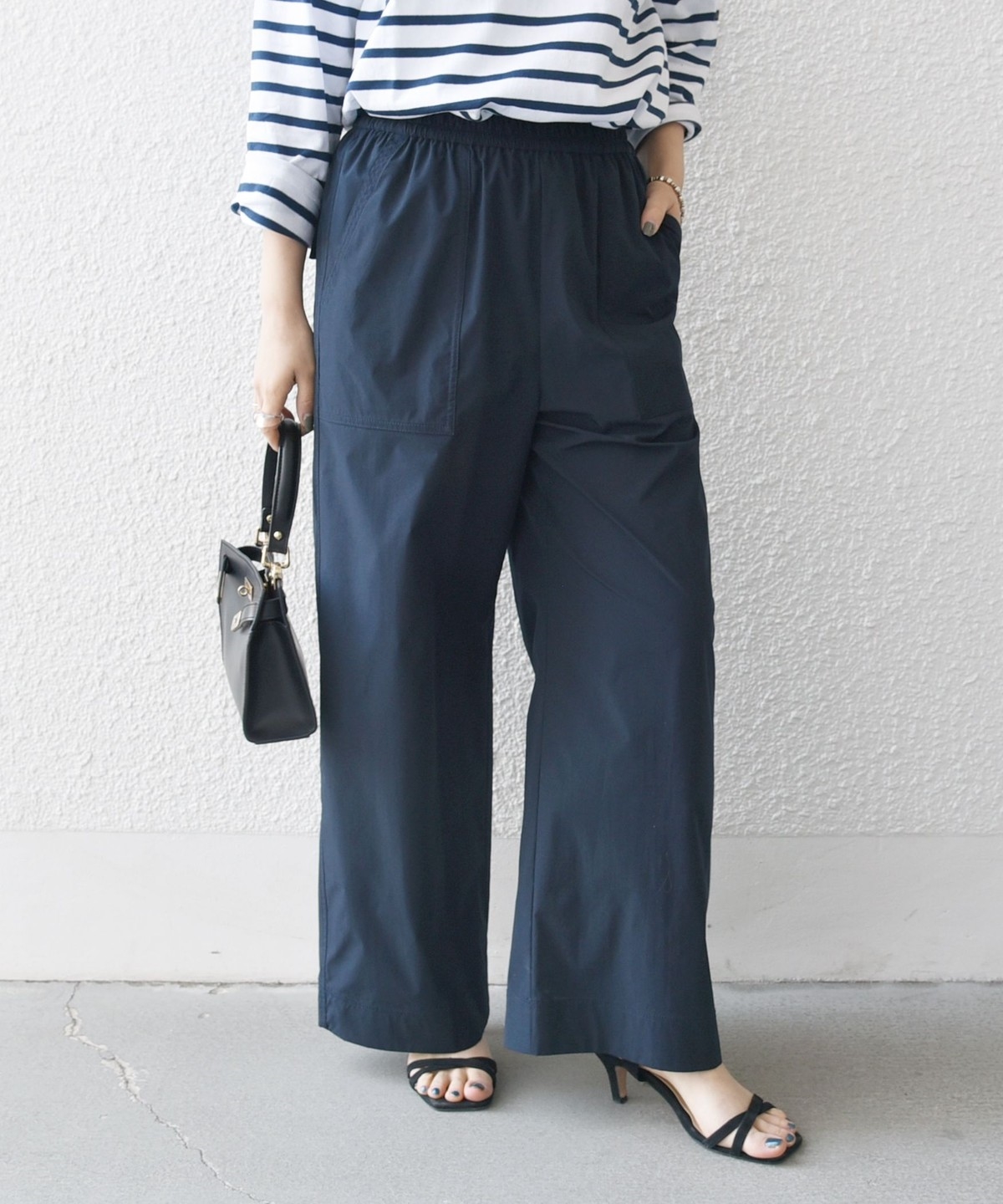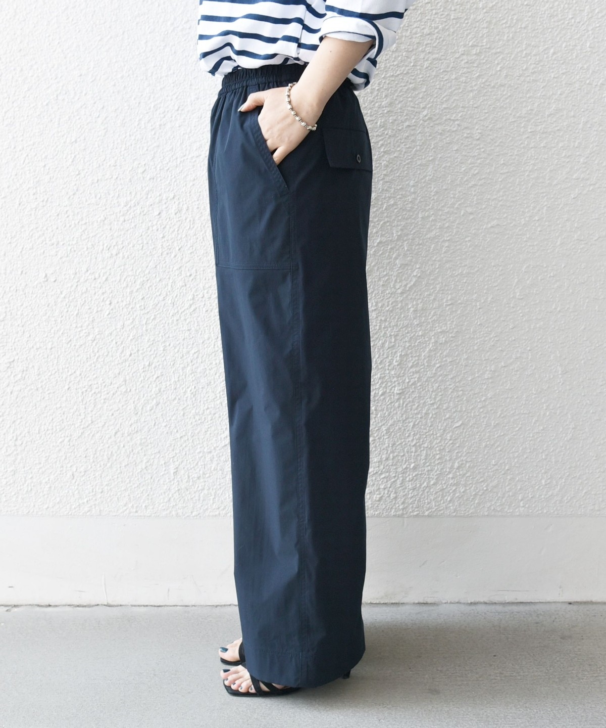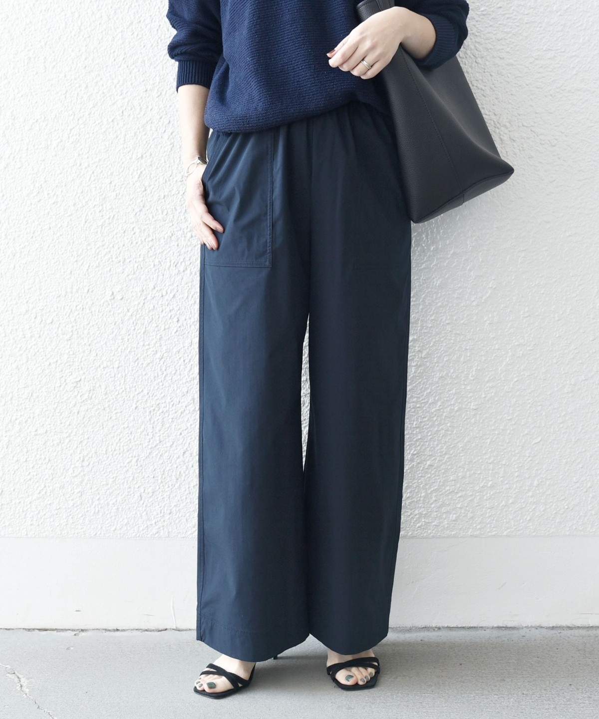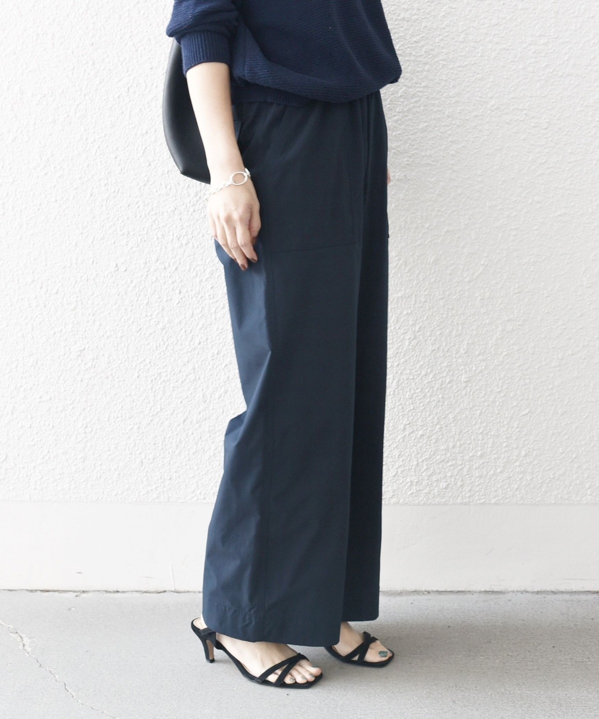 張りのある素材感ながら、ウエストは総ゴムで楽な穿き心地のイージーパンツ仕様。