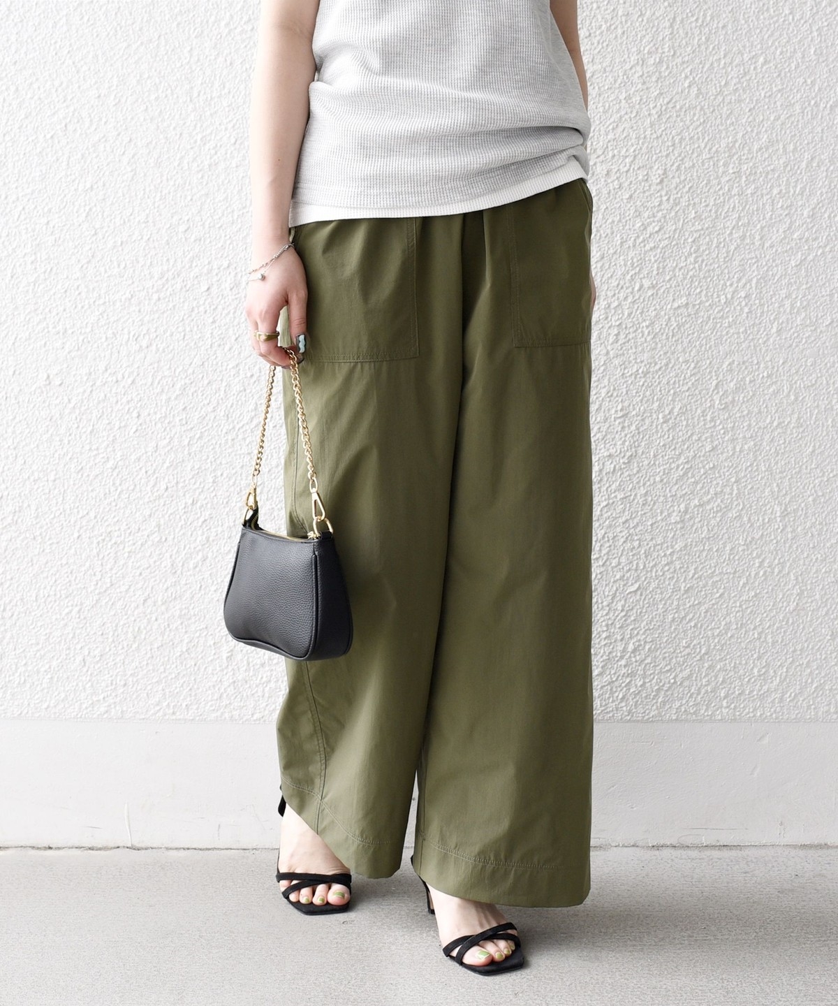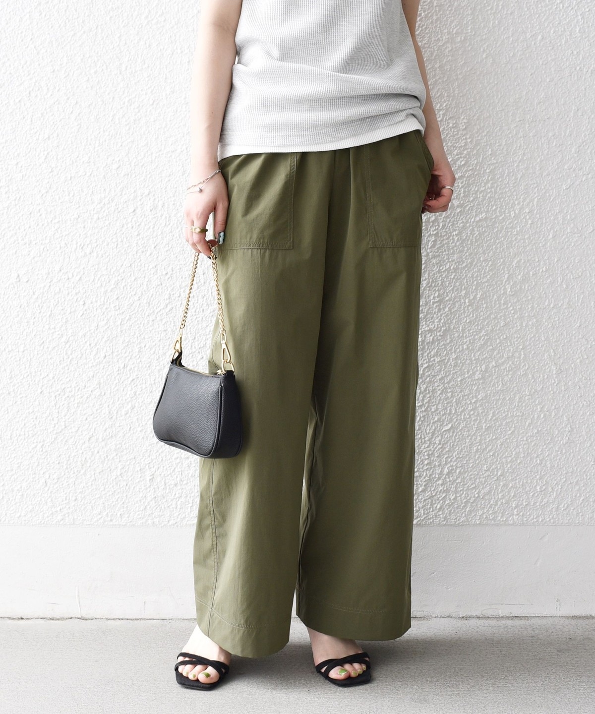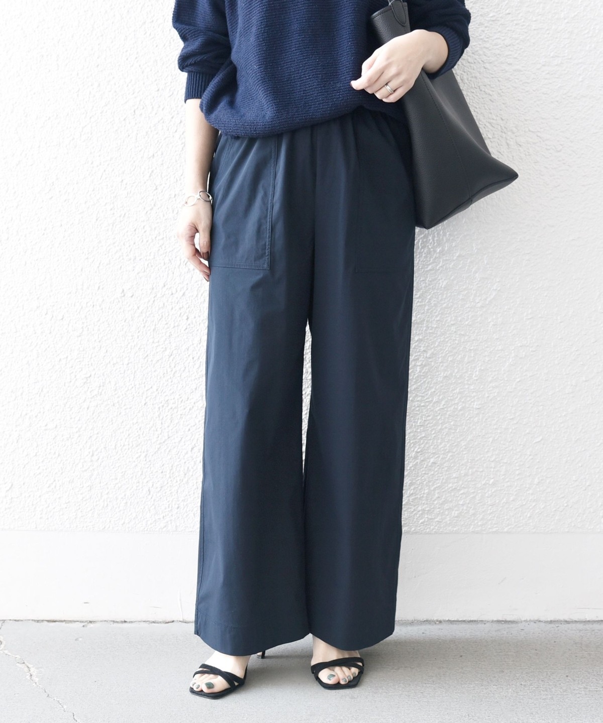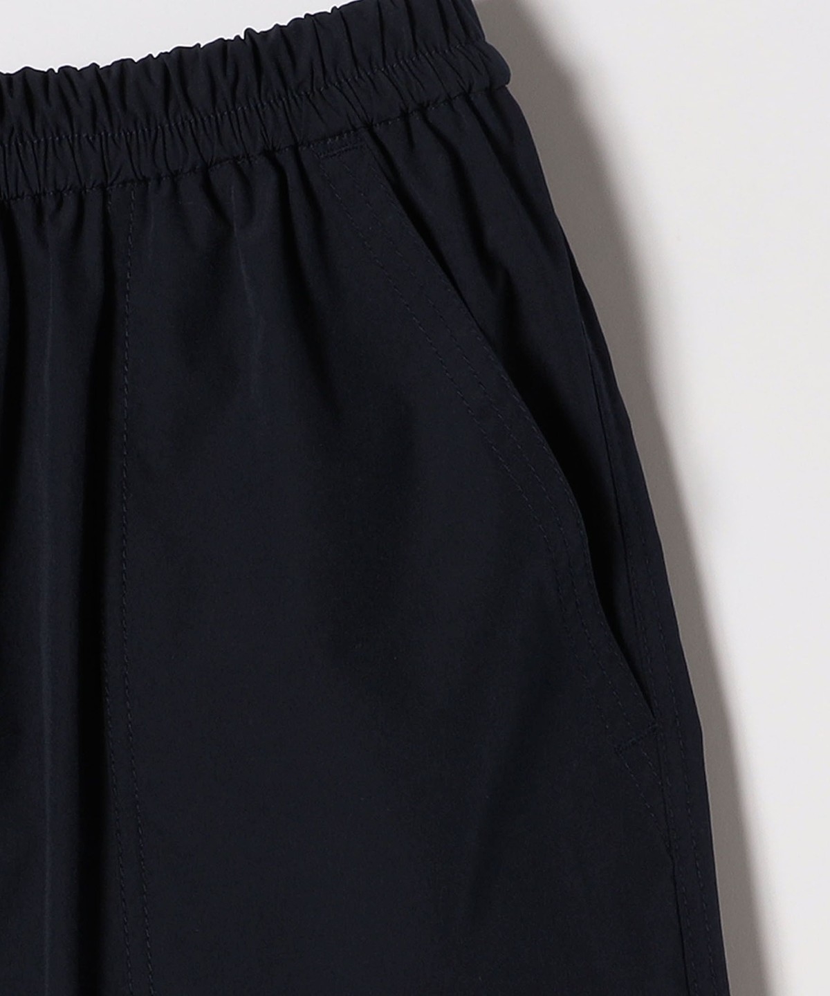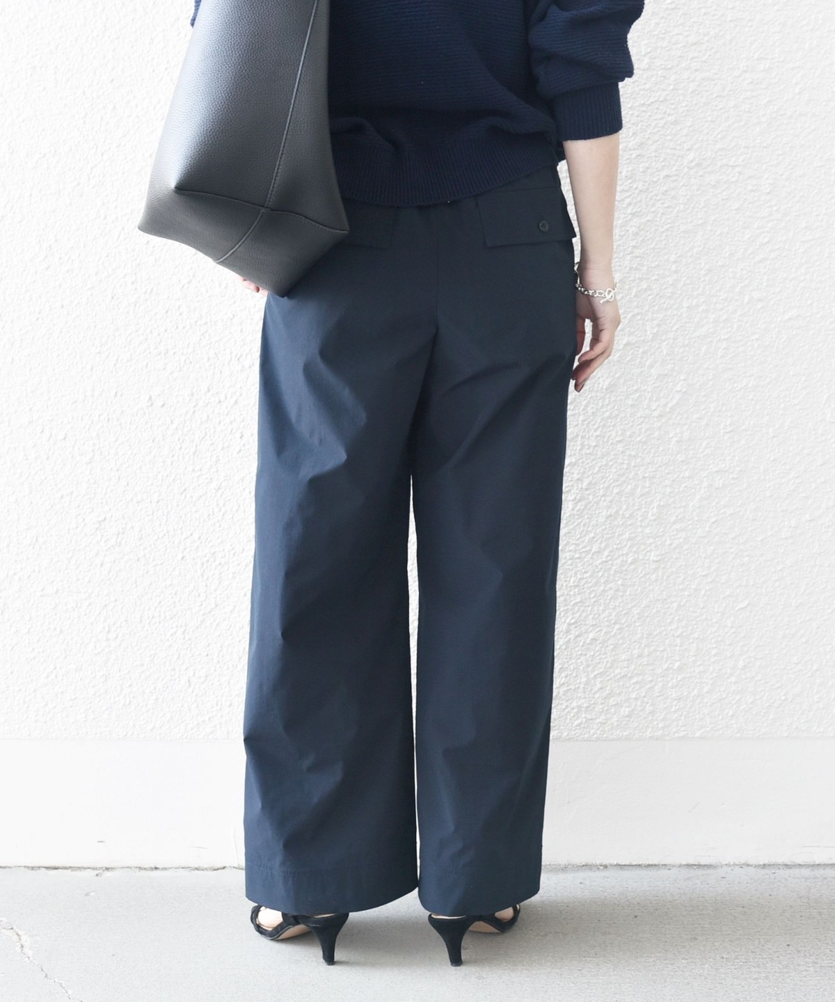 張りのある素材感ながら、ウエストは総ゴムで楽な穿き心地のイージーパンツ仕様。