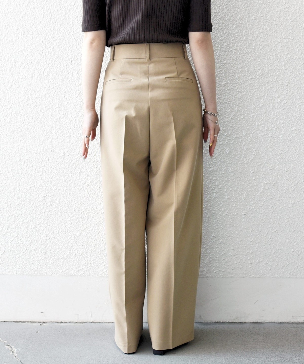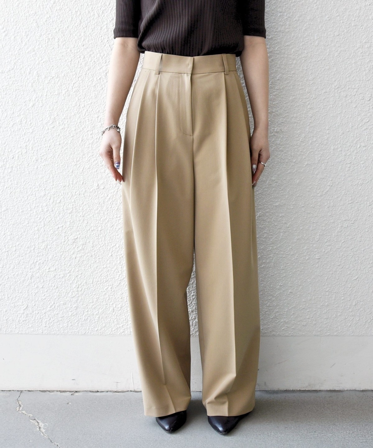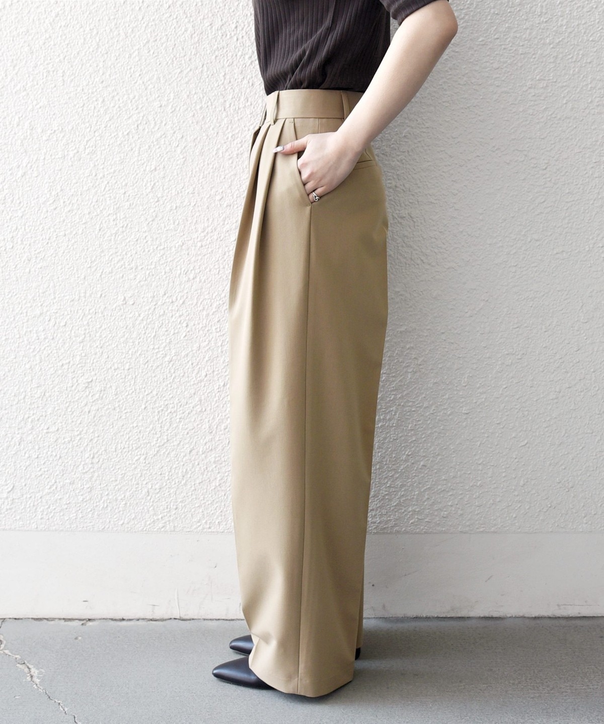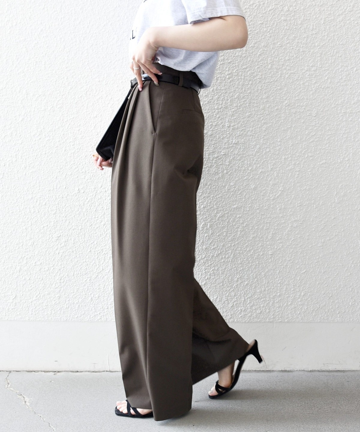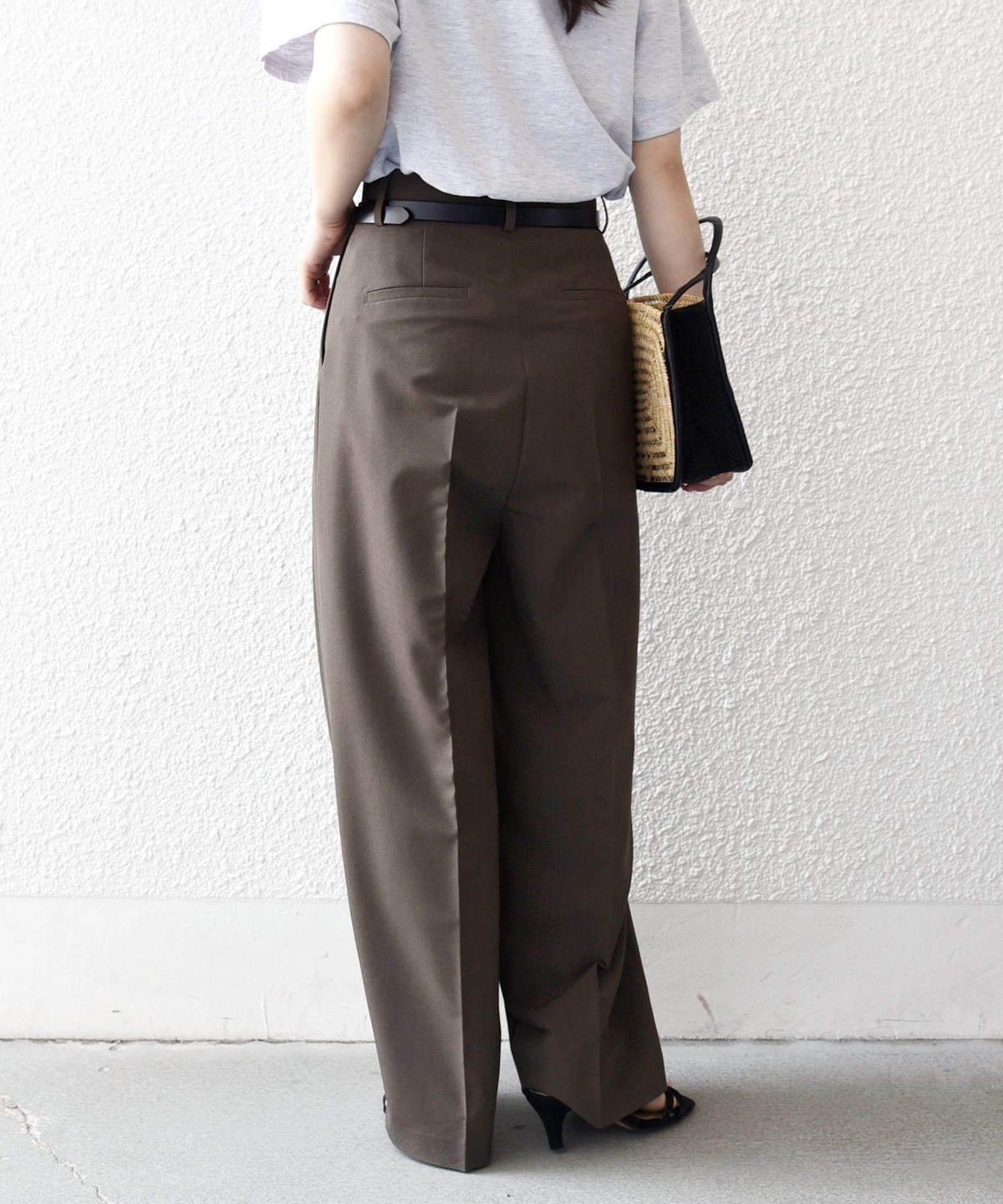 やや太めのベルト幅と2タックのワイドシルエットでマニッシュな印象のトラウザー。
