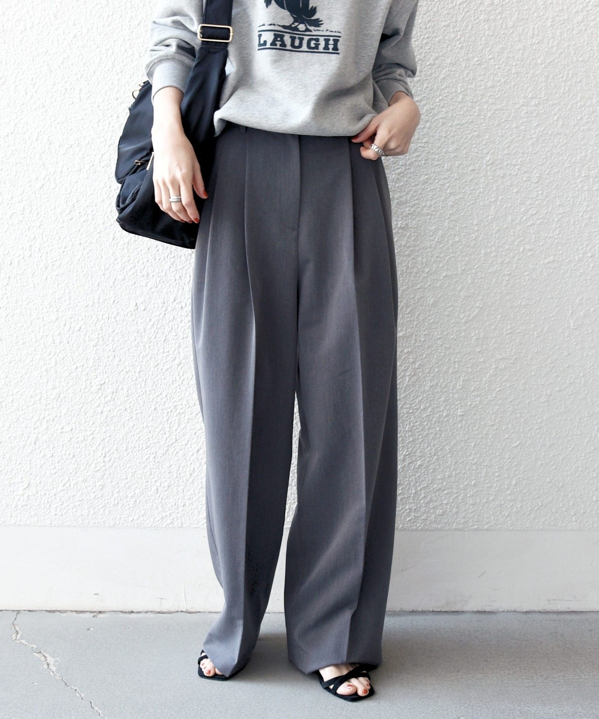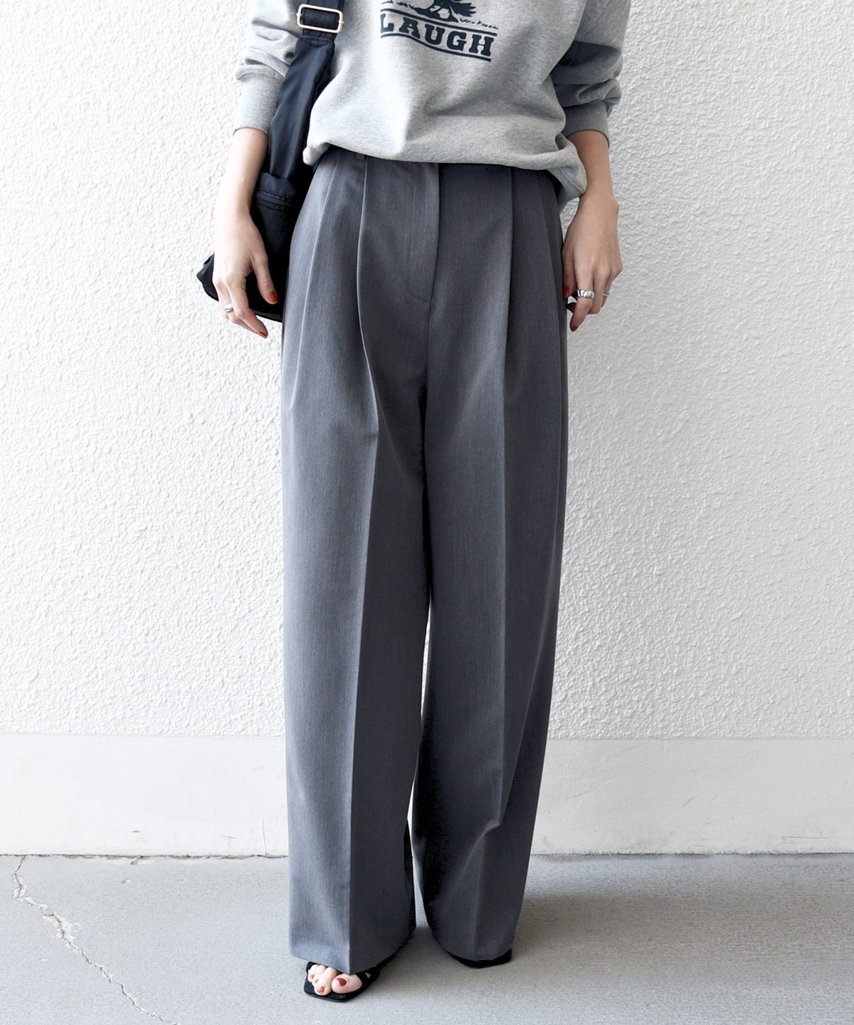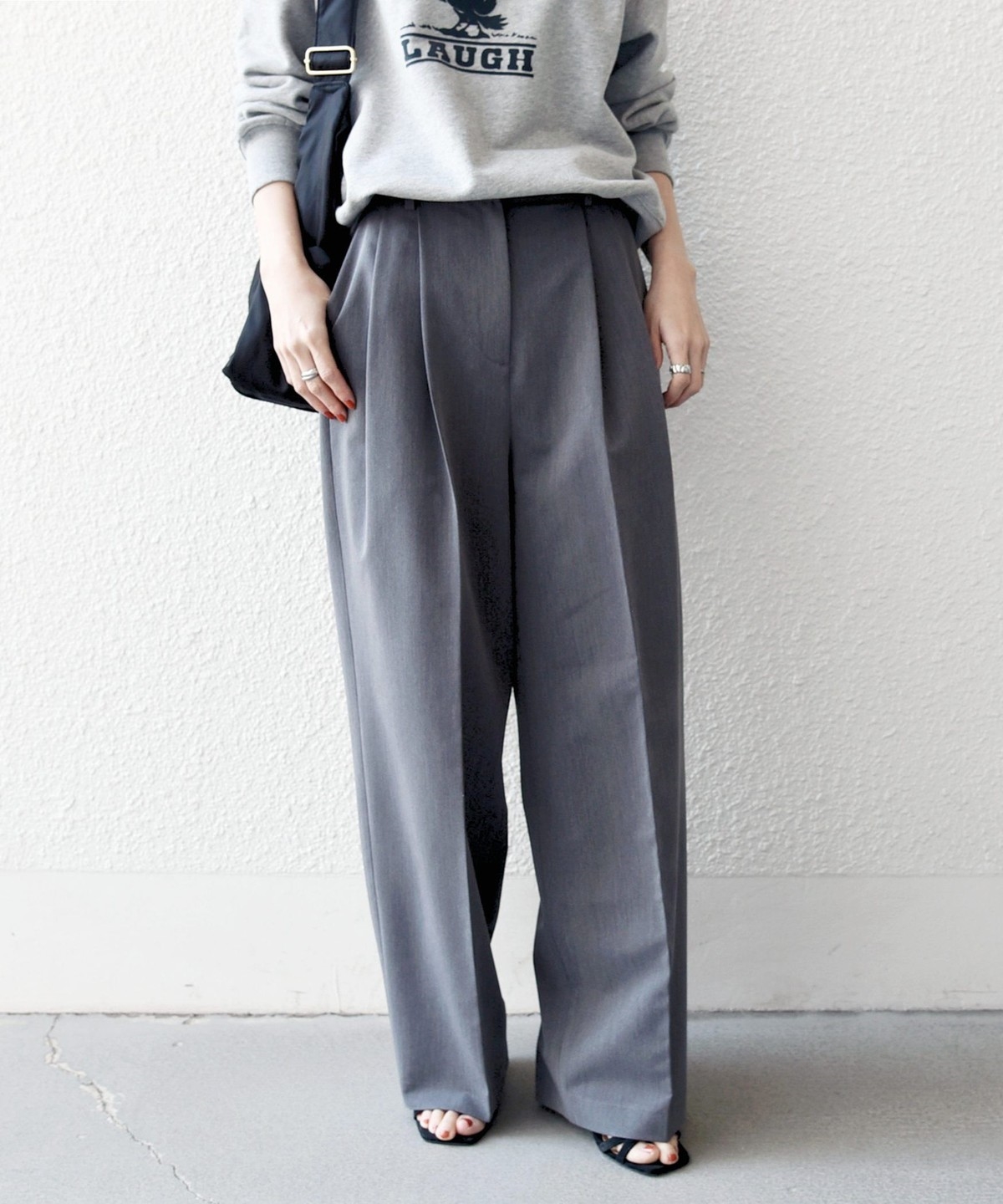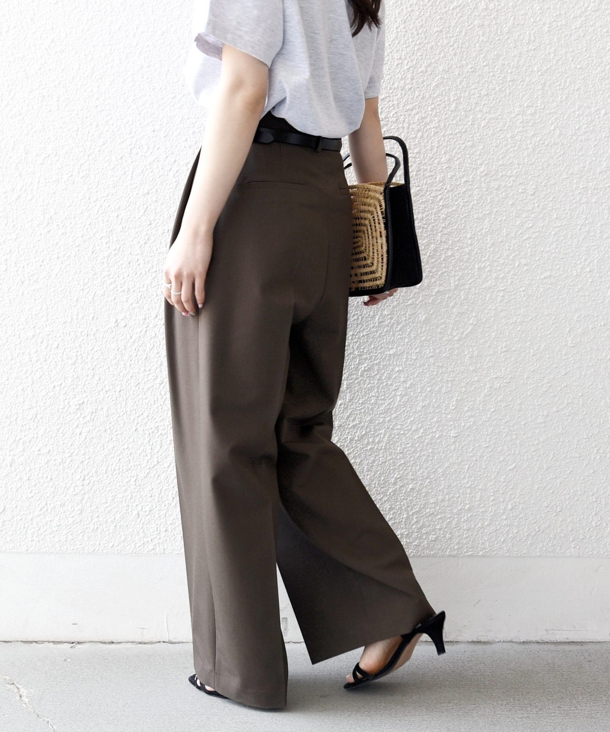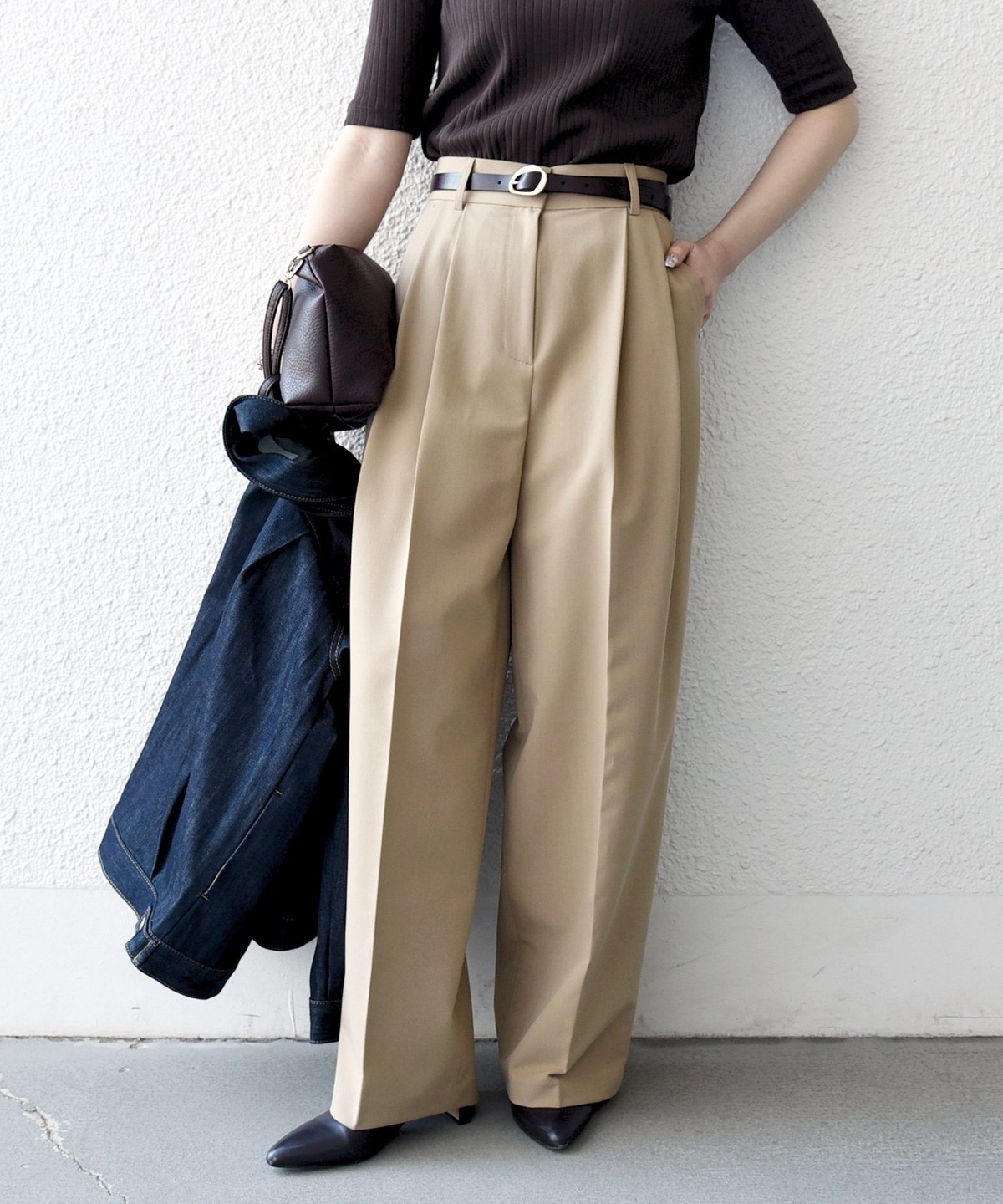 やや太めのベルト幅と2タックのワイドシルエットでマニッシュな印象のトラウザー。