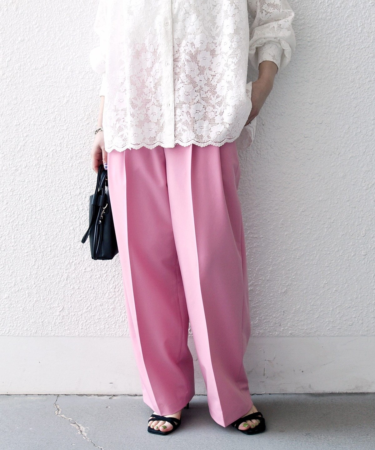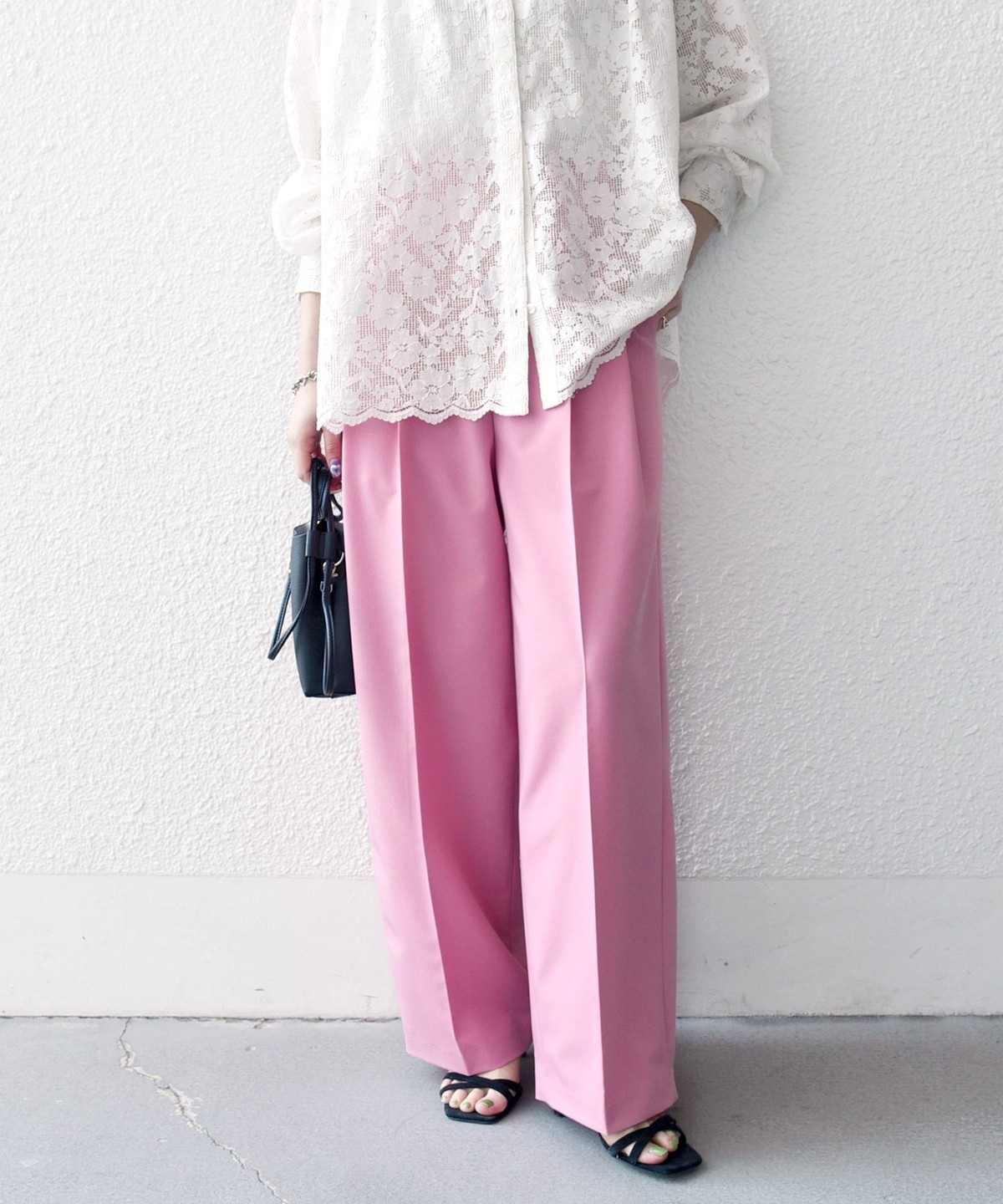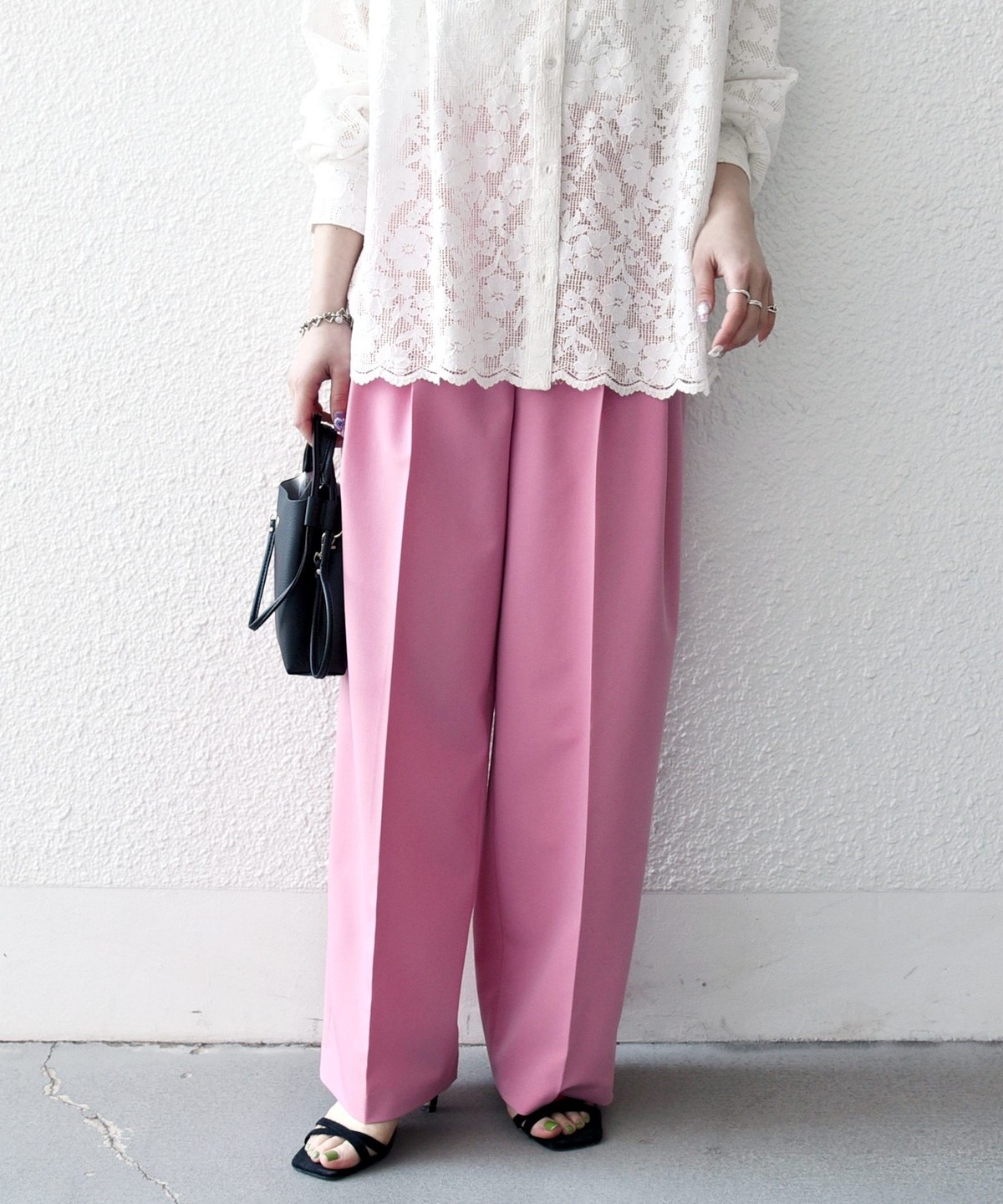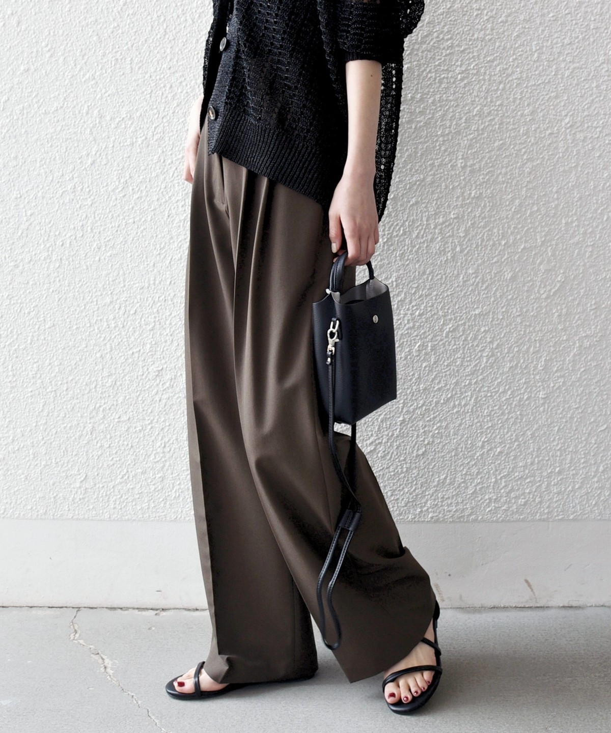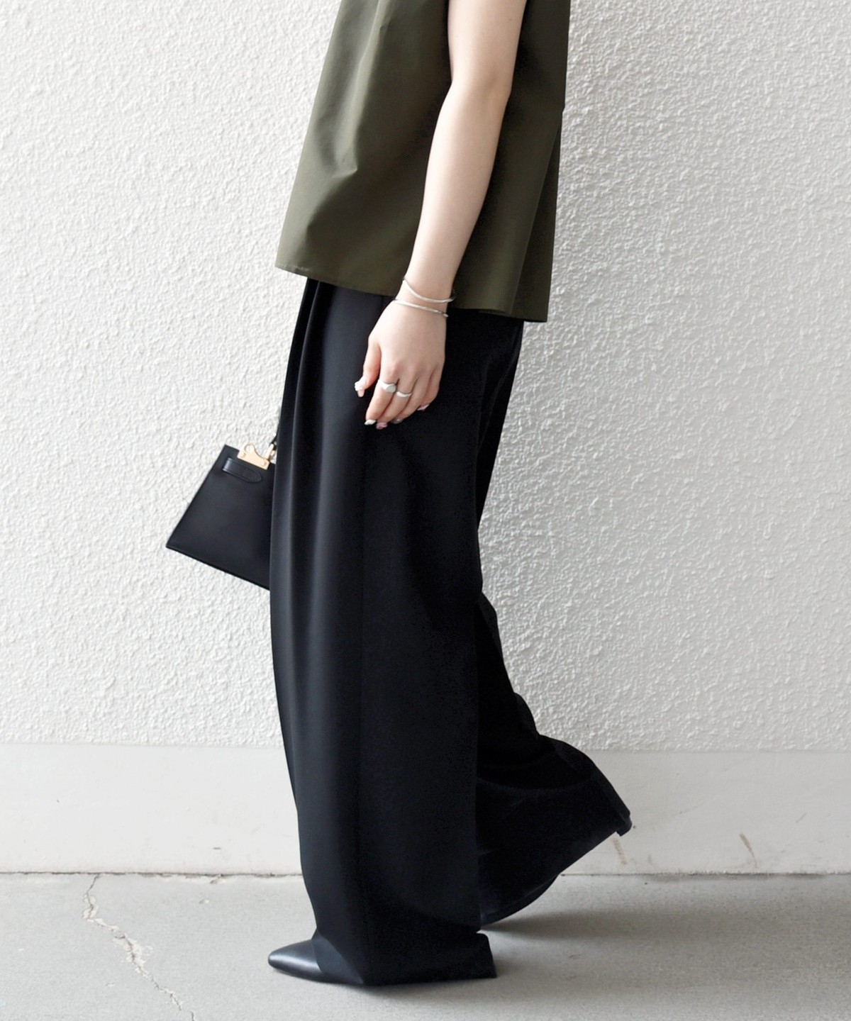 やや太めのベルト幅と2タックのワイドシルエットでマニッシュな印象のトラウザー。
