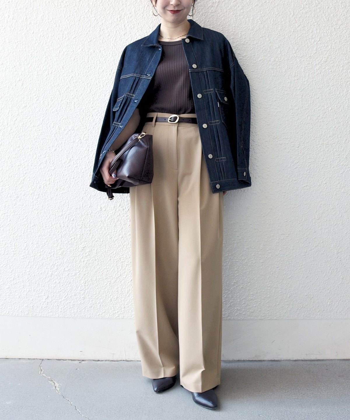 裾はストレートに落ちるシルエットなので、Aラインのトップスはアウトでもバランス良く着こなせます。