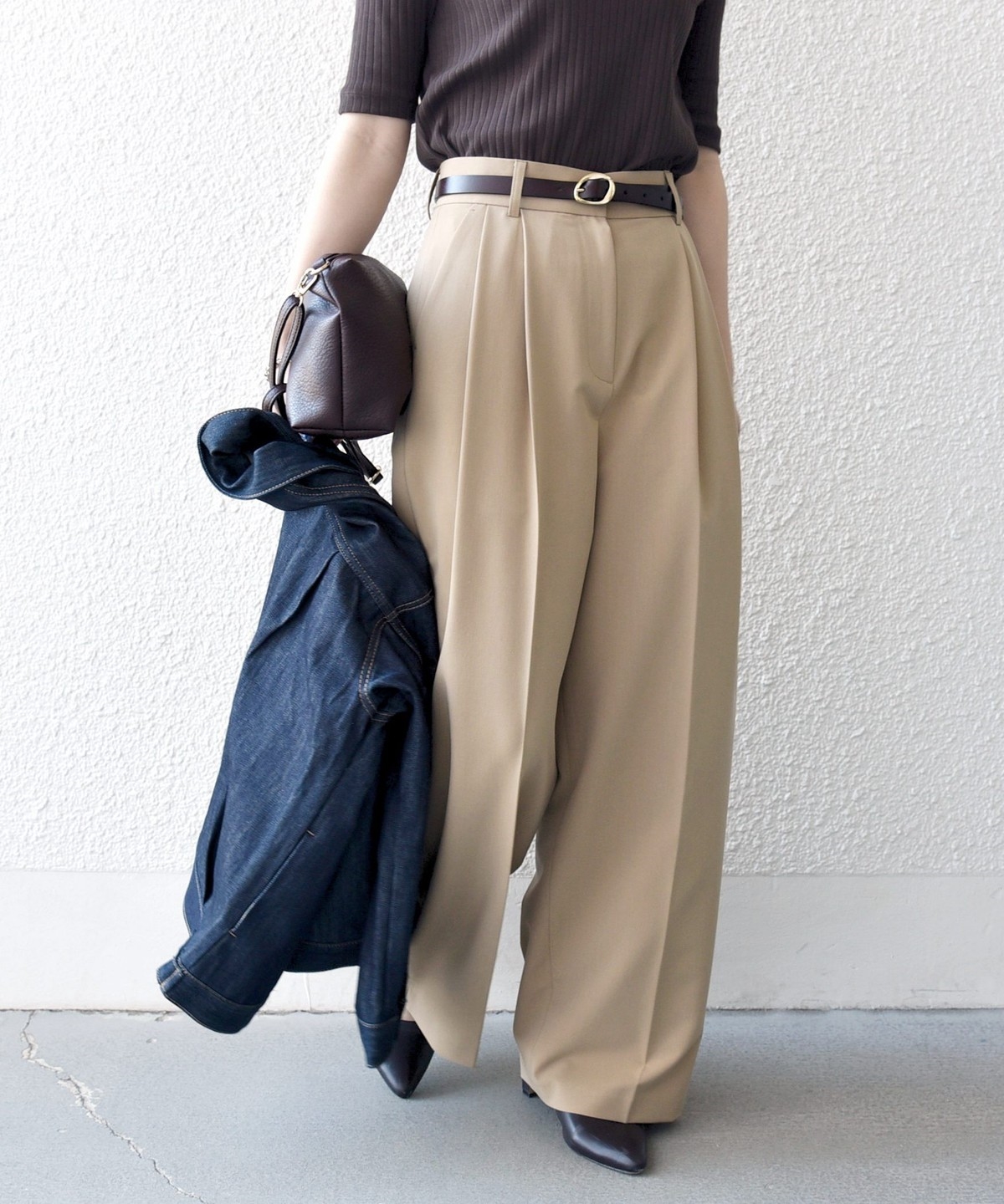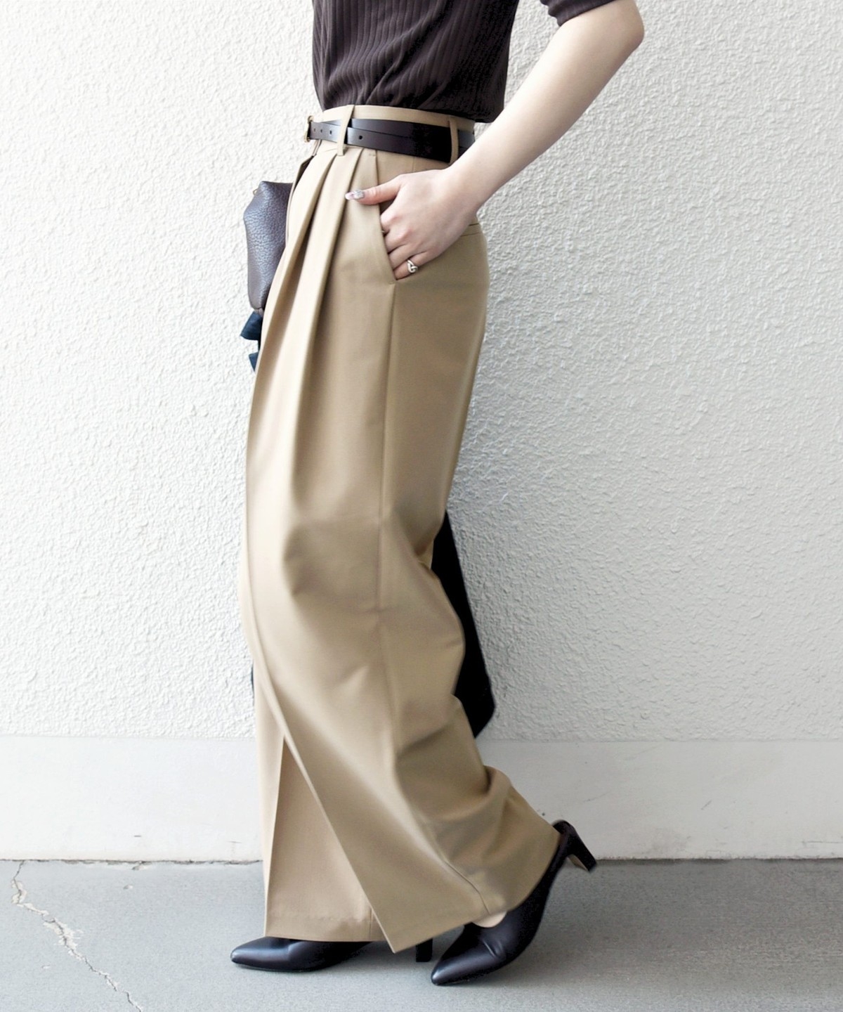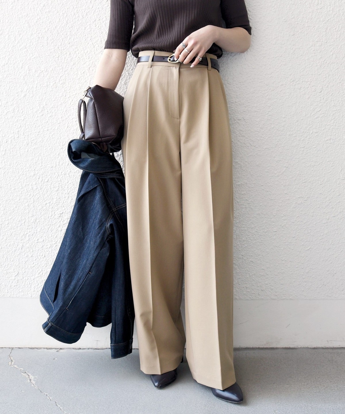 やや太めのベルト幅と2タックのワイドシルエットでマニッシュな印象のトラウザー。