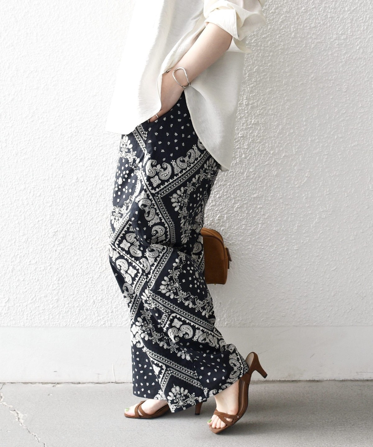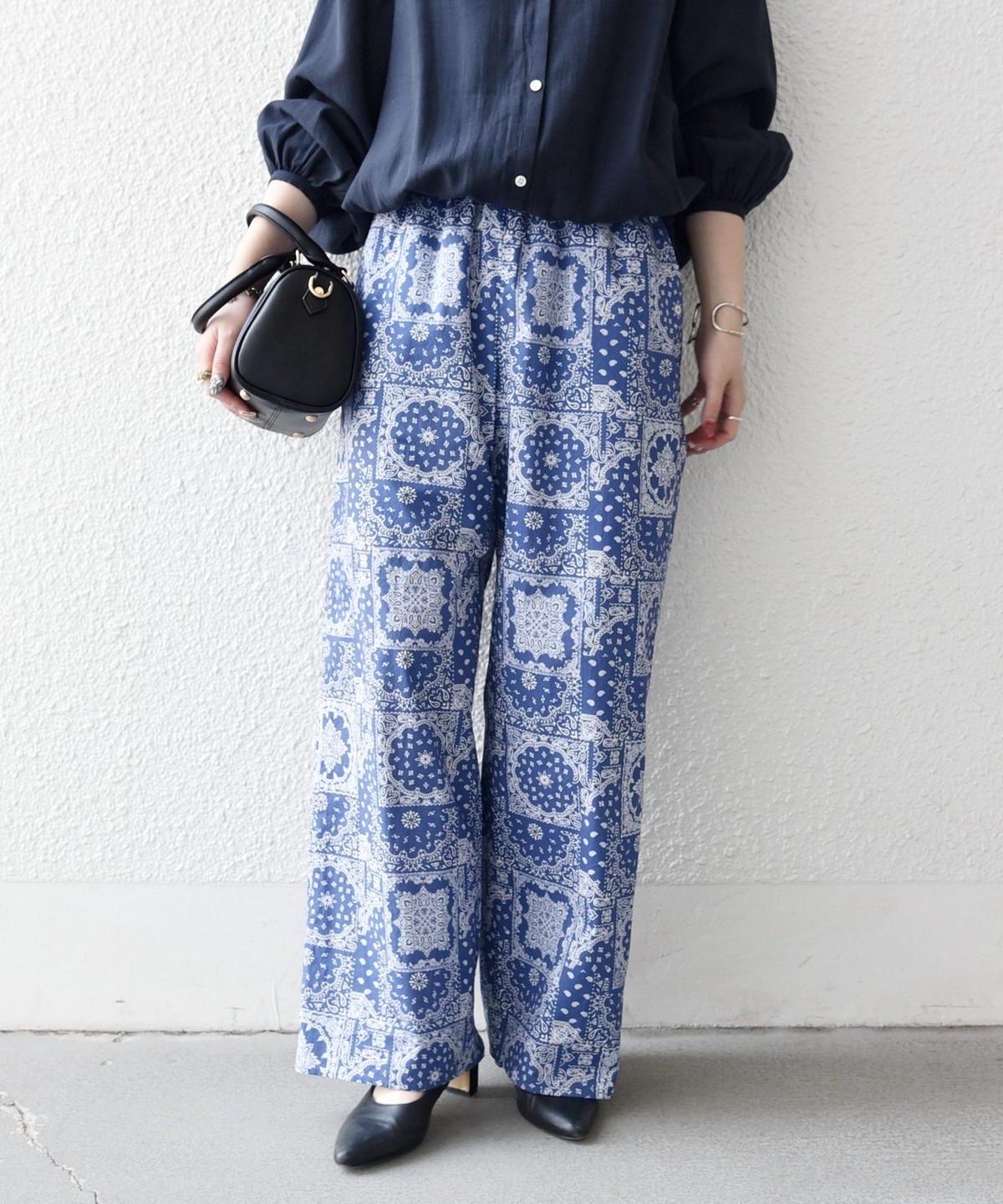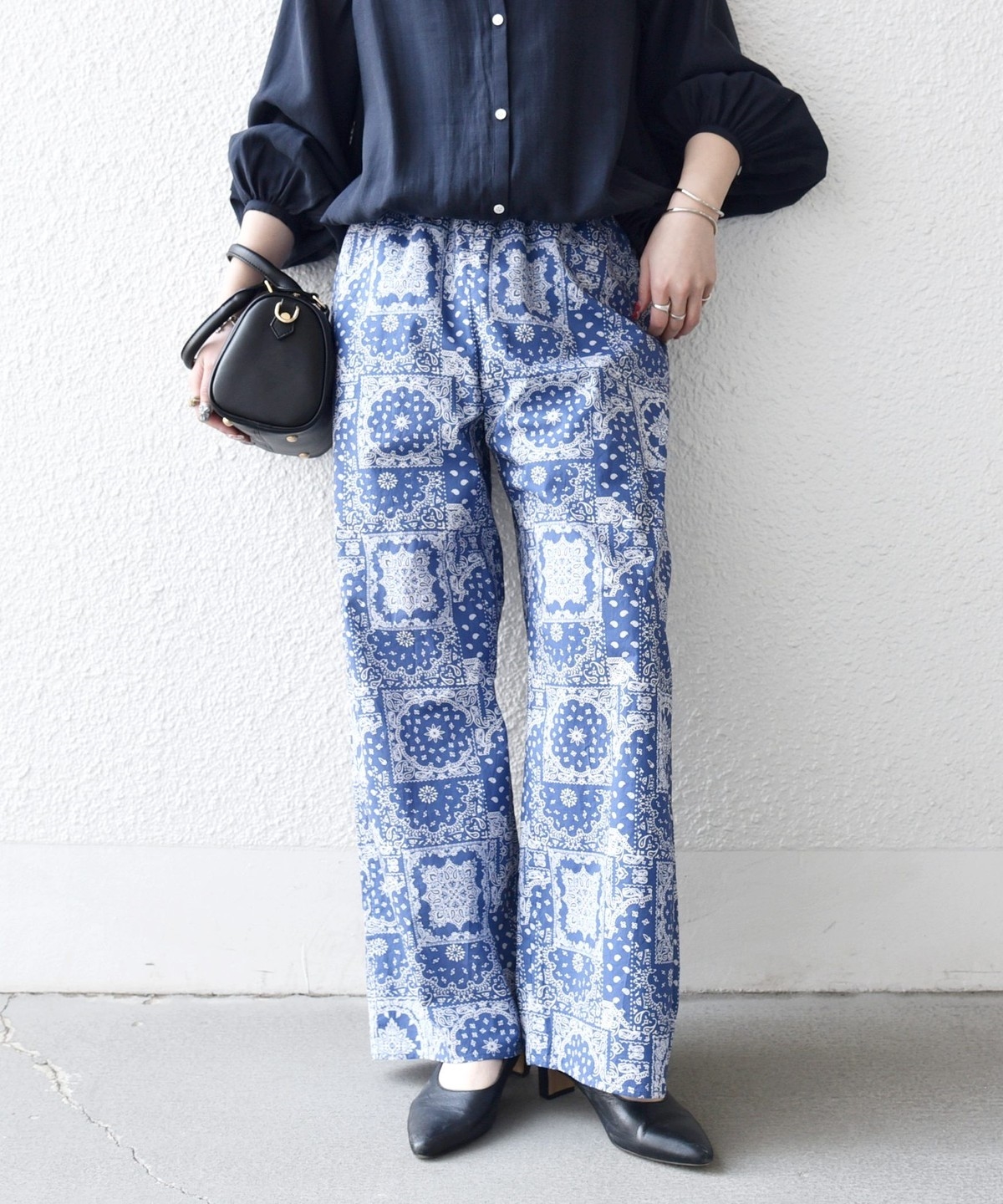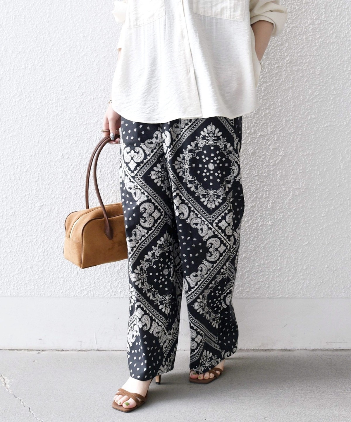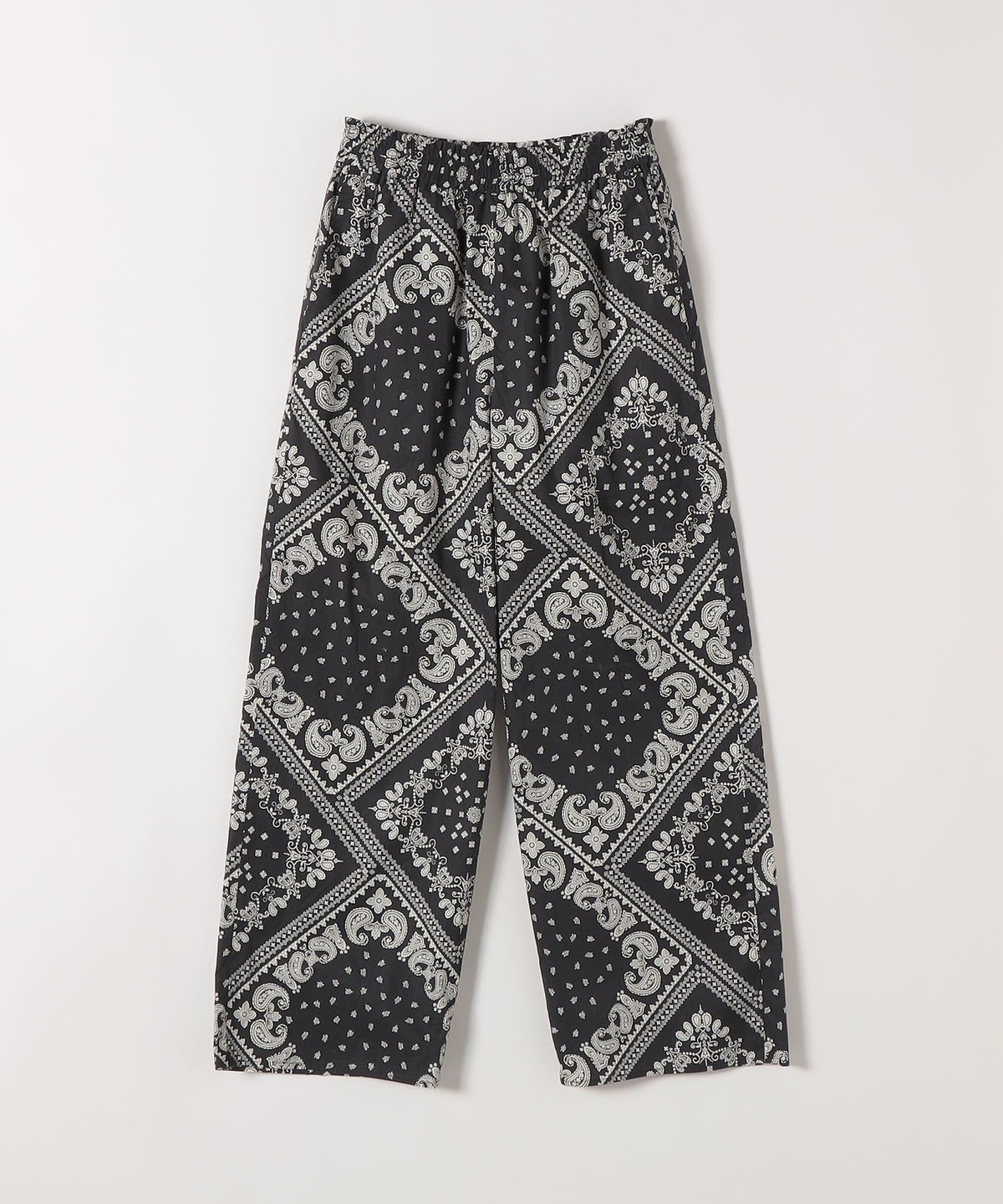 バンダナ柄が目を惹くイージーなワイドパンツ。