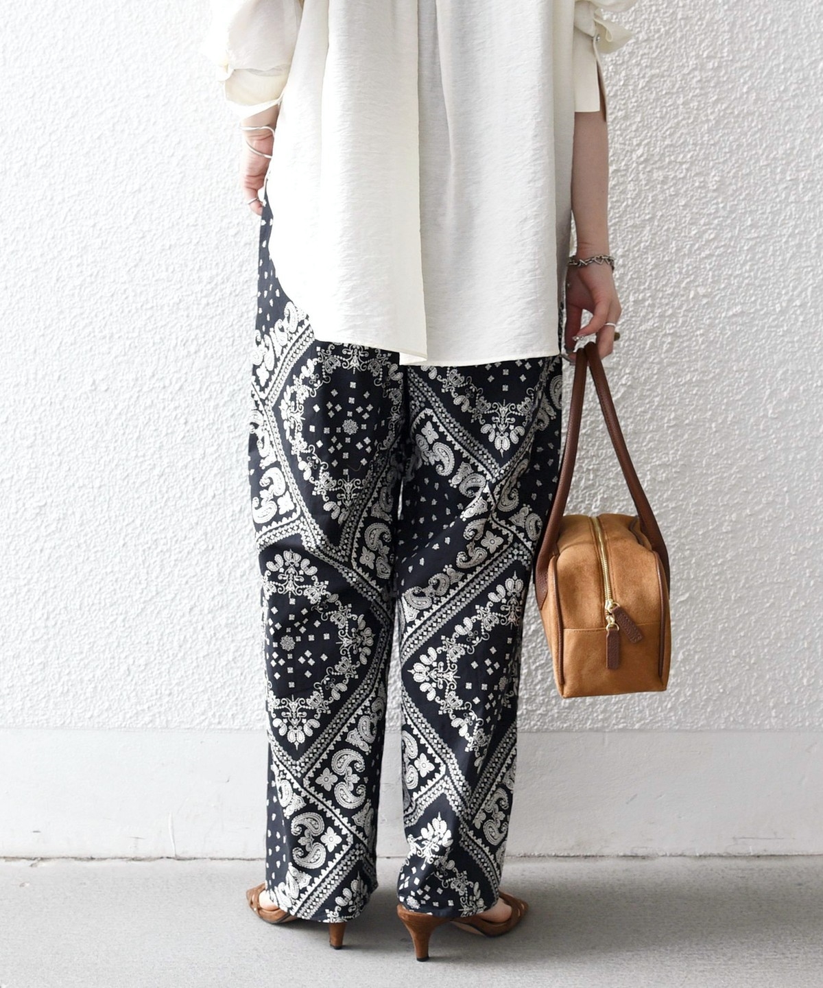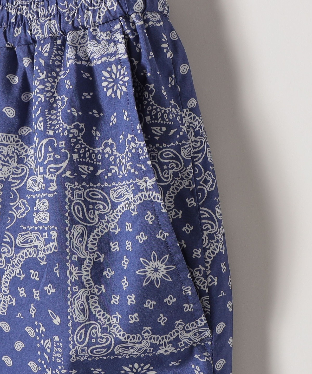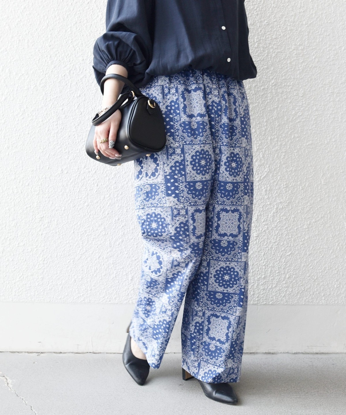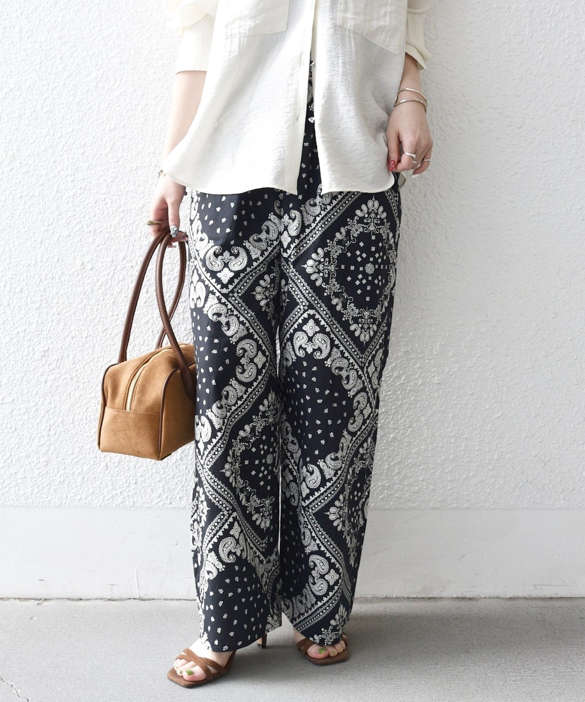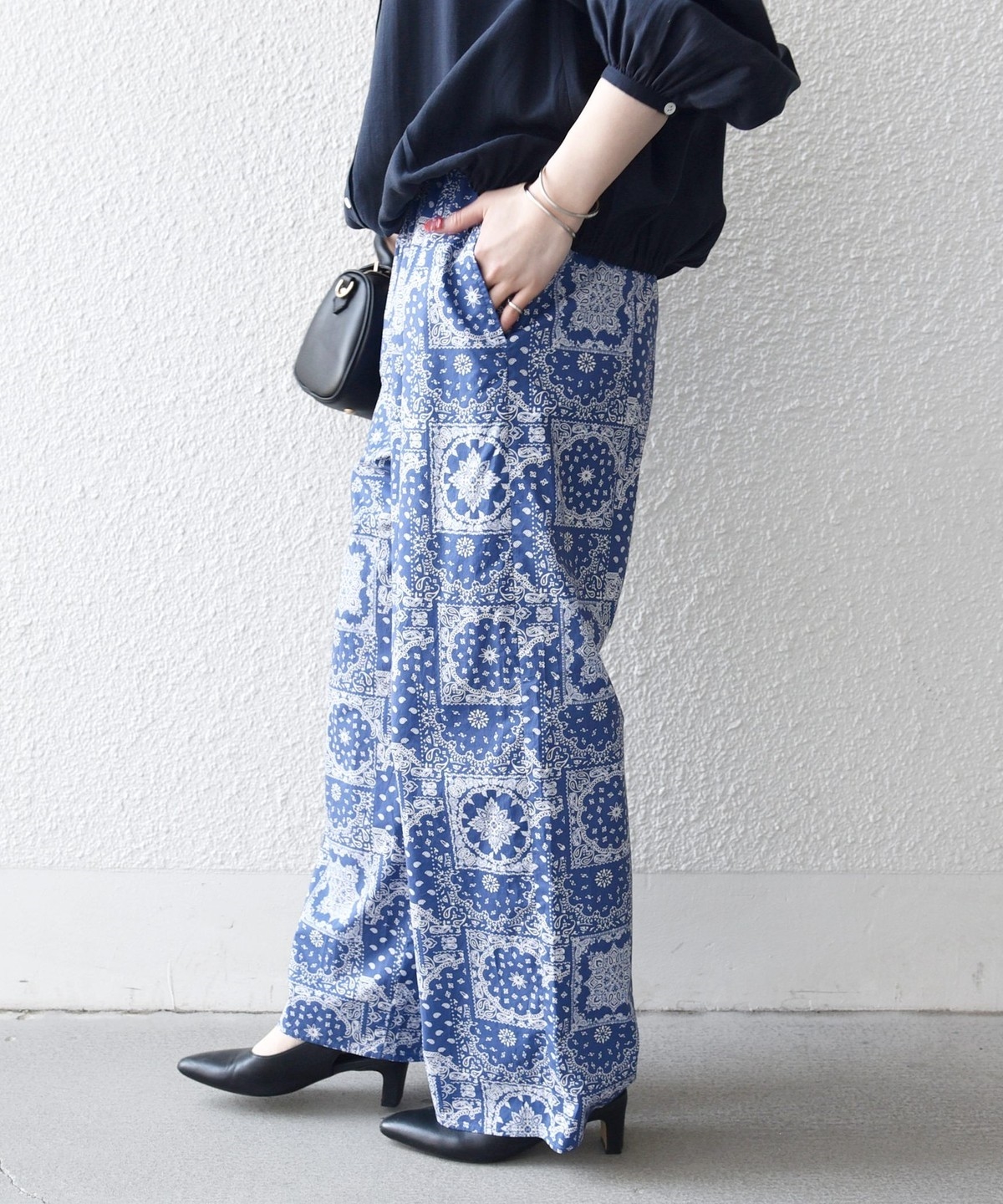 バンダナ柄が目を惹くイージーなワイドパンツ。