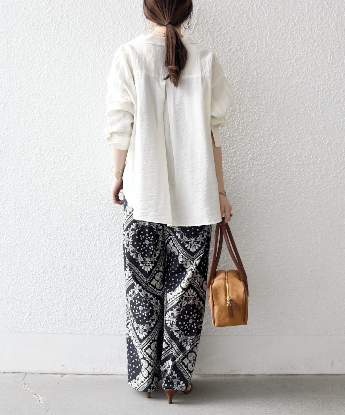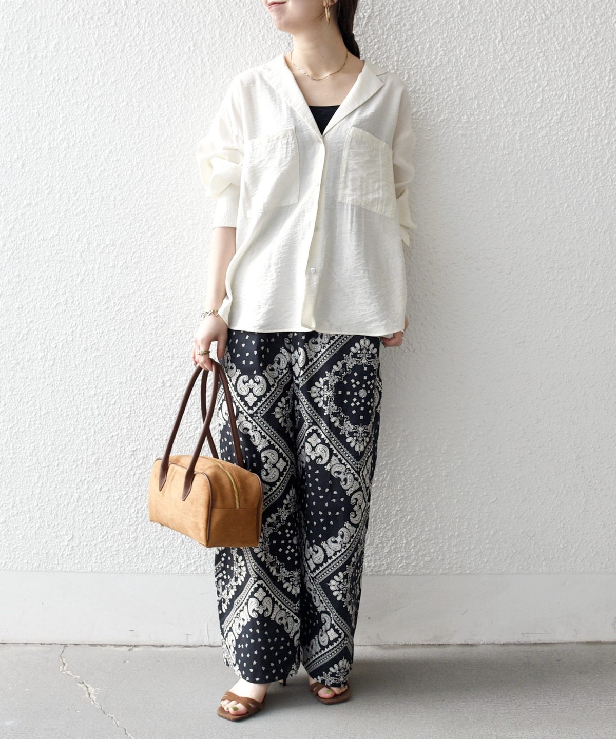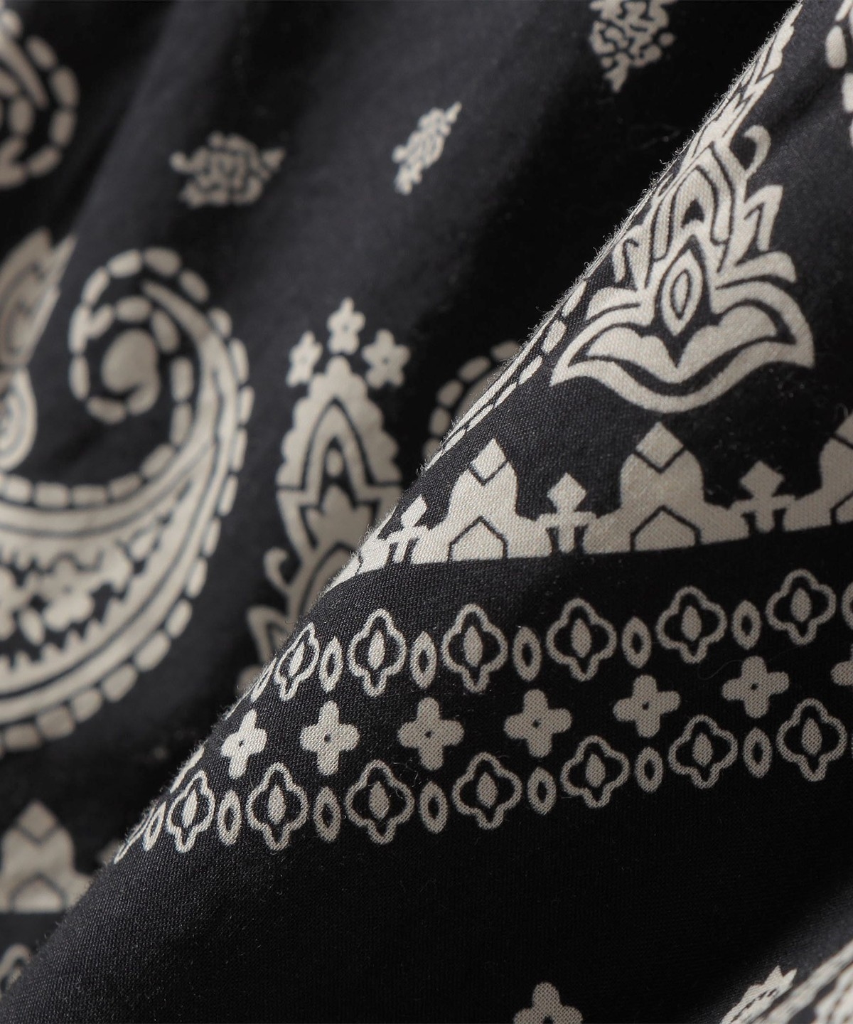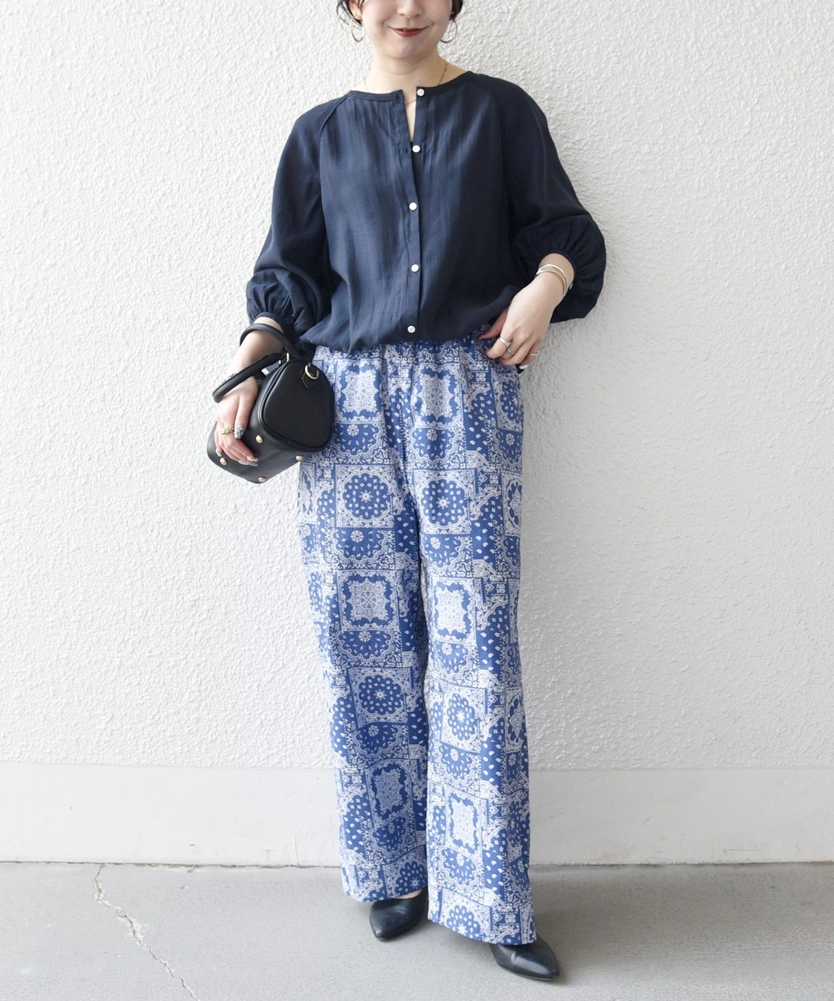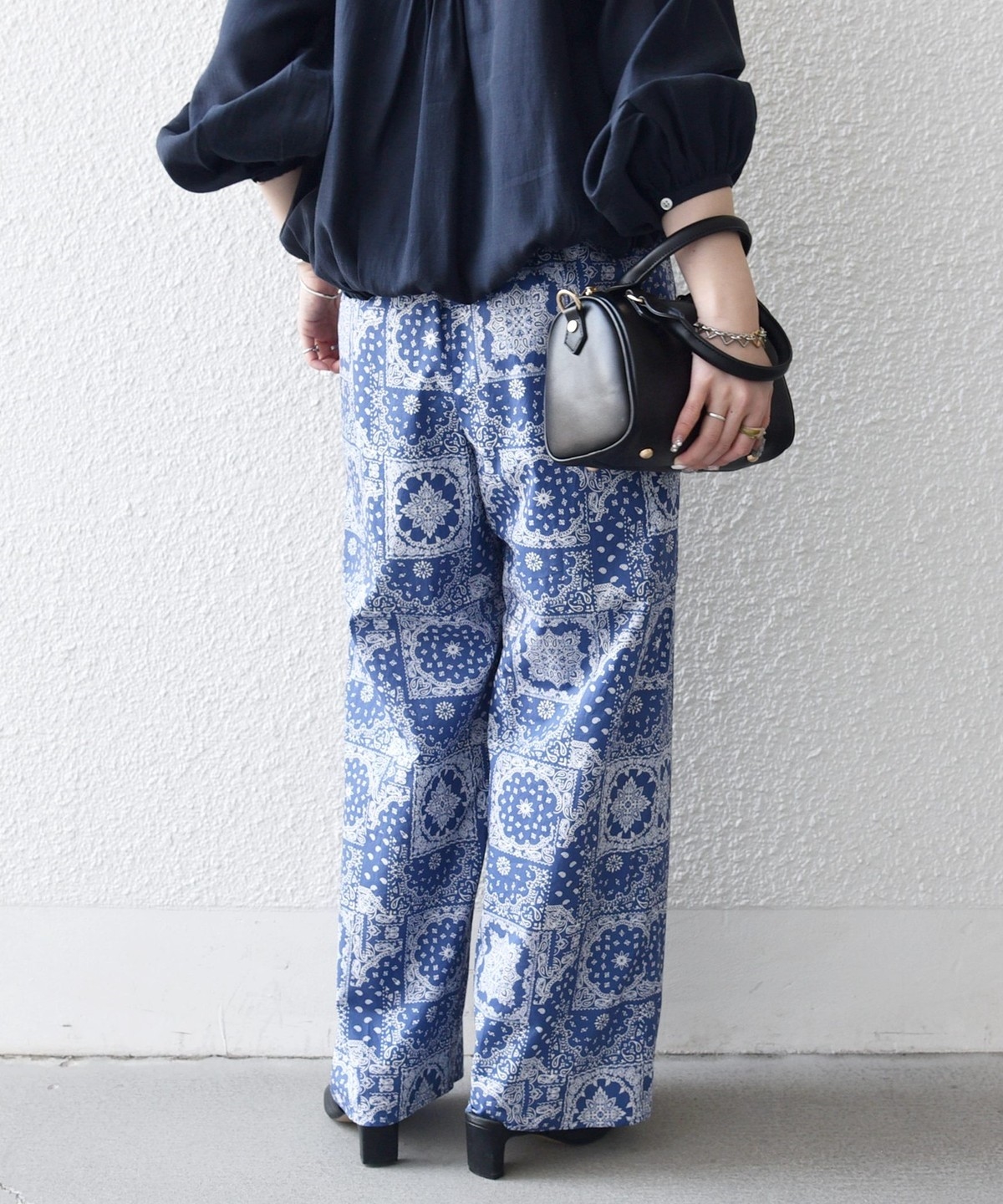 バンダナ柄が目を惹くイージーなワイドパンツ。