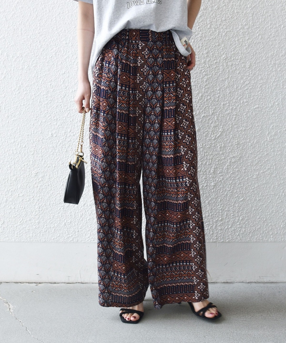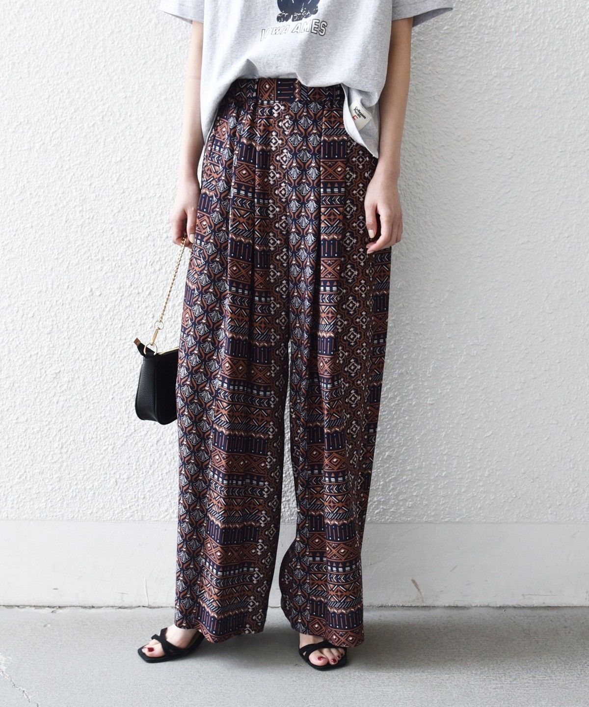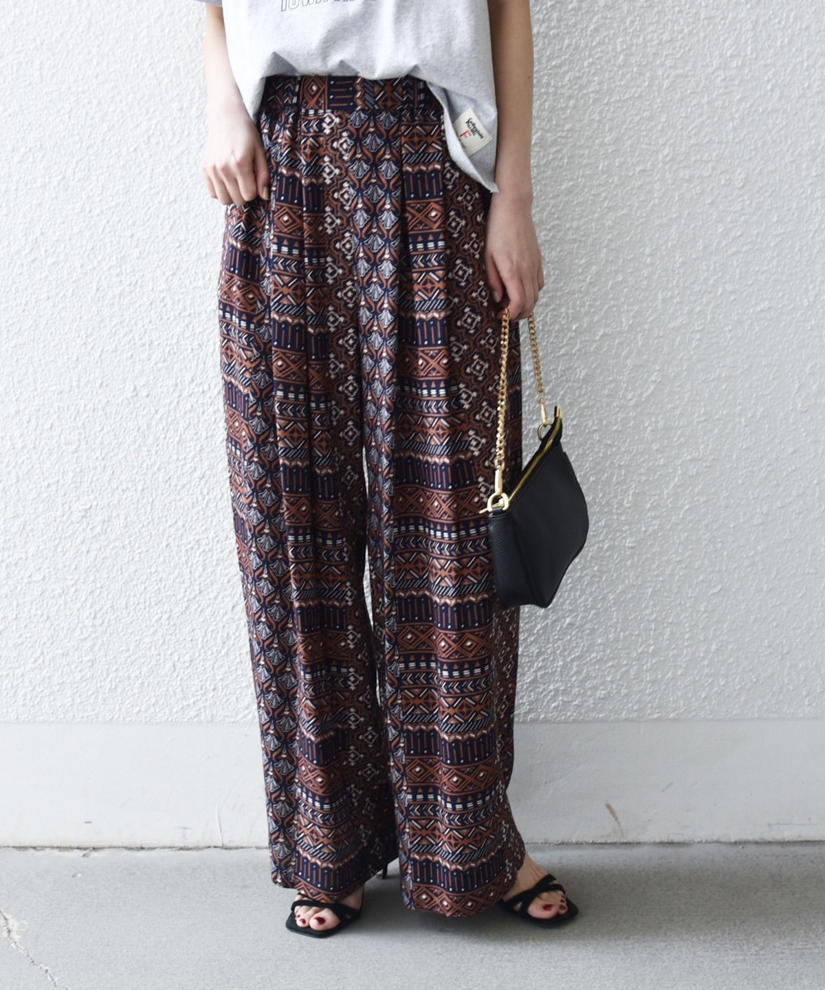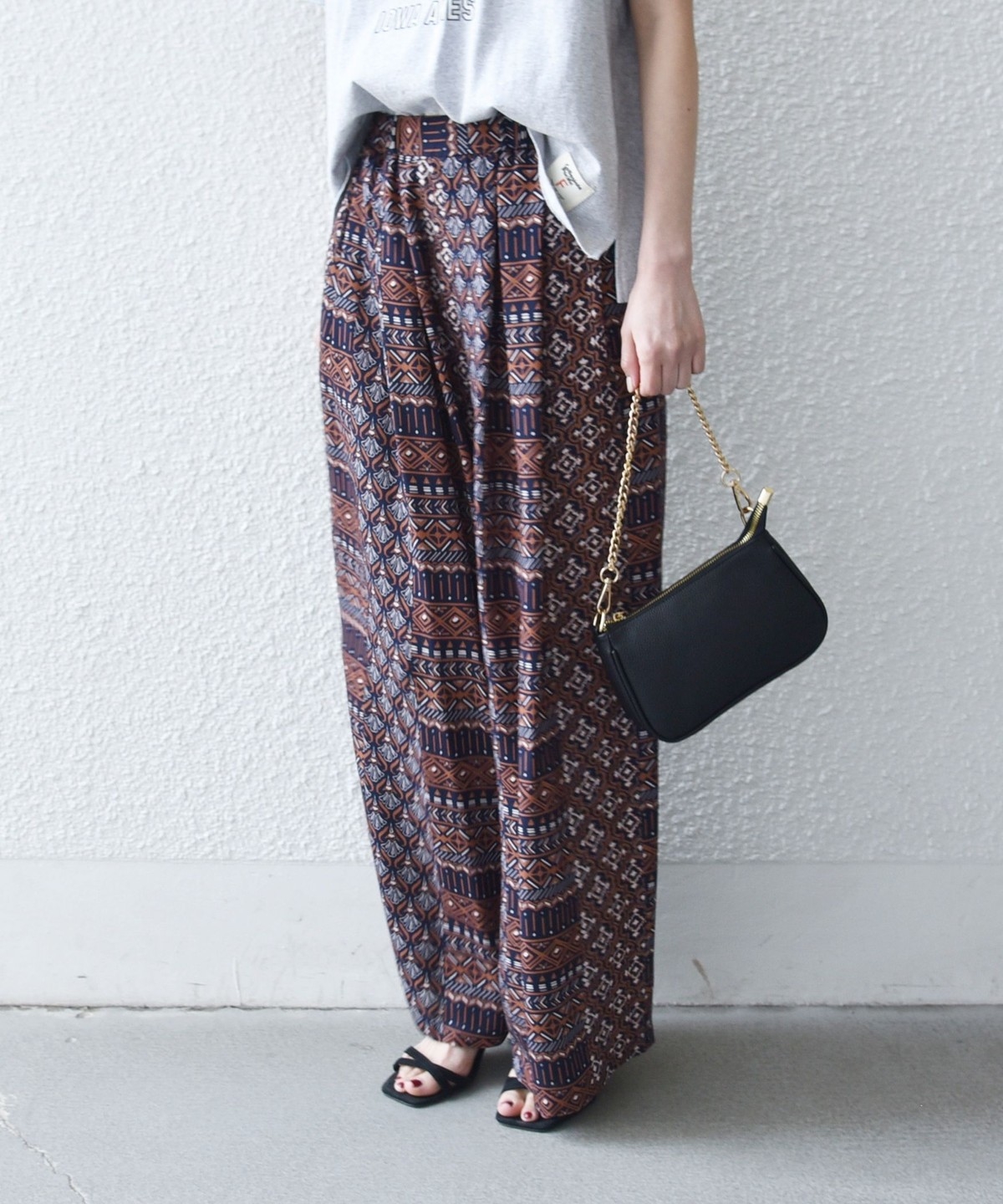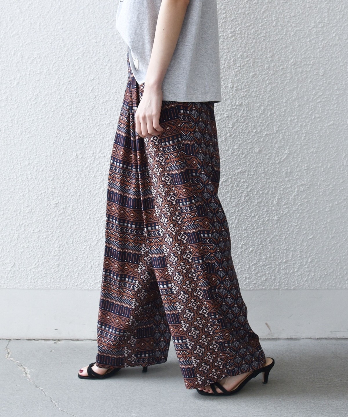 複数の幾何学模様で構成されたプリントがポイントのイージーワイドパンツ。