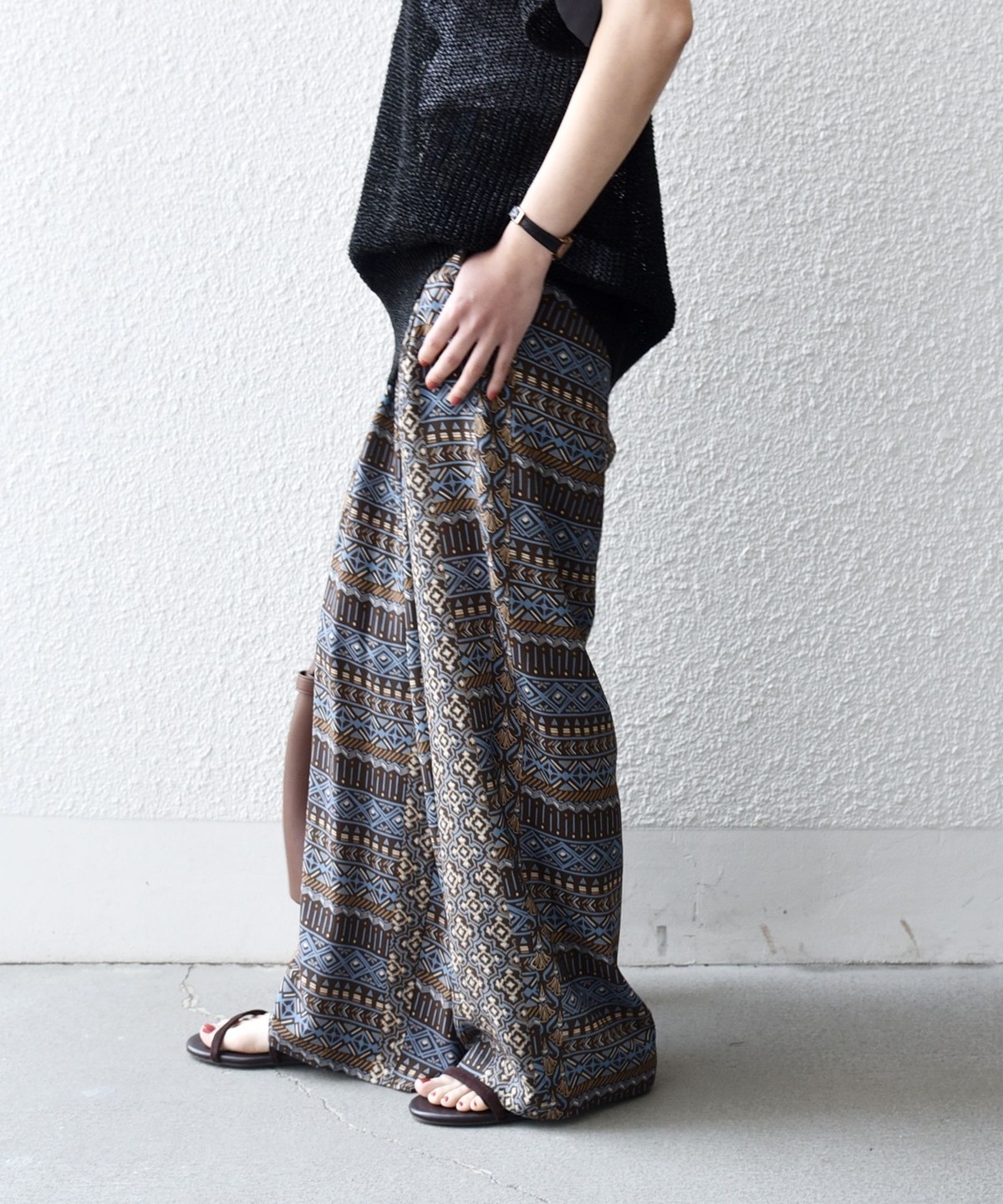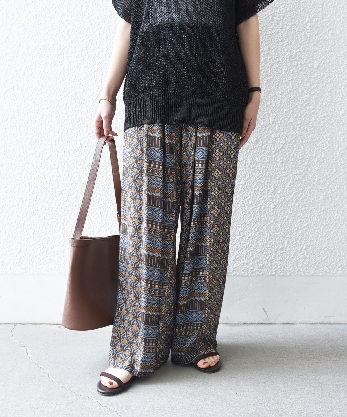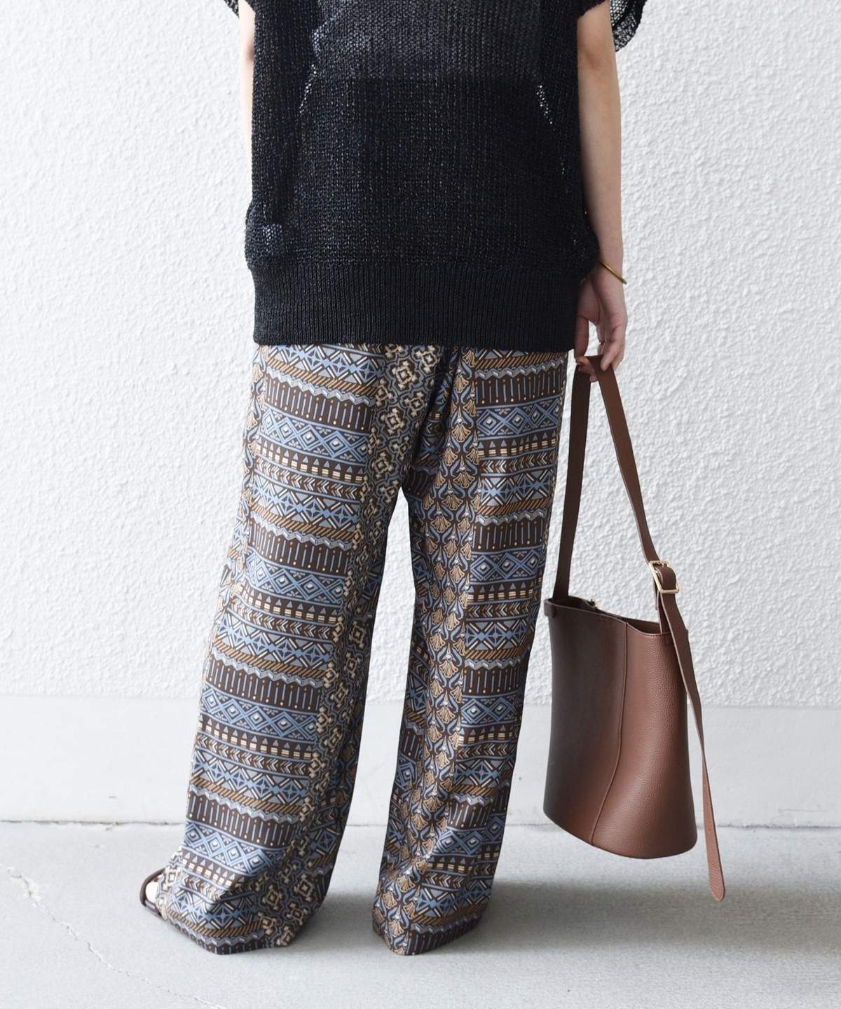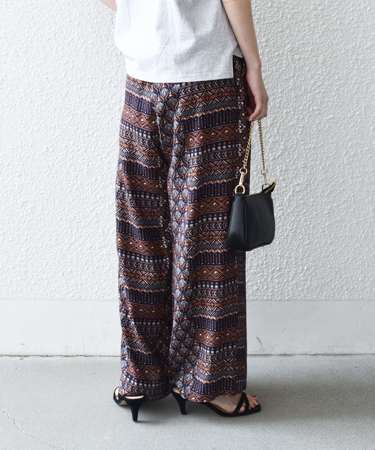 複数の幾何学模様で構成されたプリントがポイントのイージーワイドパンツ。