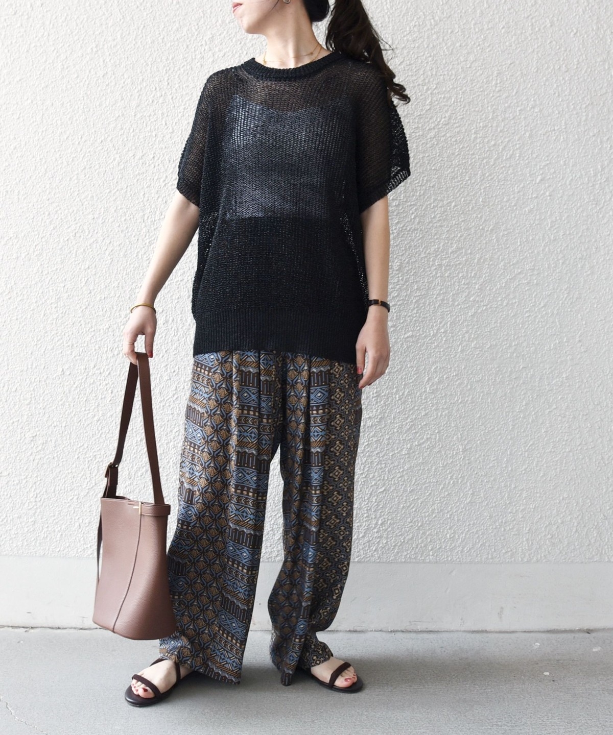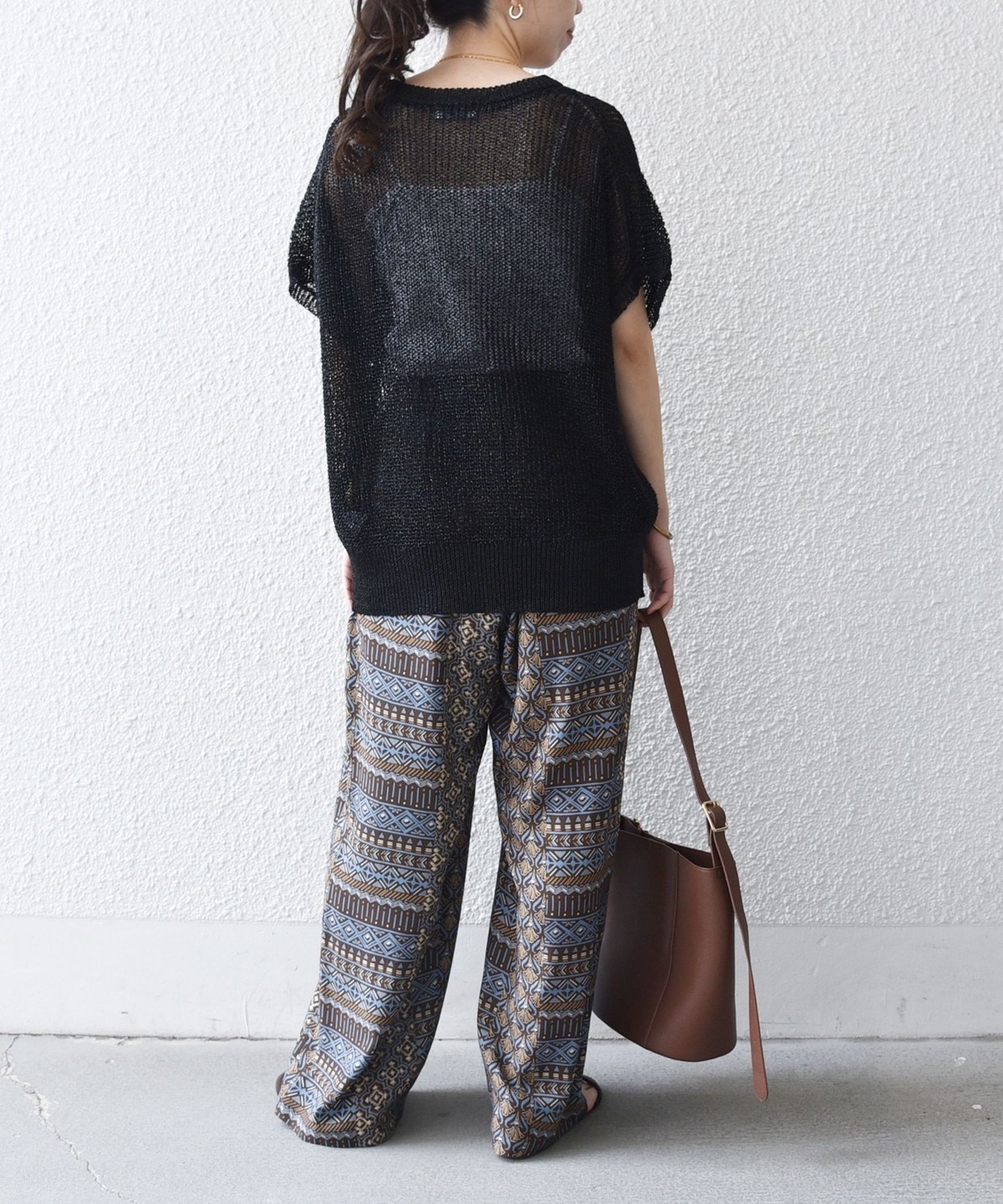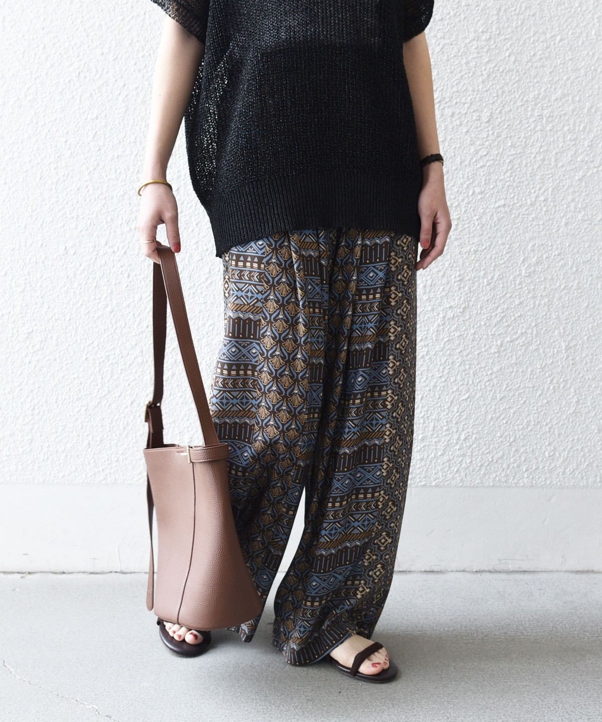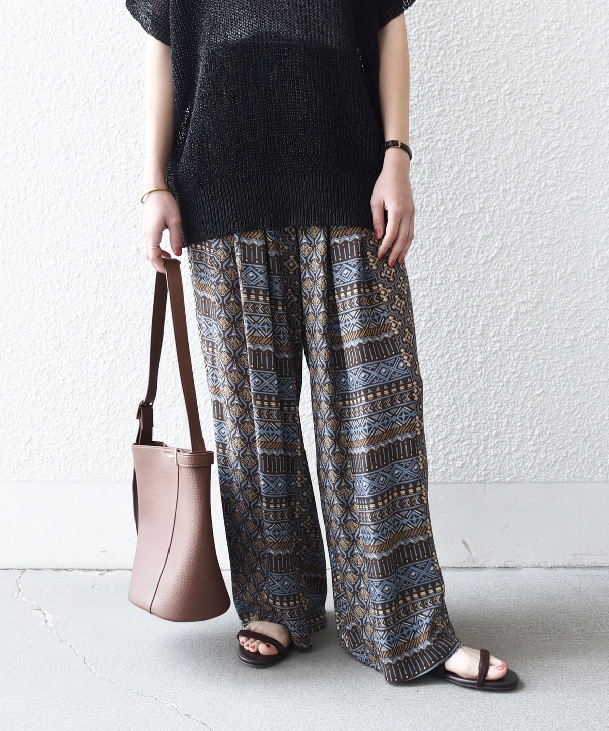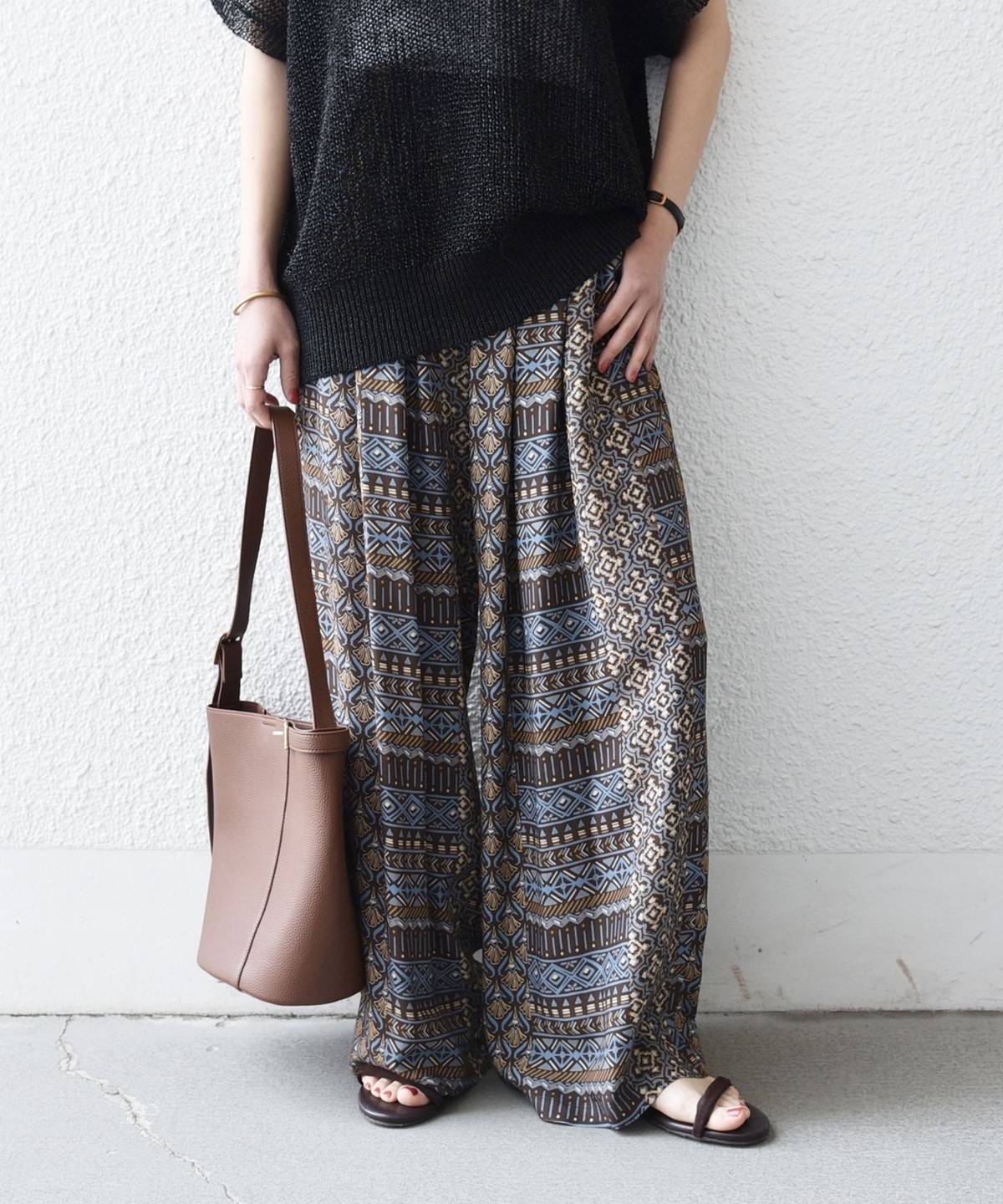 複数の幾何学模様で構成されたプリントがポイントのイージーワイドパンツ。