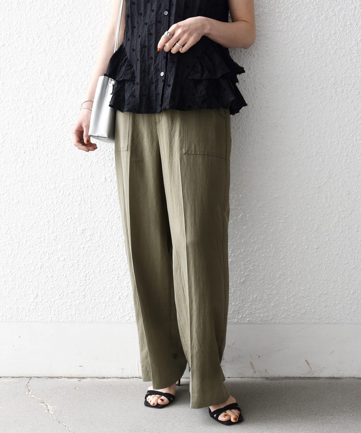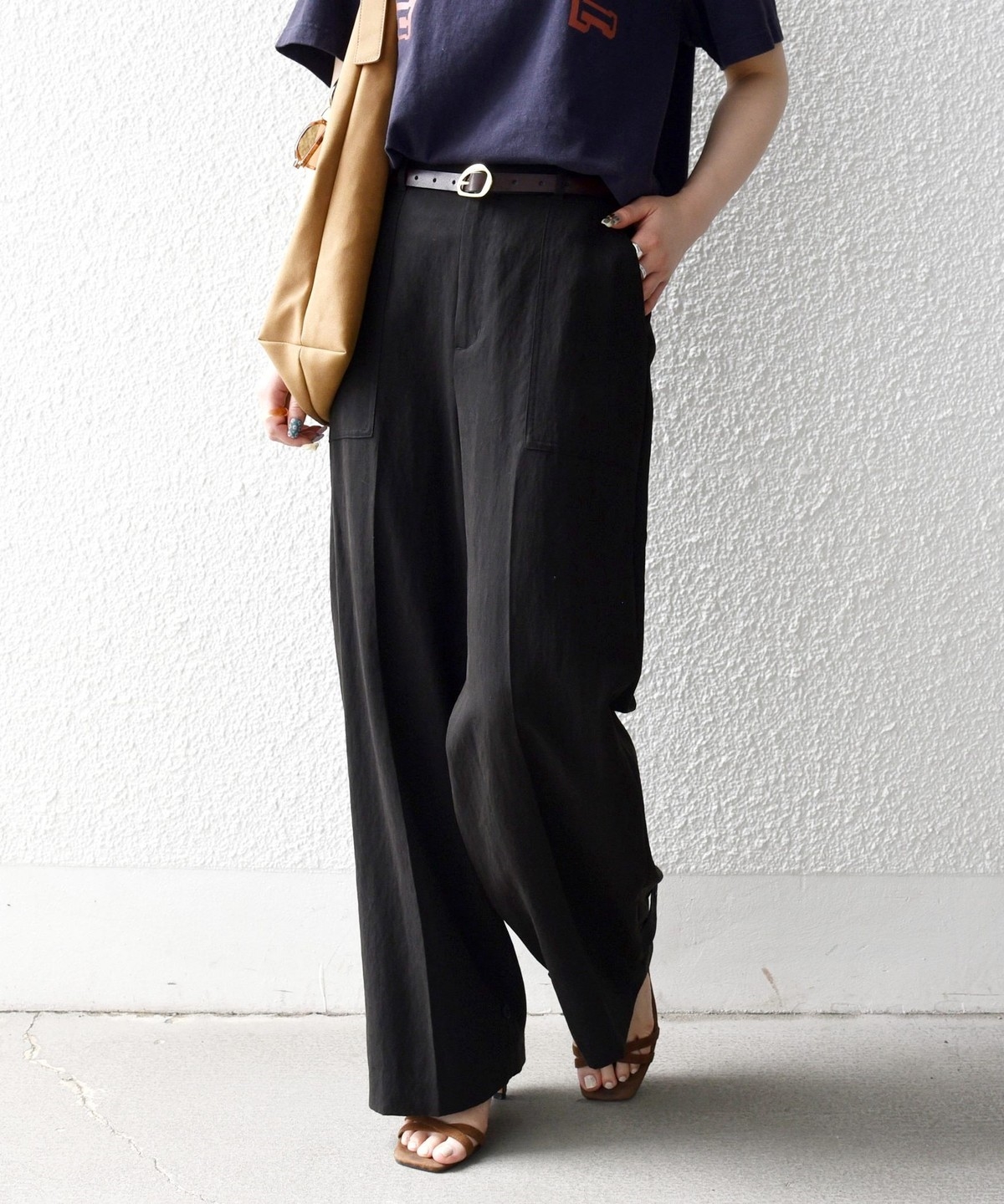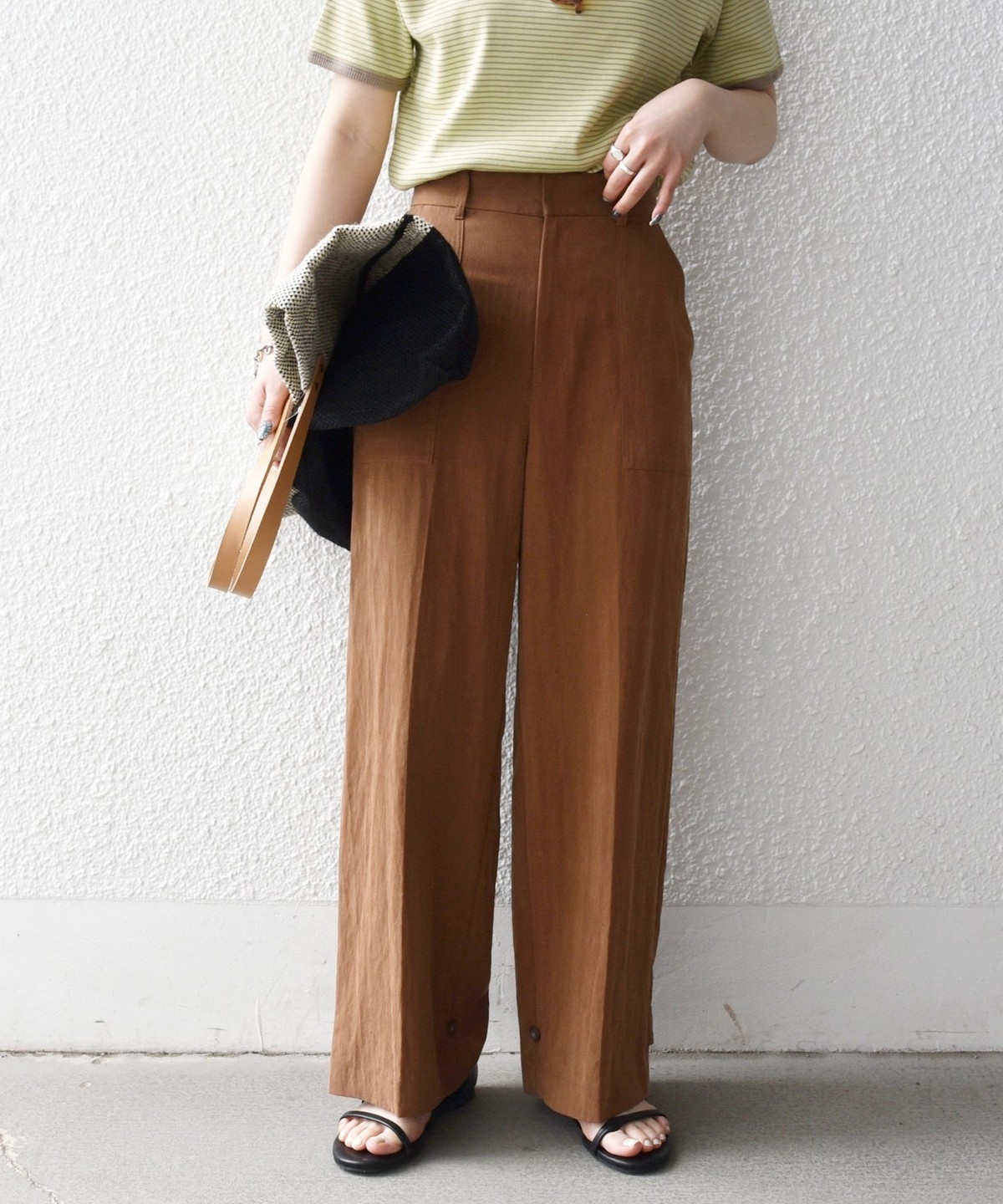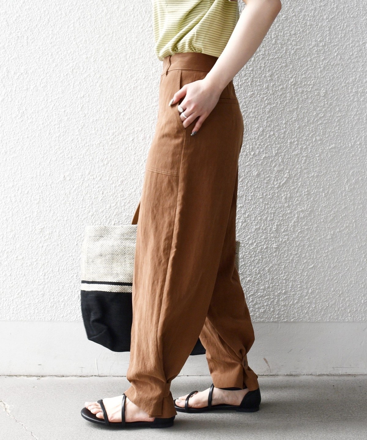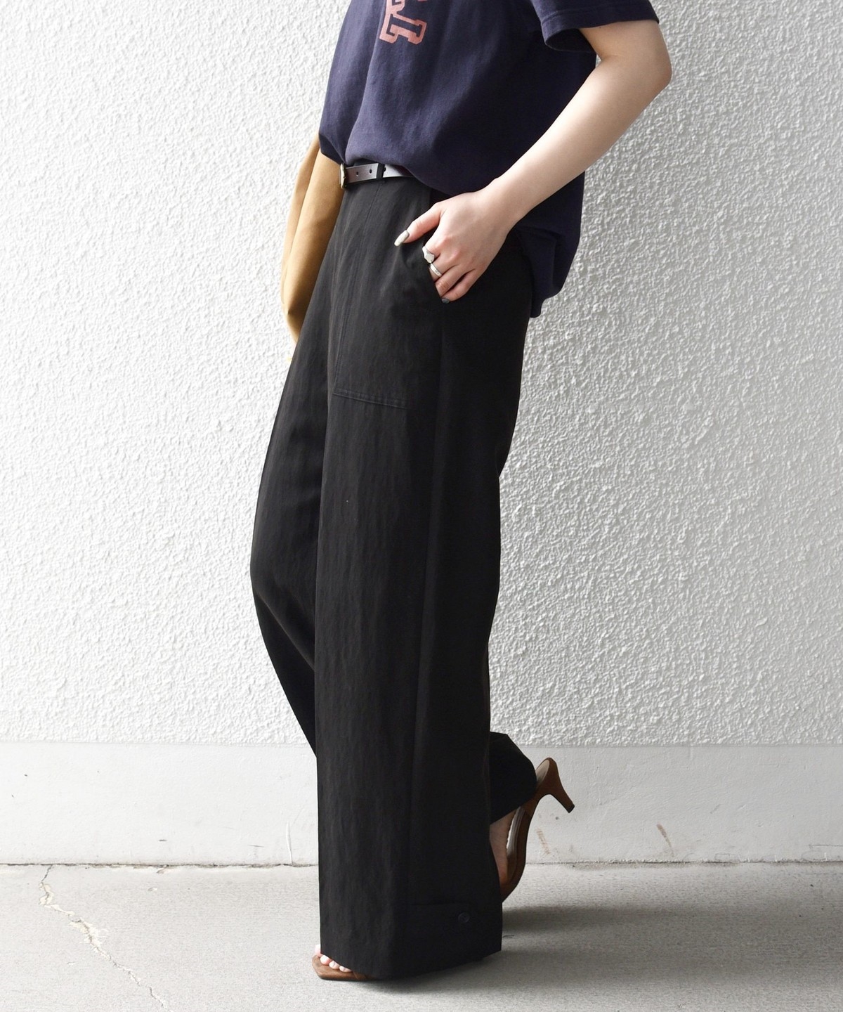 フロントの大きめポケットが程よいアクセントになり、センタープレスとストレートシルエットで自然とすっきり見えを叶えます。