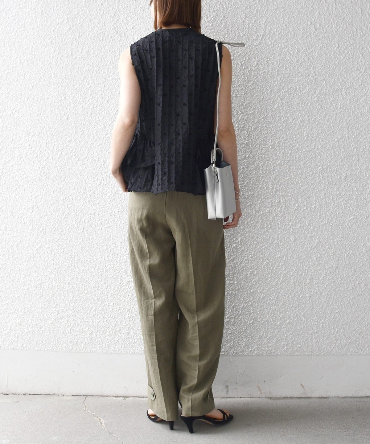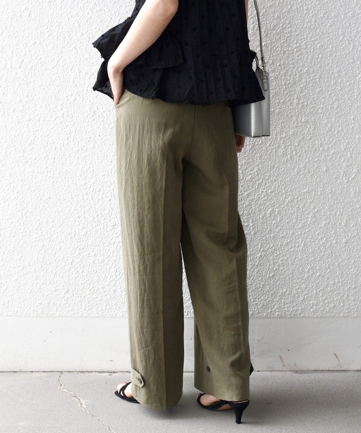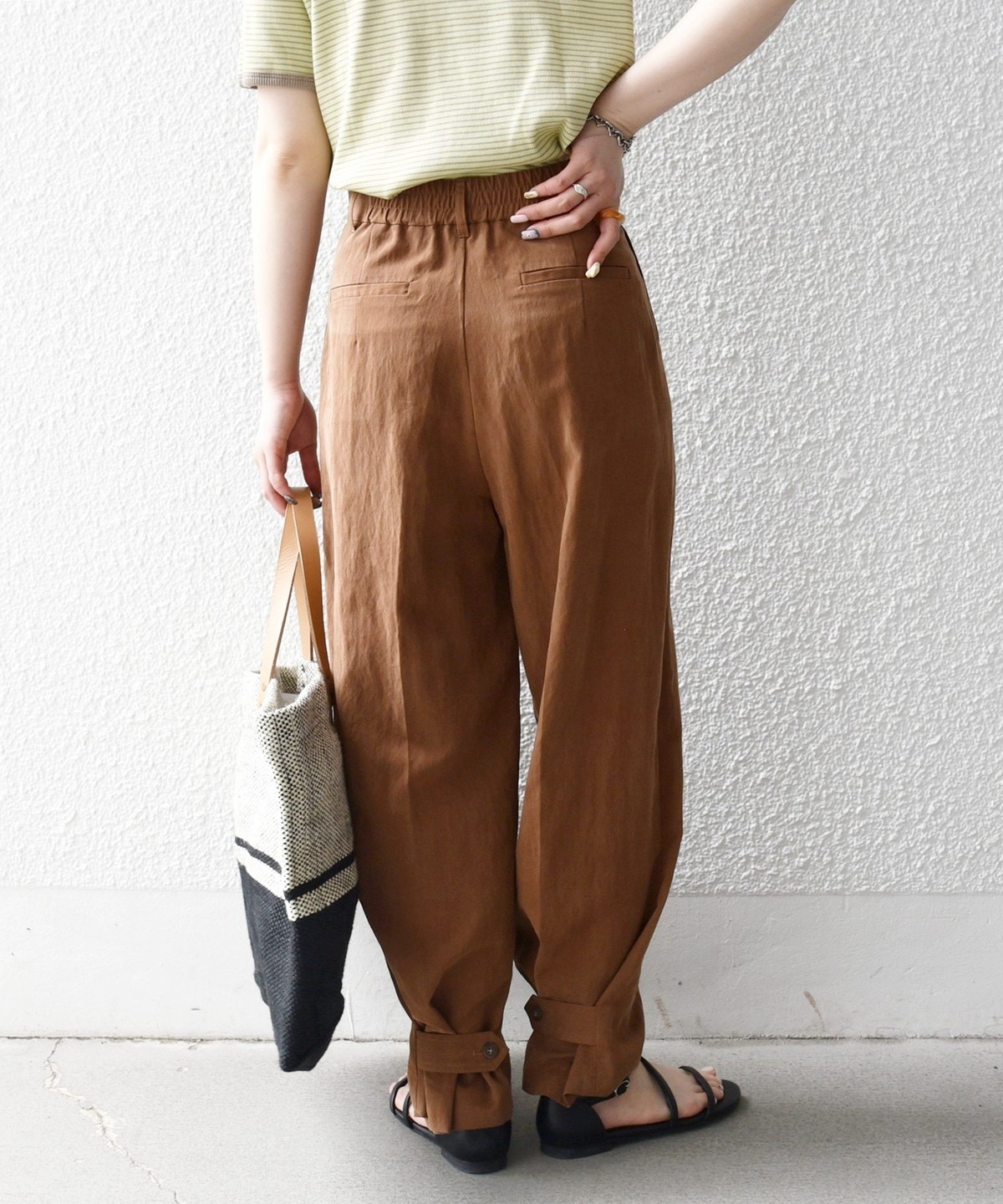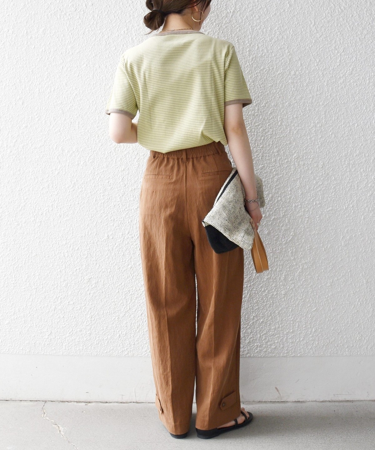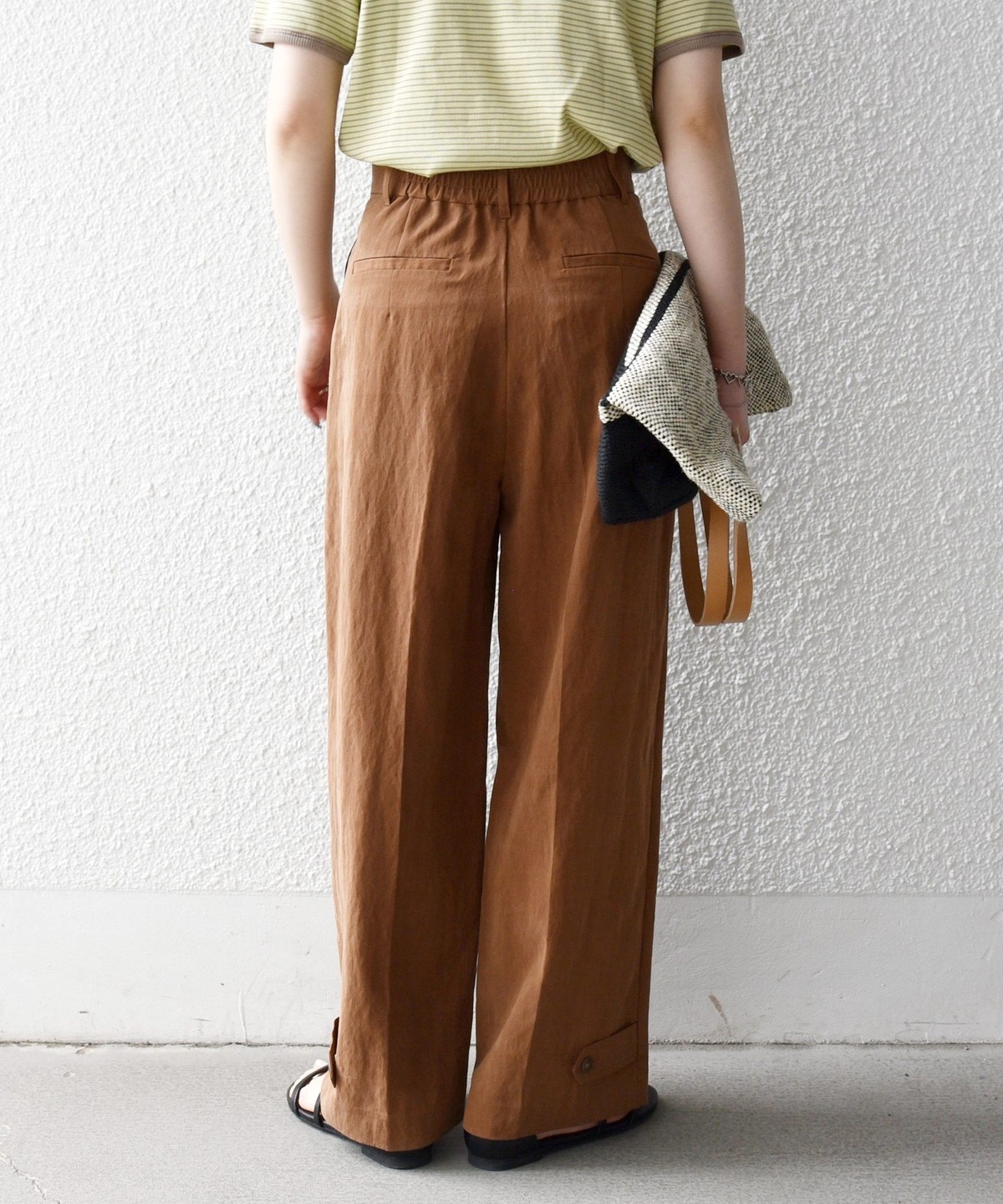 ベルトループ付きできちんと見えしながら、後ろウエストはゴム仕様でストレスフリーな穿き心地も魅力です。