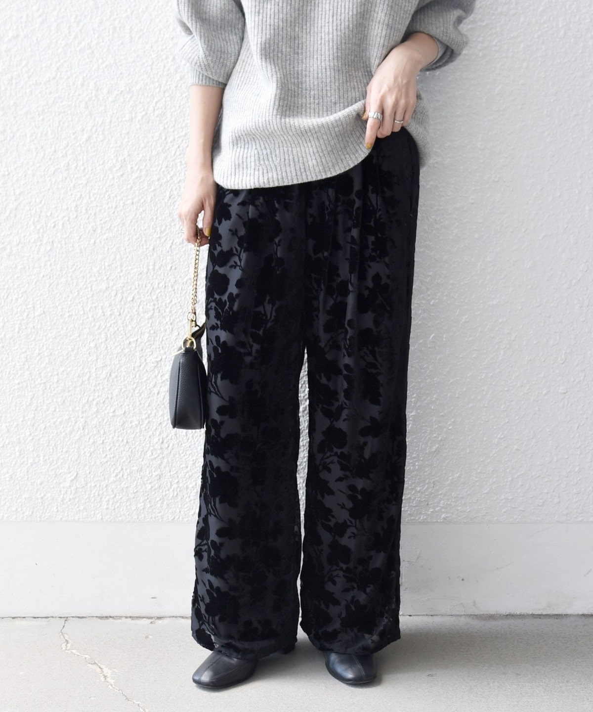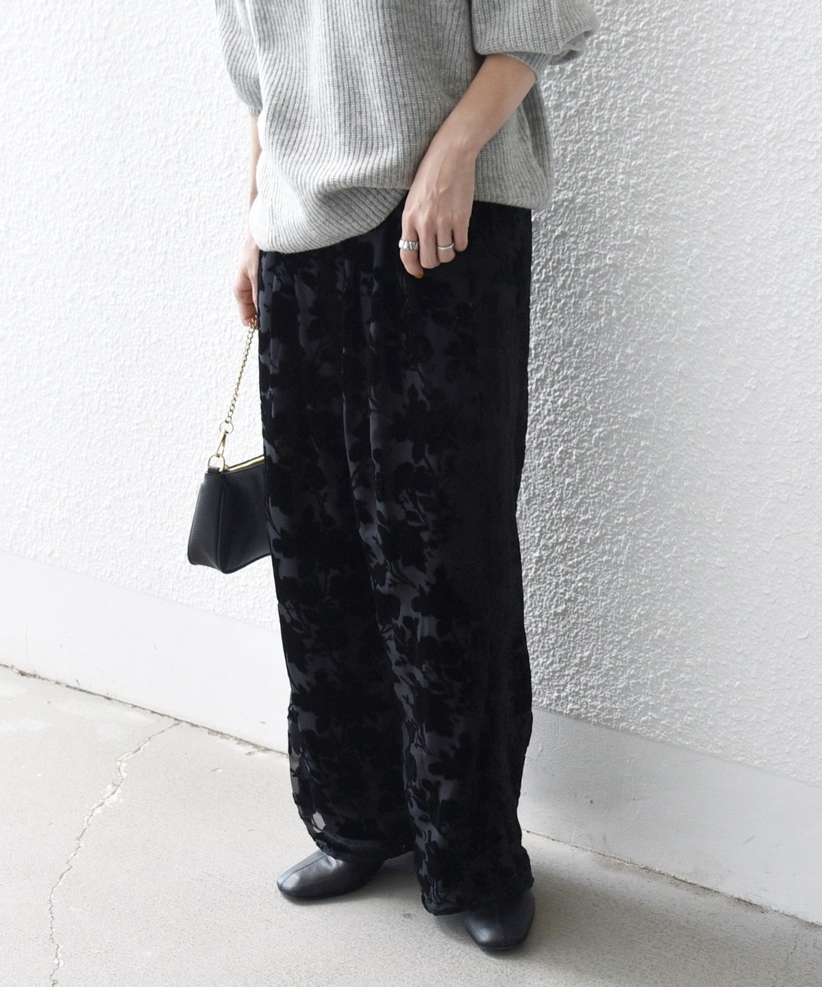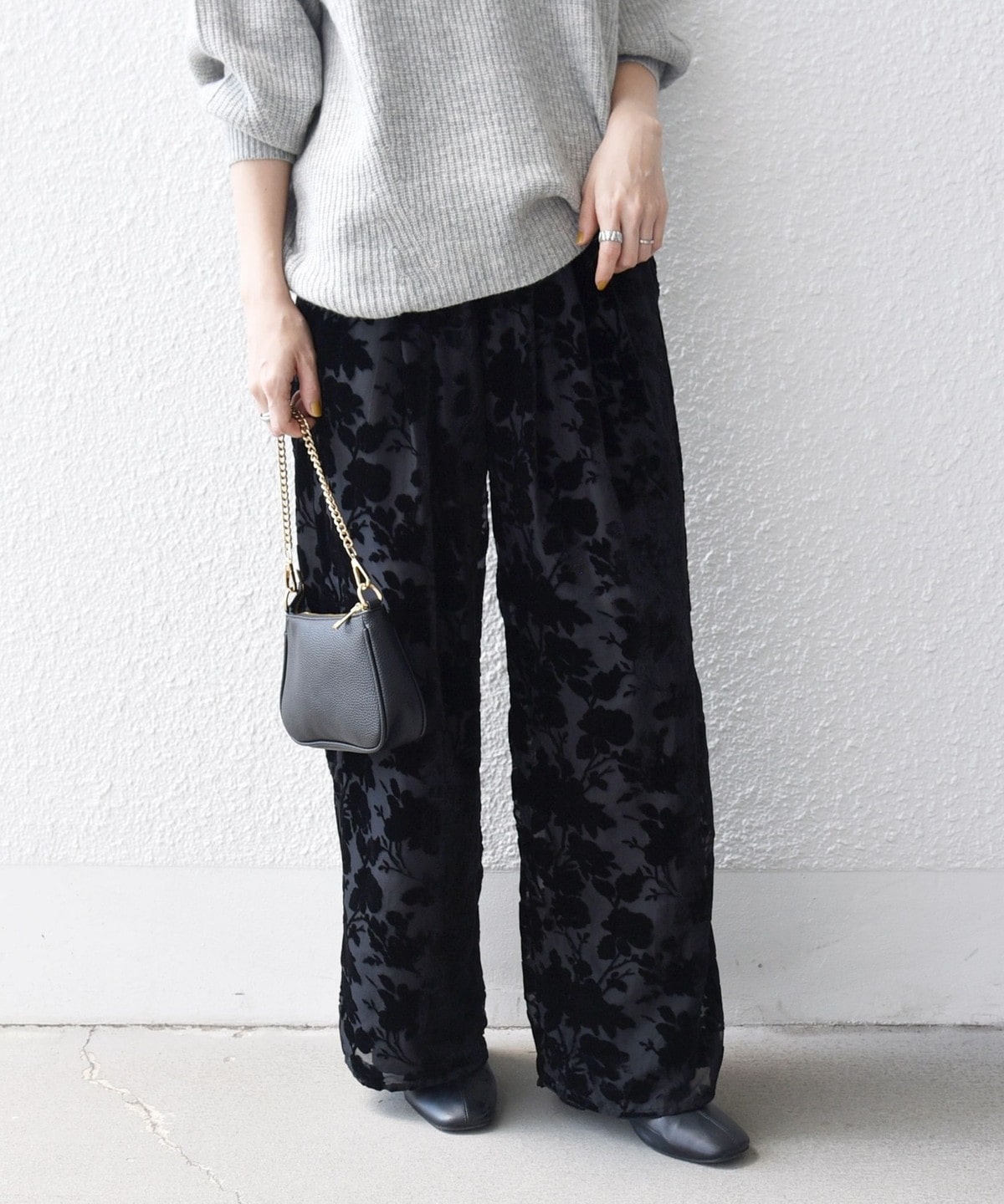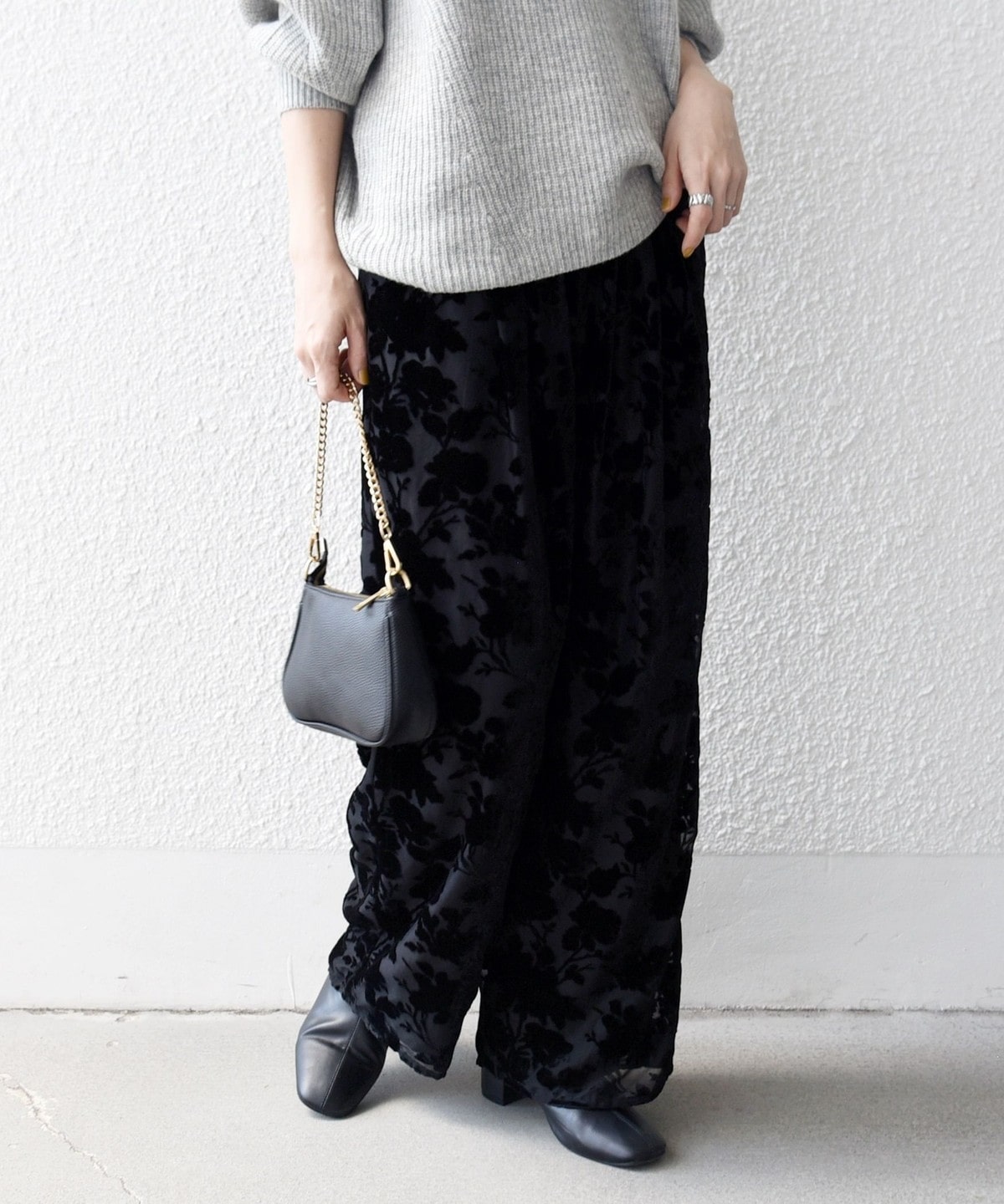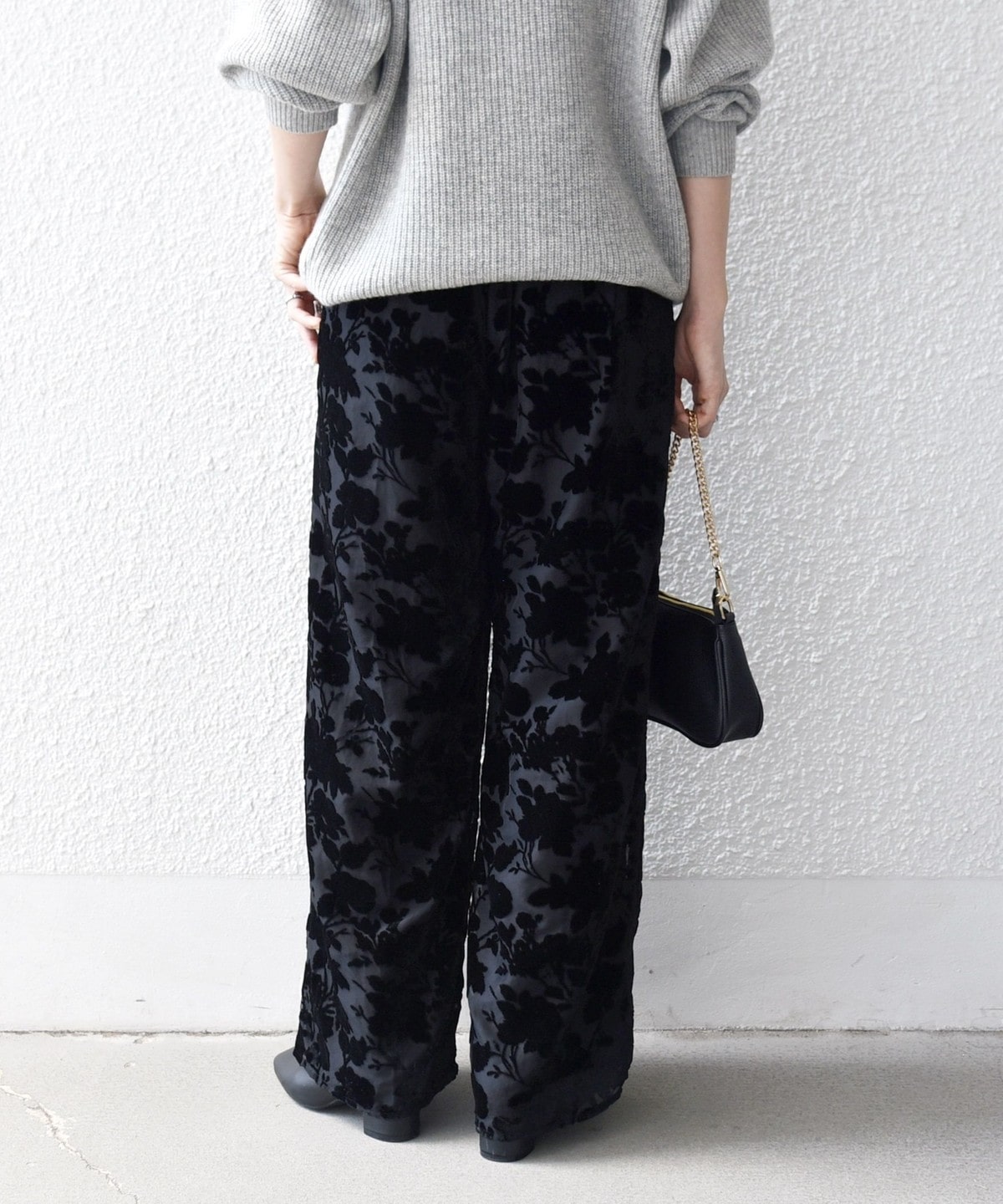 透け感のある生地に浮かぶフラワーモチーフが目を惹くワイドパンツ。
