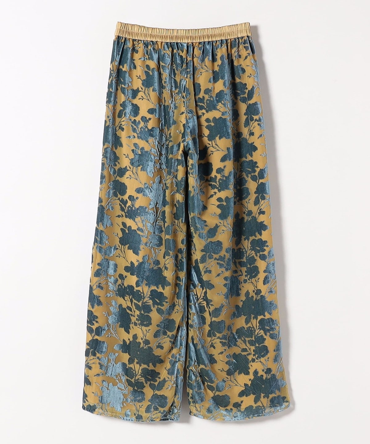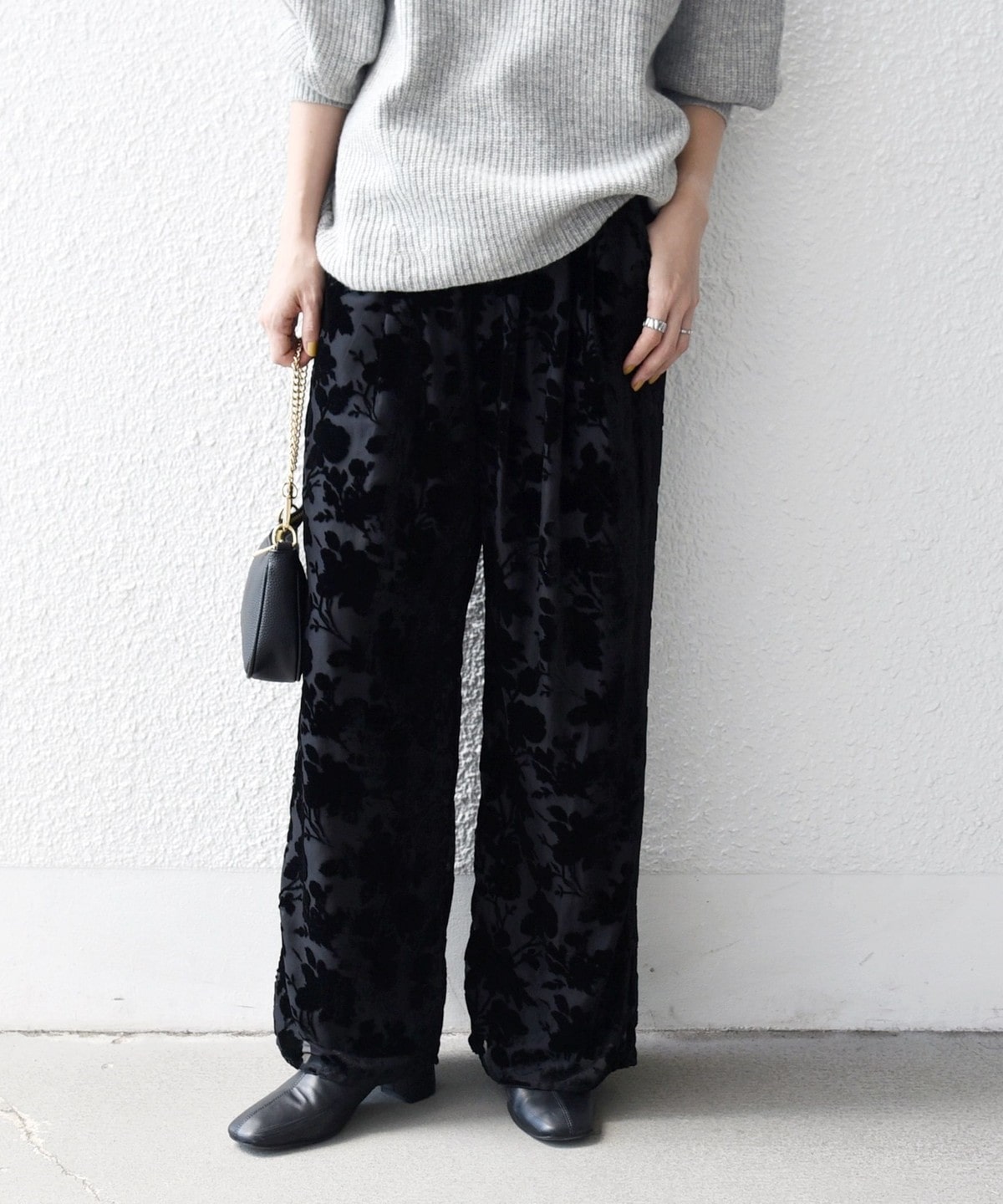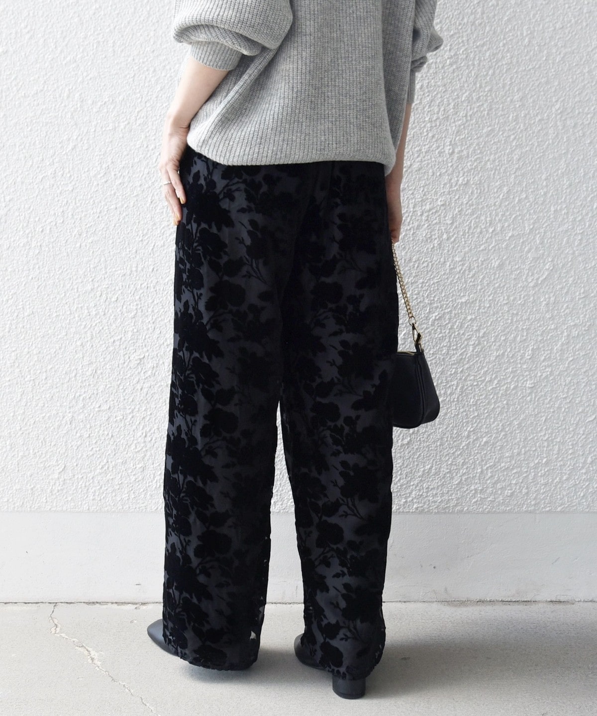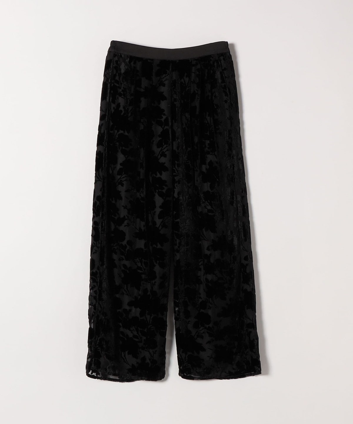 透け感のある生地に浮かぶフラワーモチーフが目を惹くワイドパンツ。