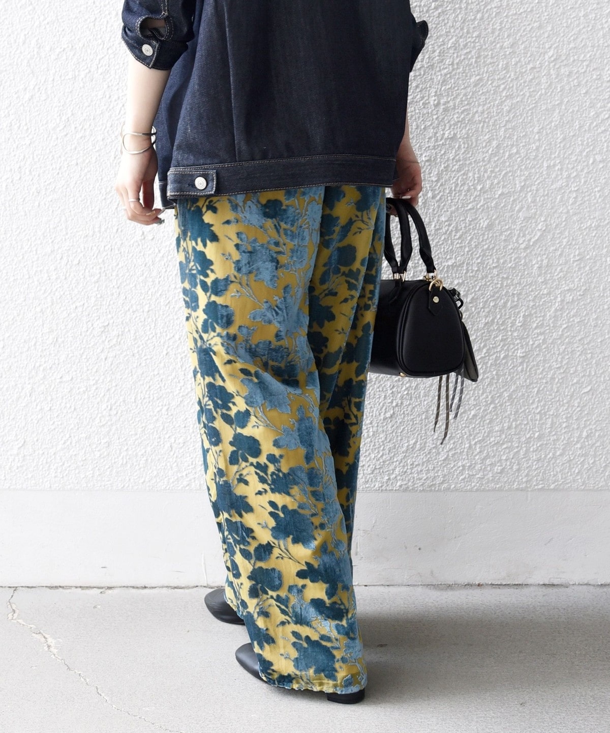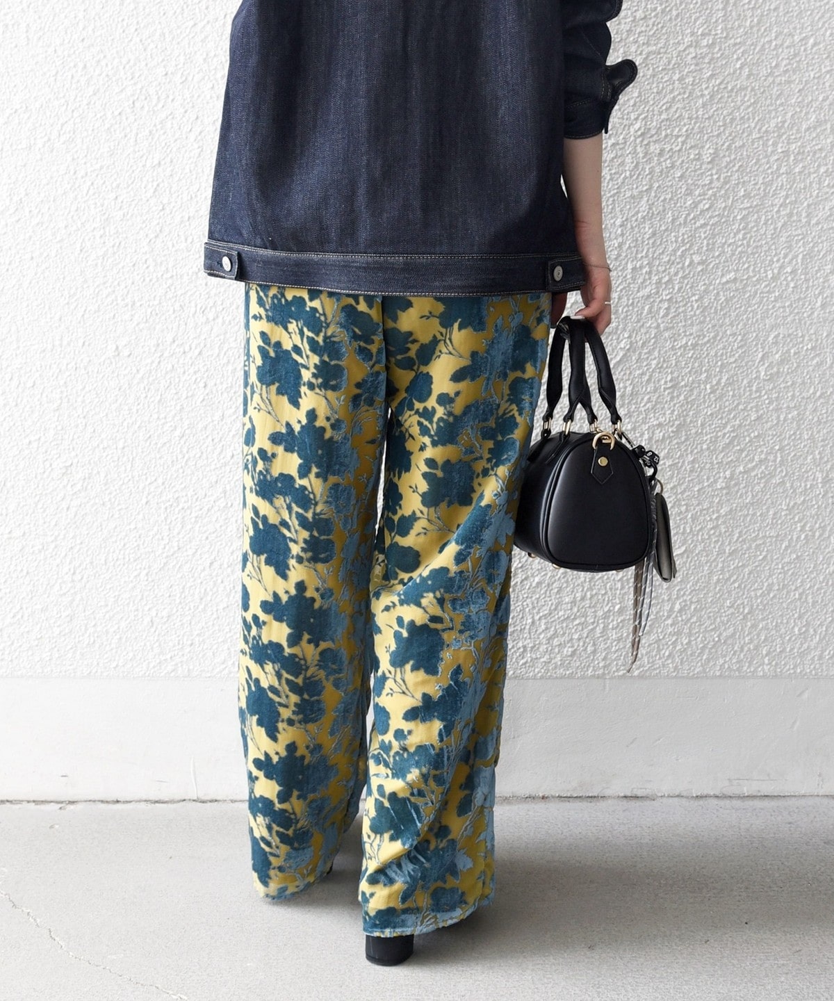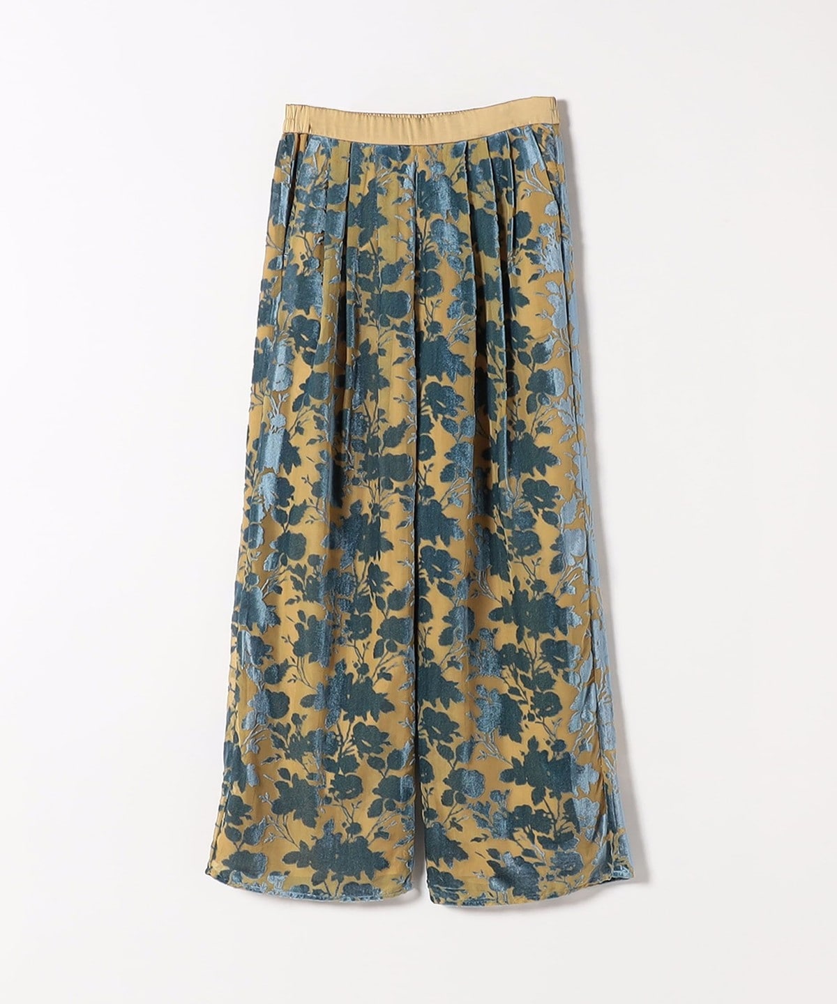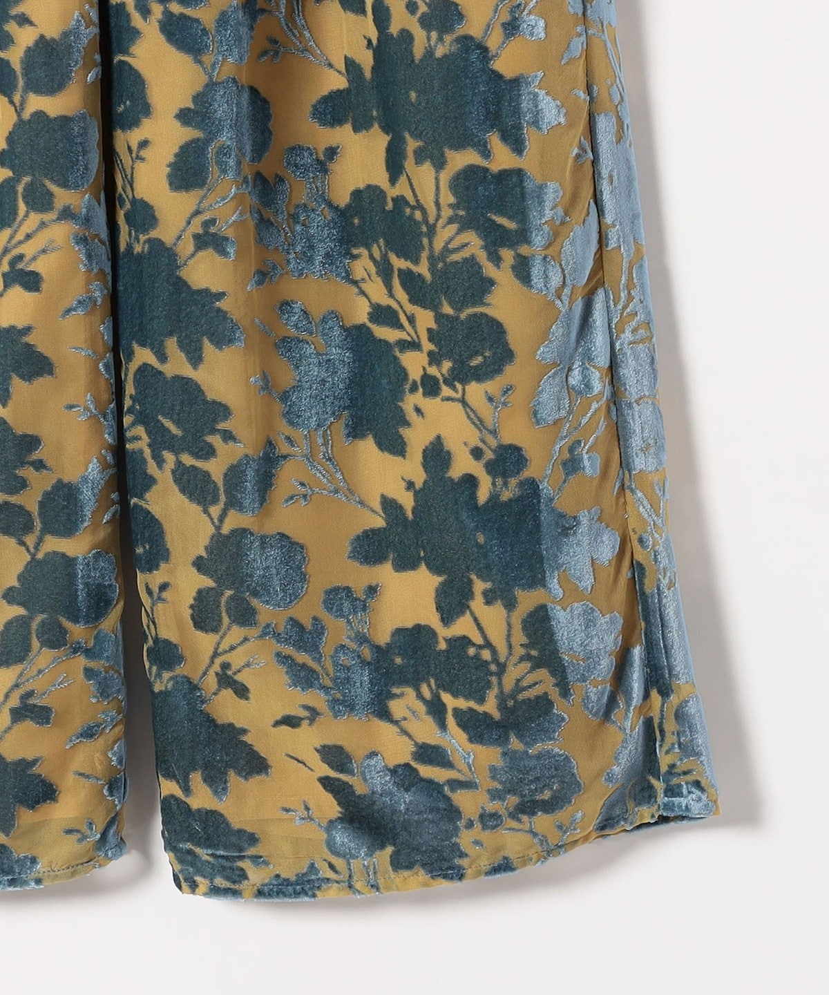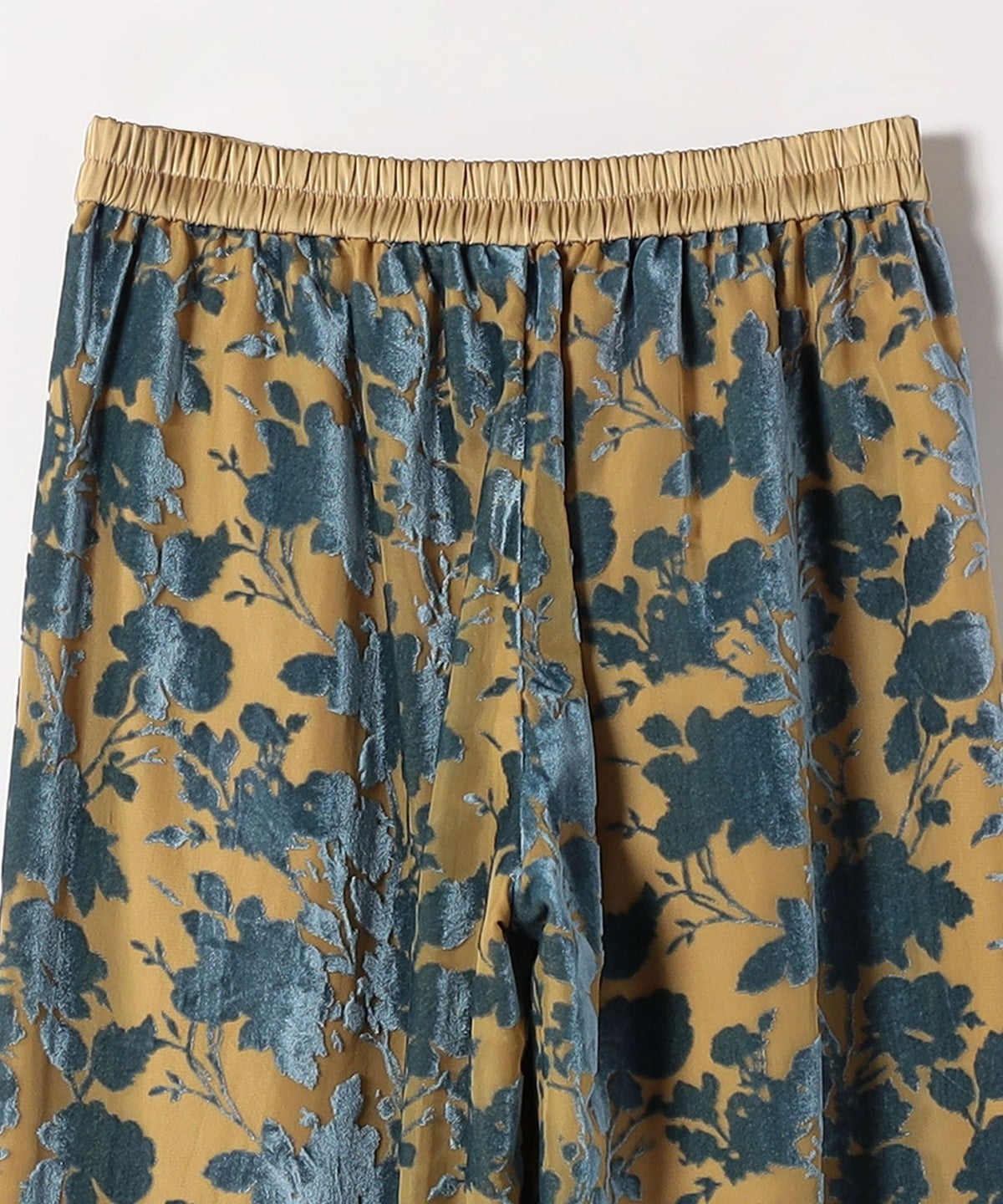 透け感のある生地に浮かぶフラワーモチーフが目を惹くワイドパンツ。