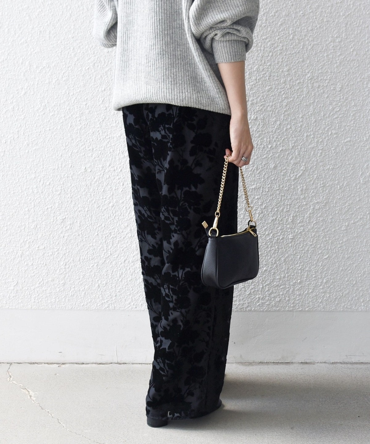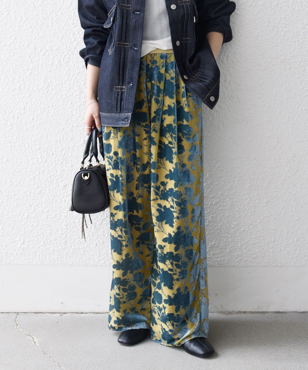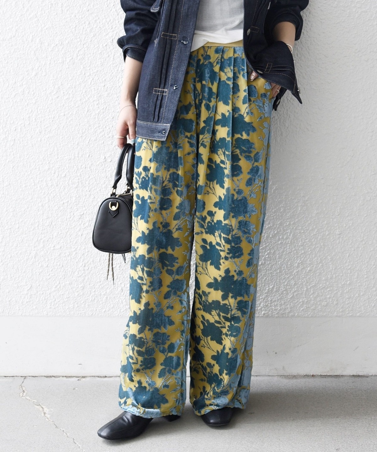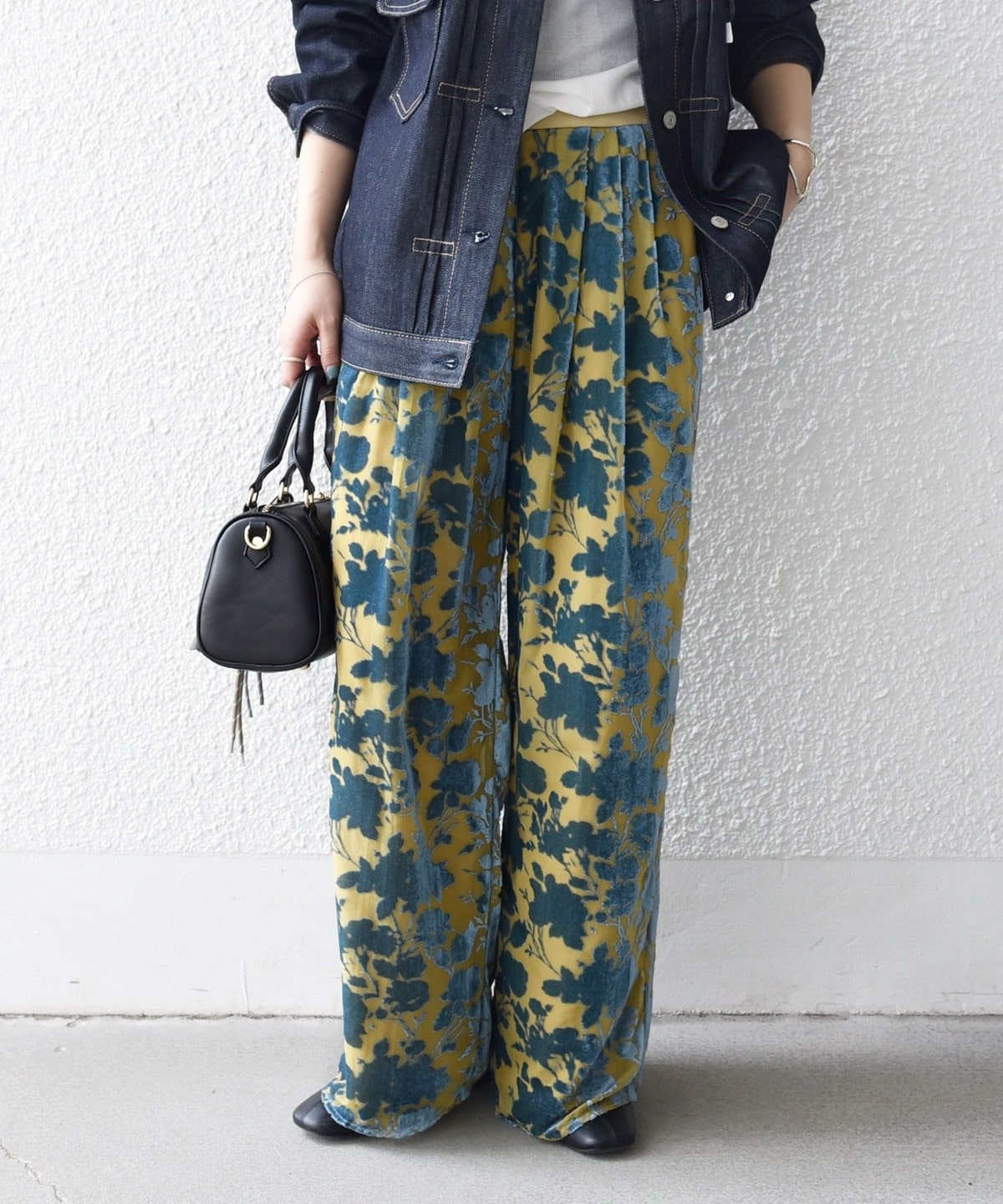 透け感のある生地に浮かぶフラワーモチーフが目を惹くワイドパンツ。