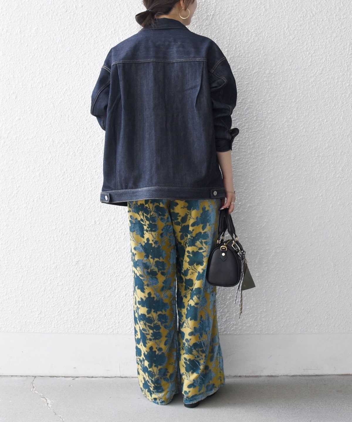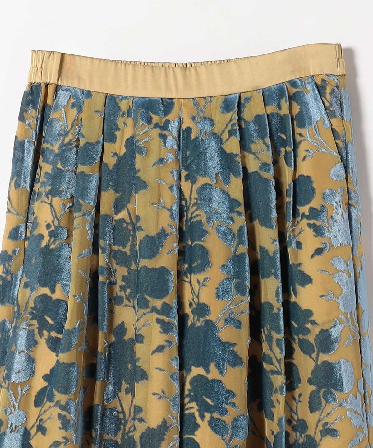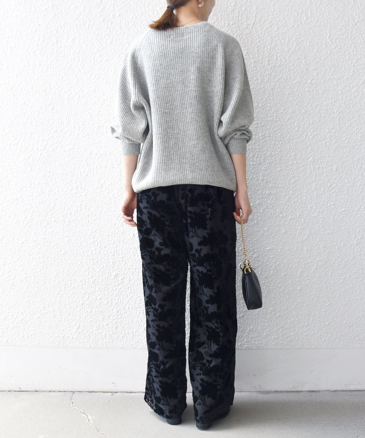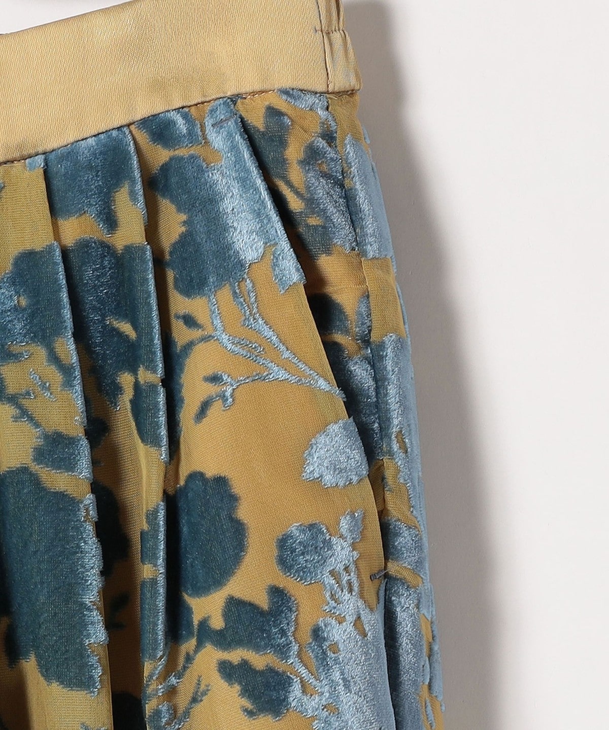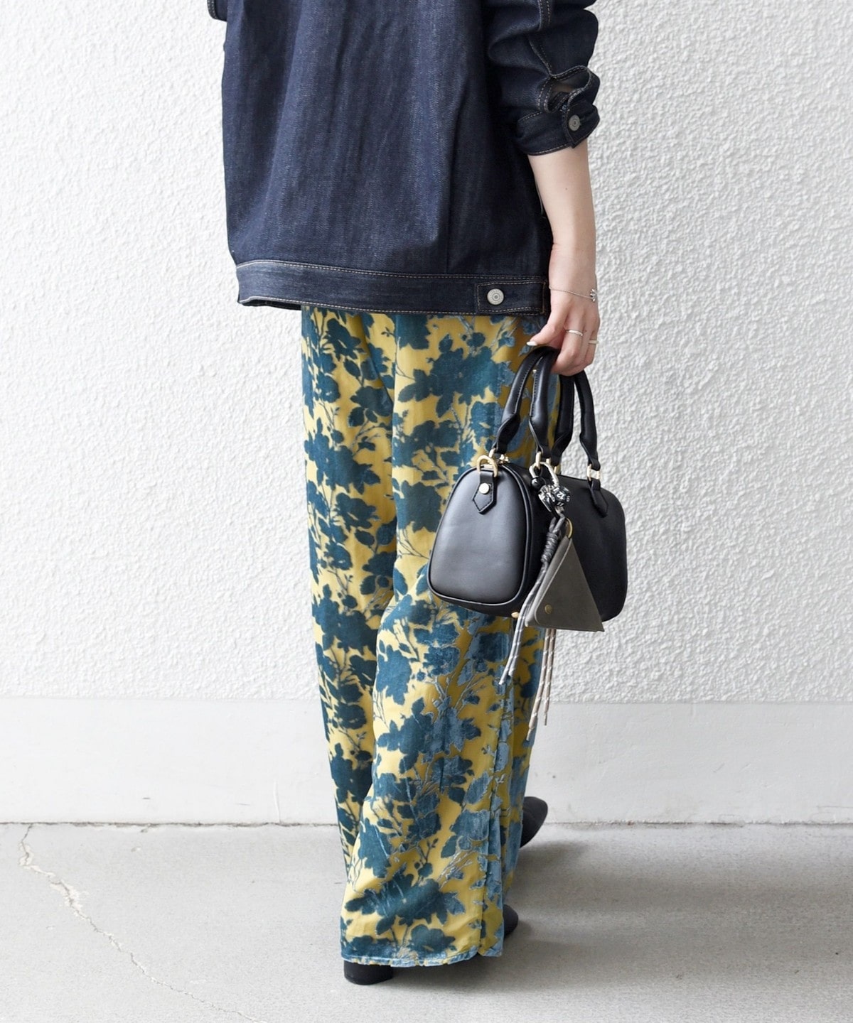 透け感のある生地に浮かぶフラワーモチーフが目を惹くワイドパンツ。