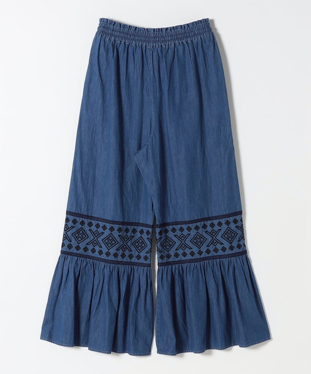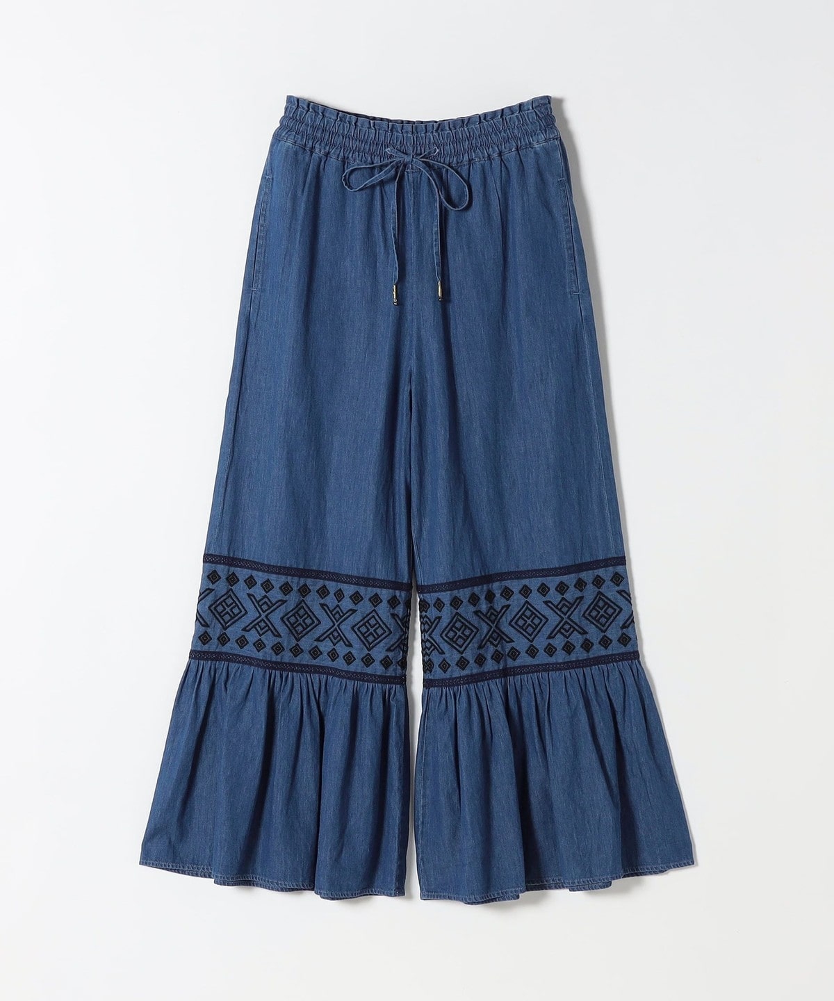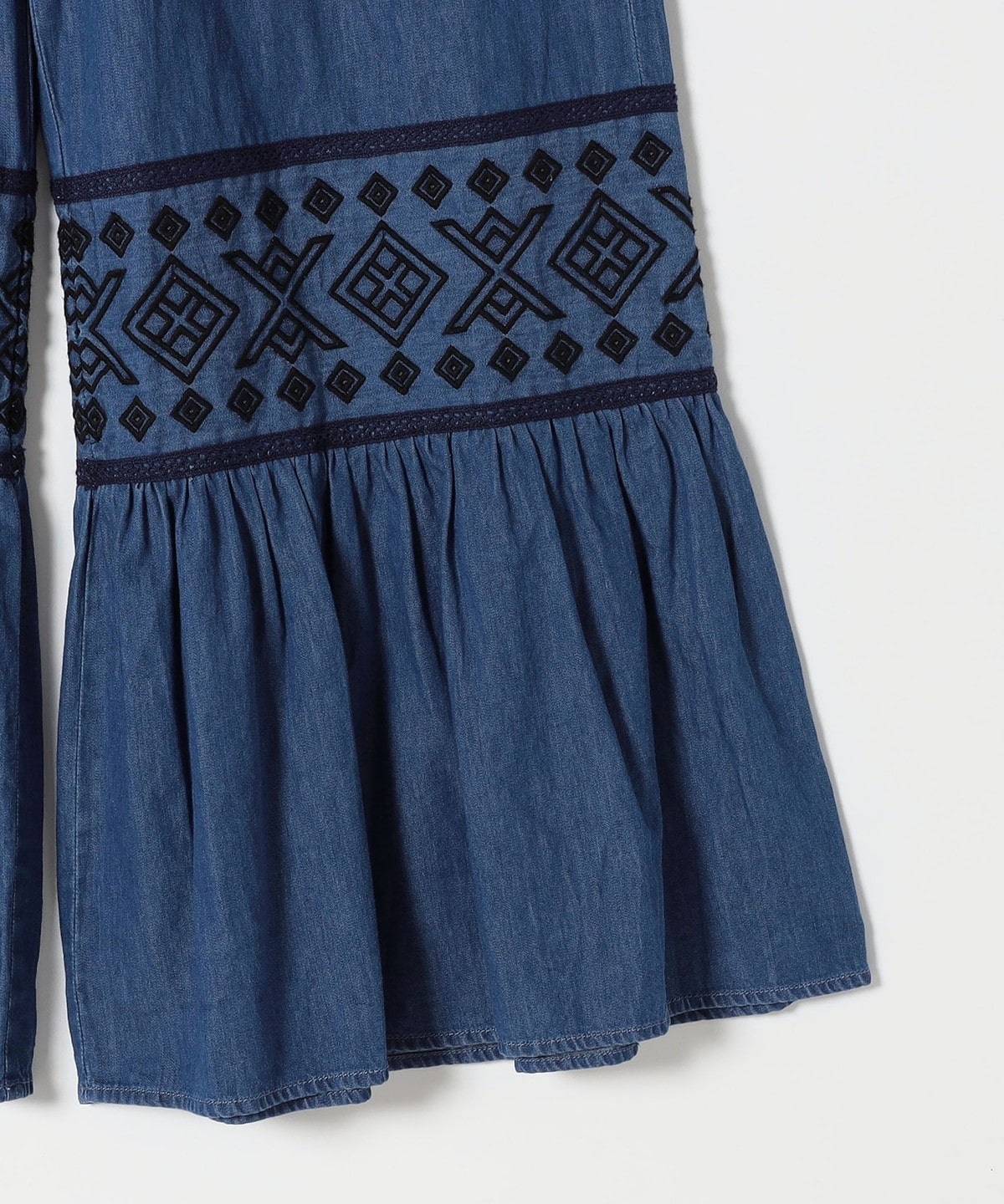 幾何学模様の刺繍とはしごレースの切り替えから広がるたっぷりのギャザーが特徴のワイドパンツ。