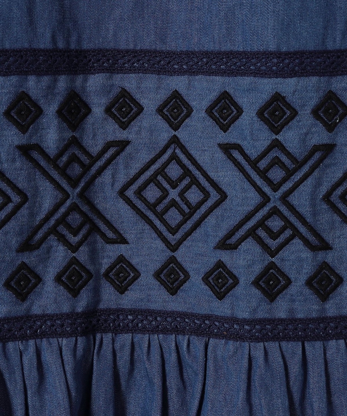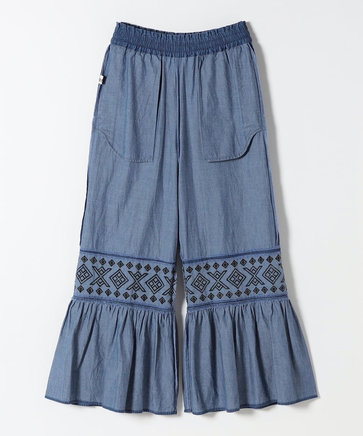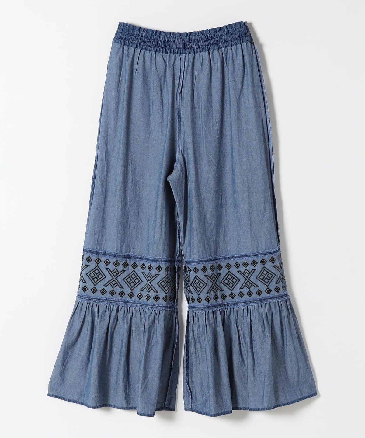幾何学模様の刺繍とはしごレースの切り替えから広がるたっぷりのギャザーが特徴のワイドパンツ。