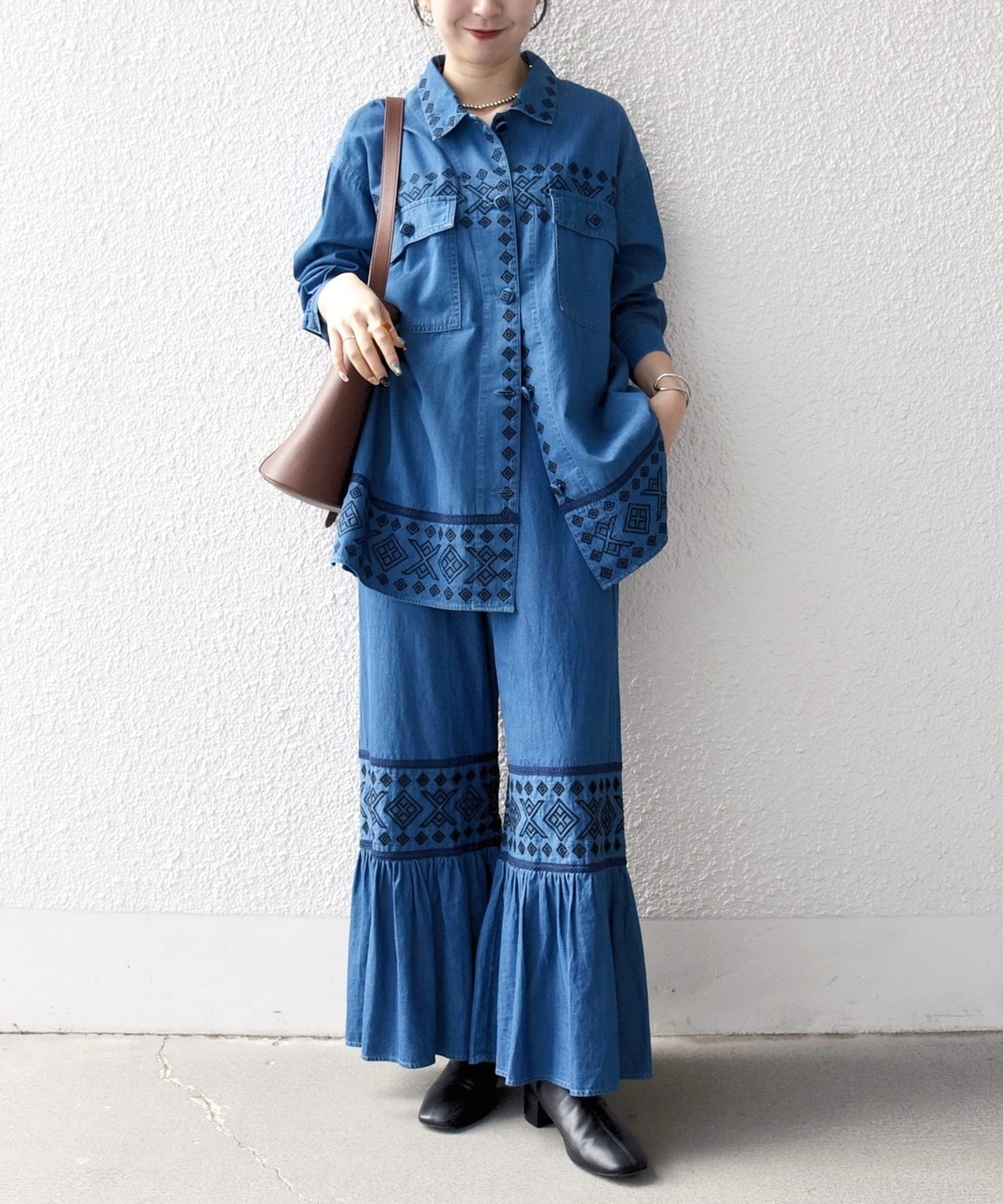 1. bon_meur:〈洗濯機可能〉エンブロイダリー ギャザー フレア デニム イージー パンツ ブルー