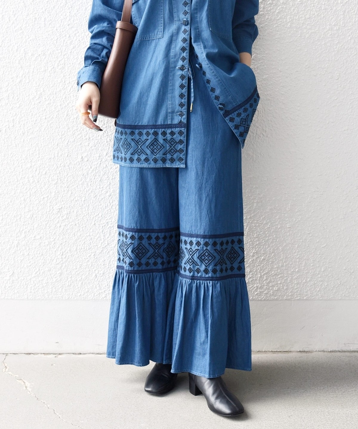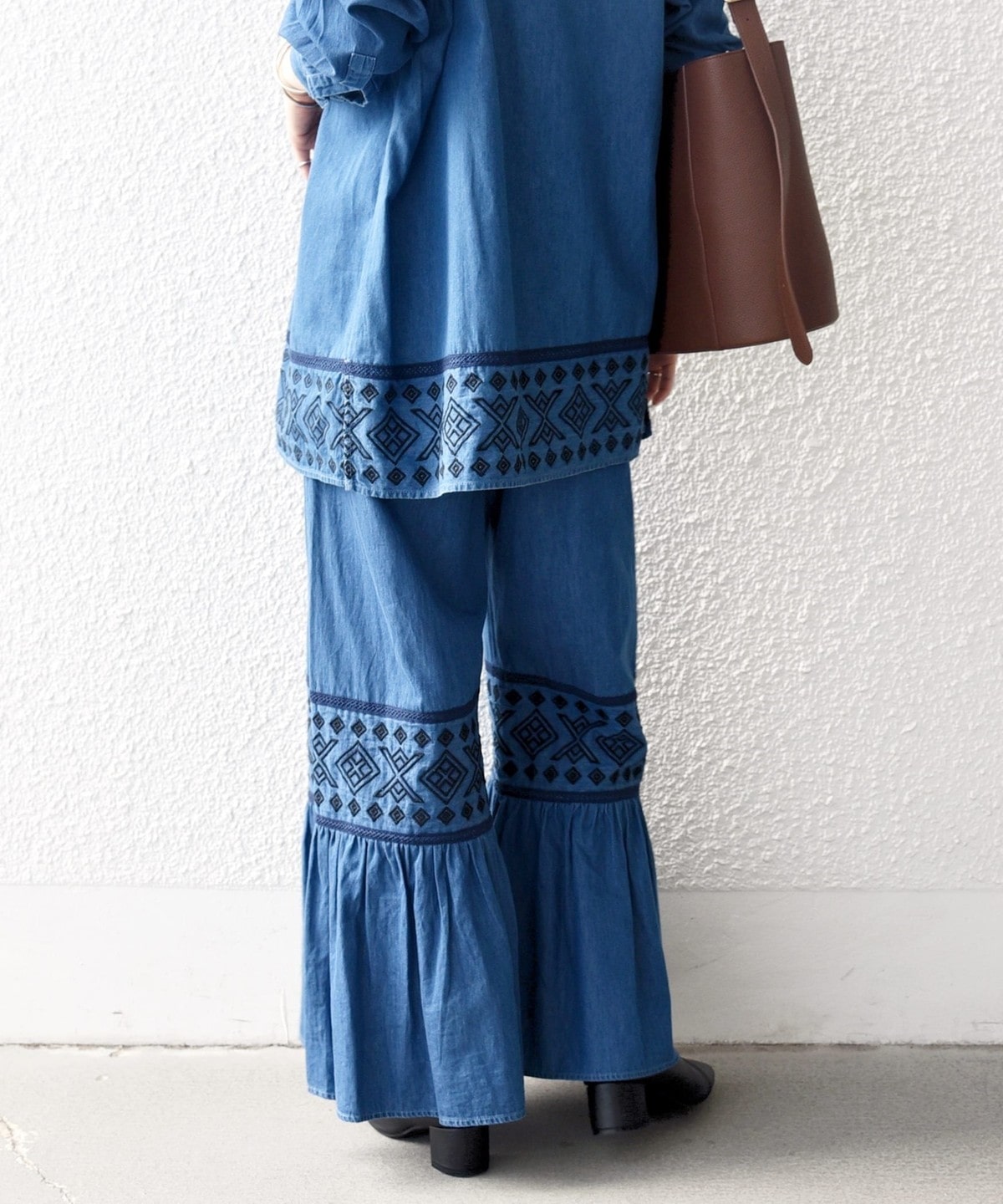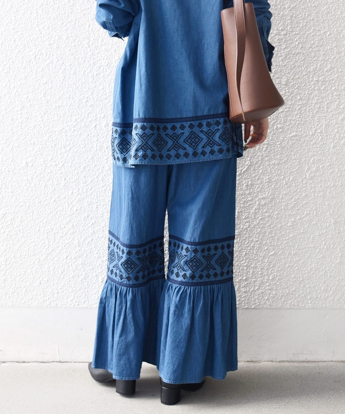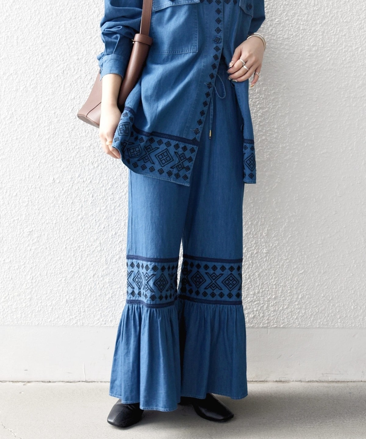 19. bon_meur:〈洗濯機可能〉エンブロイダリー ギャザー フレア デニム イージー パンツ