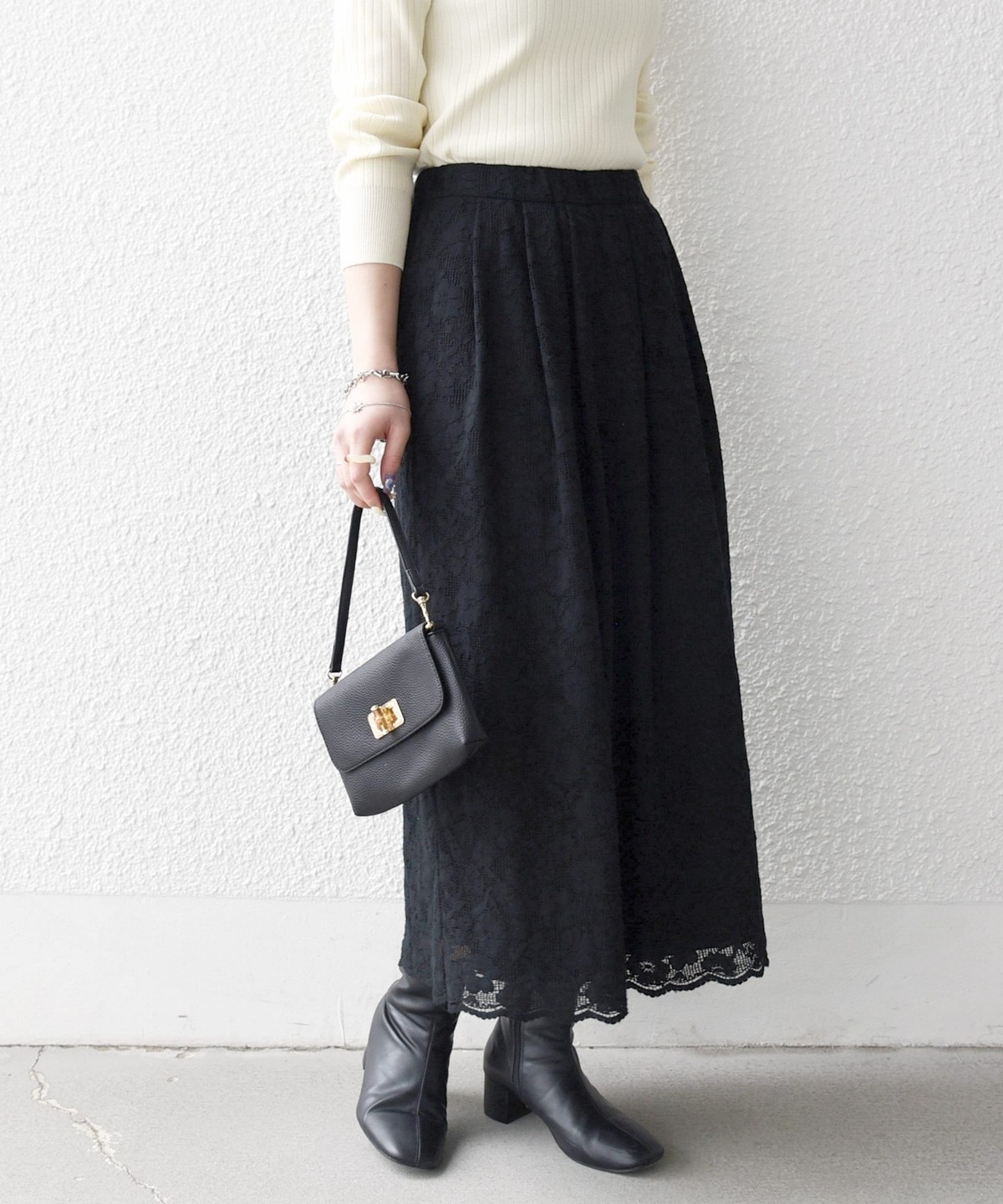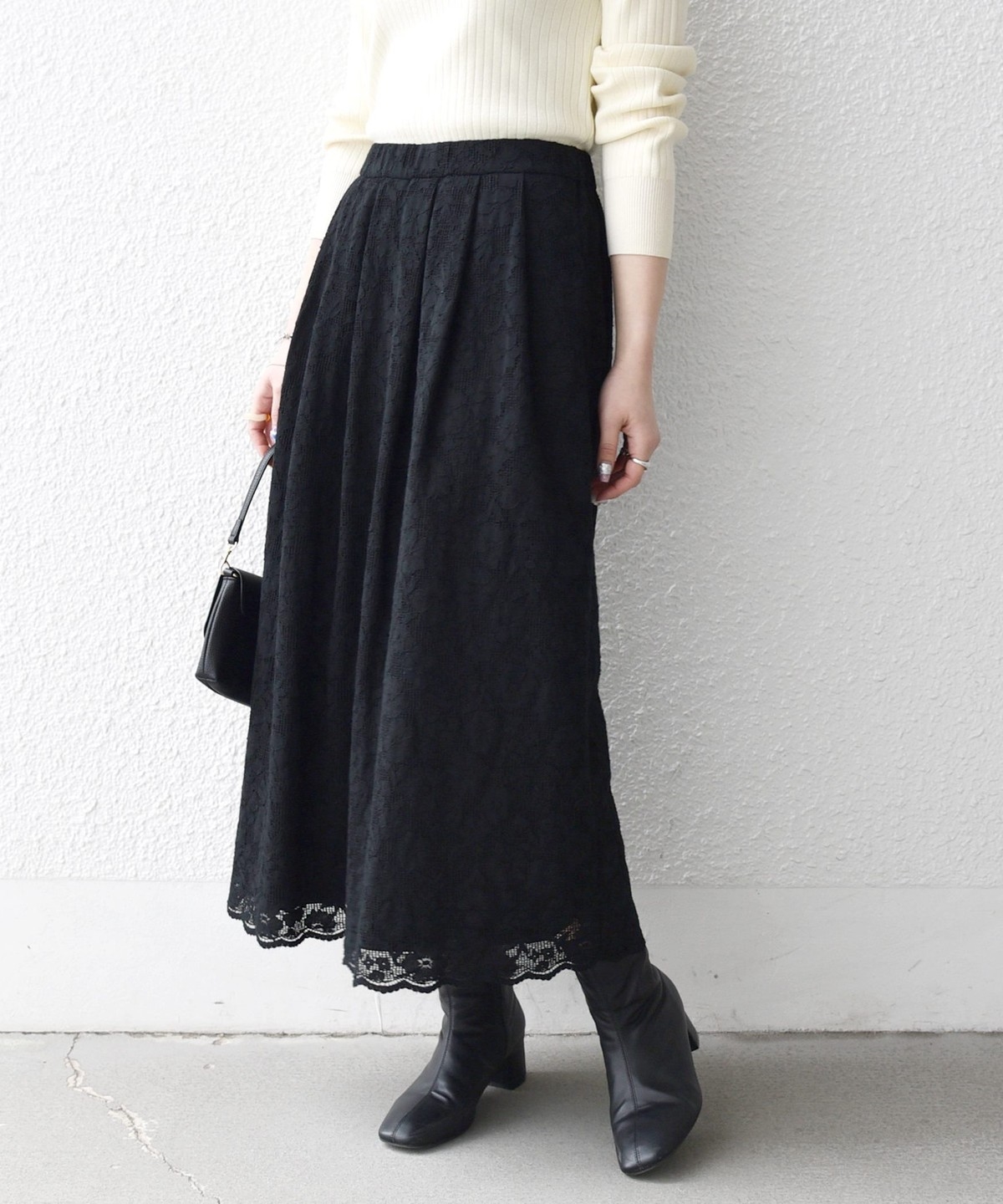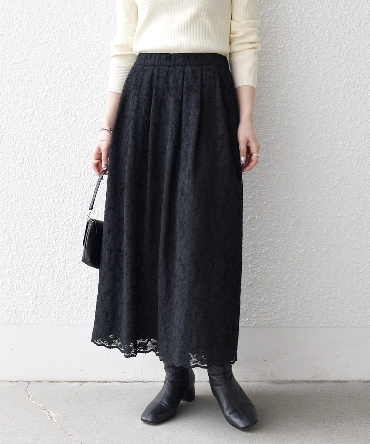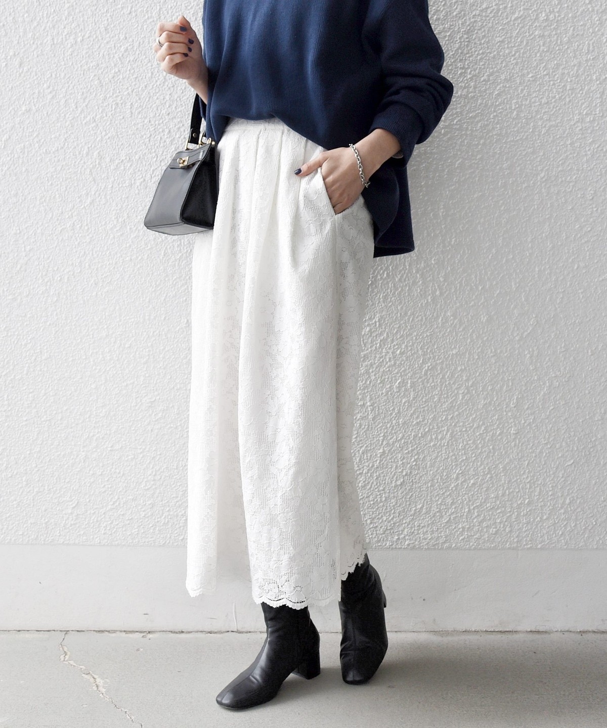 フラワーレースを主役に、シンプルなトップスと合わせたスタイリングがおすすめ。