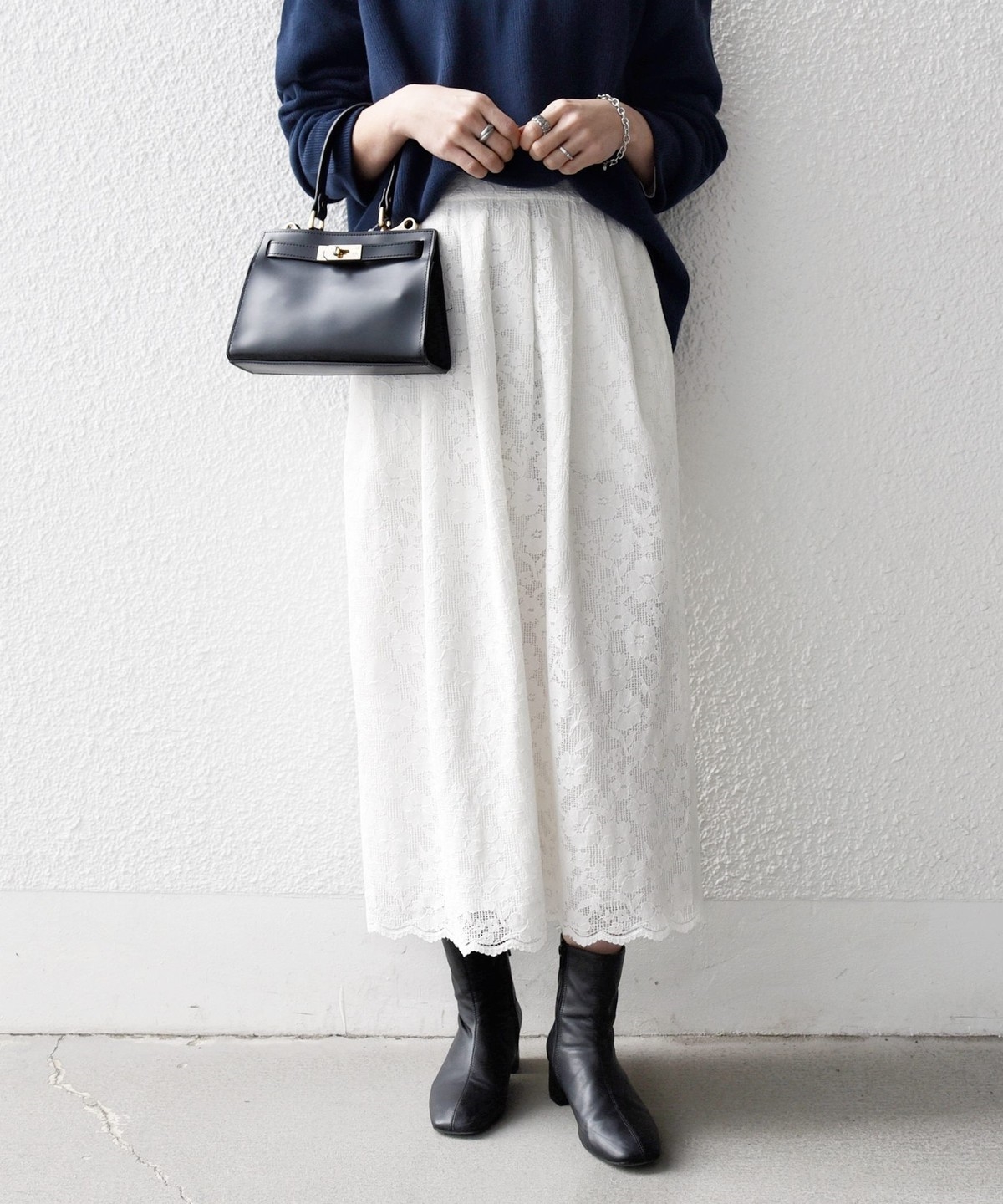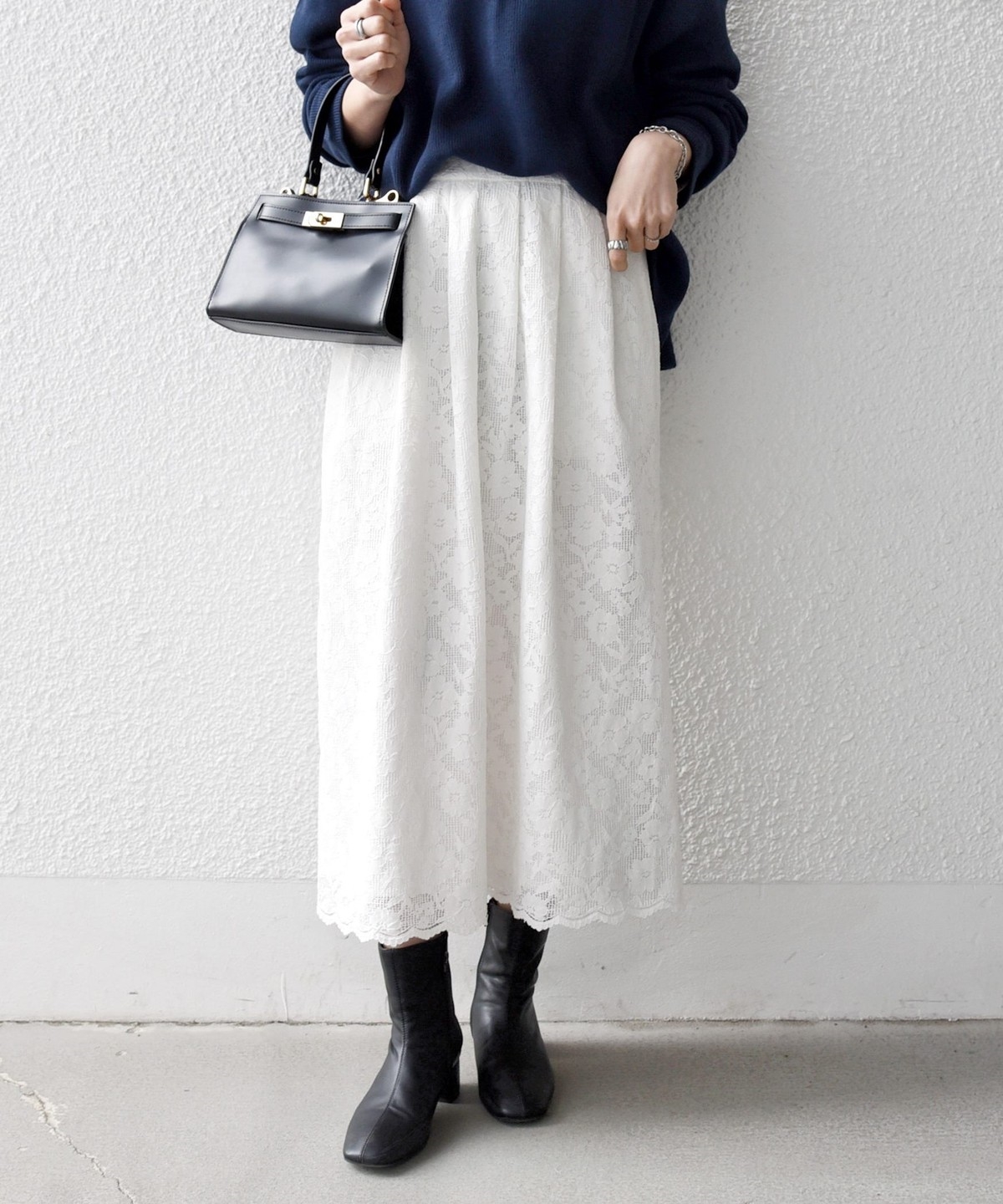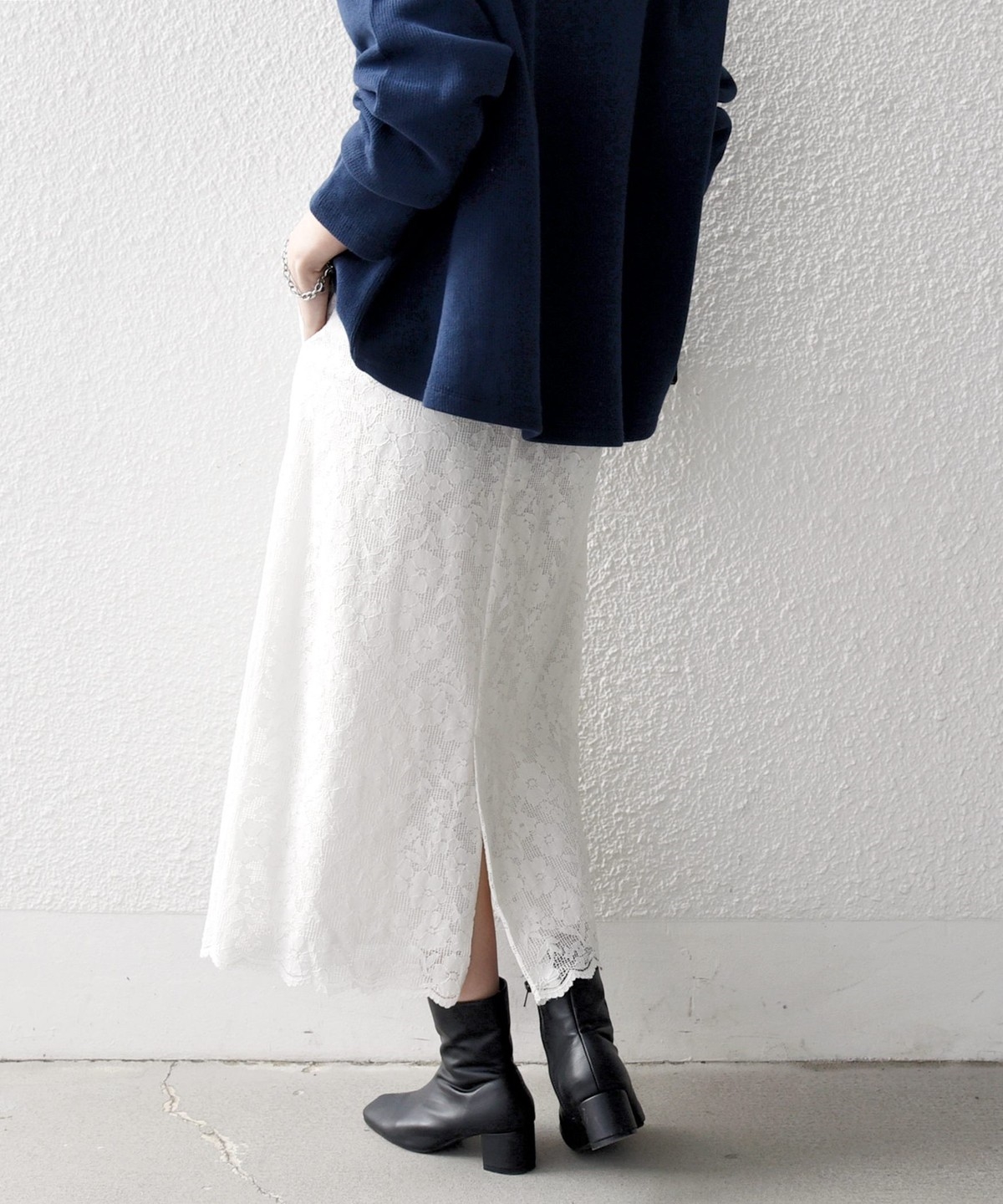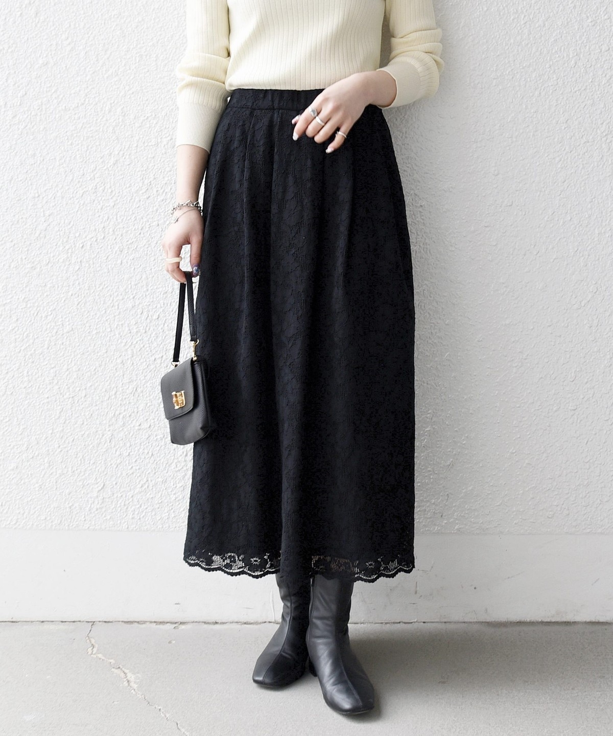 フラワーレースを主役に、シンプルなトップスと合わせたスタイリングがおすすめ。