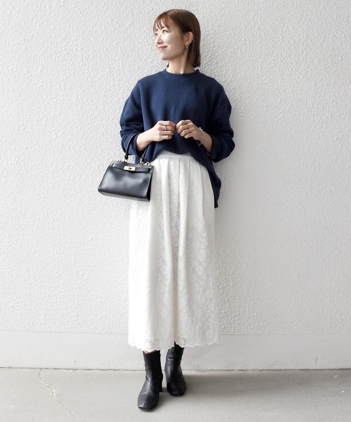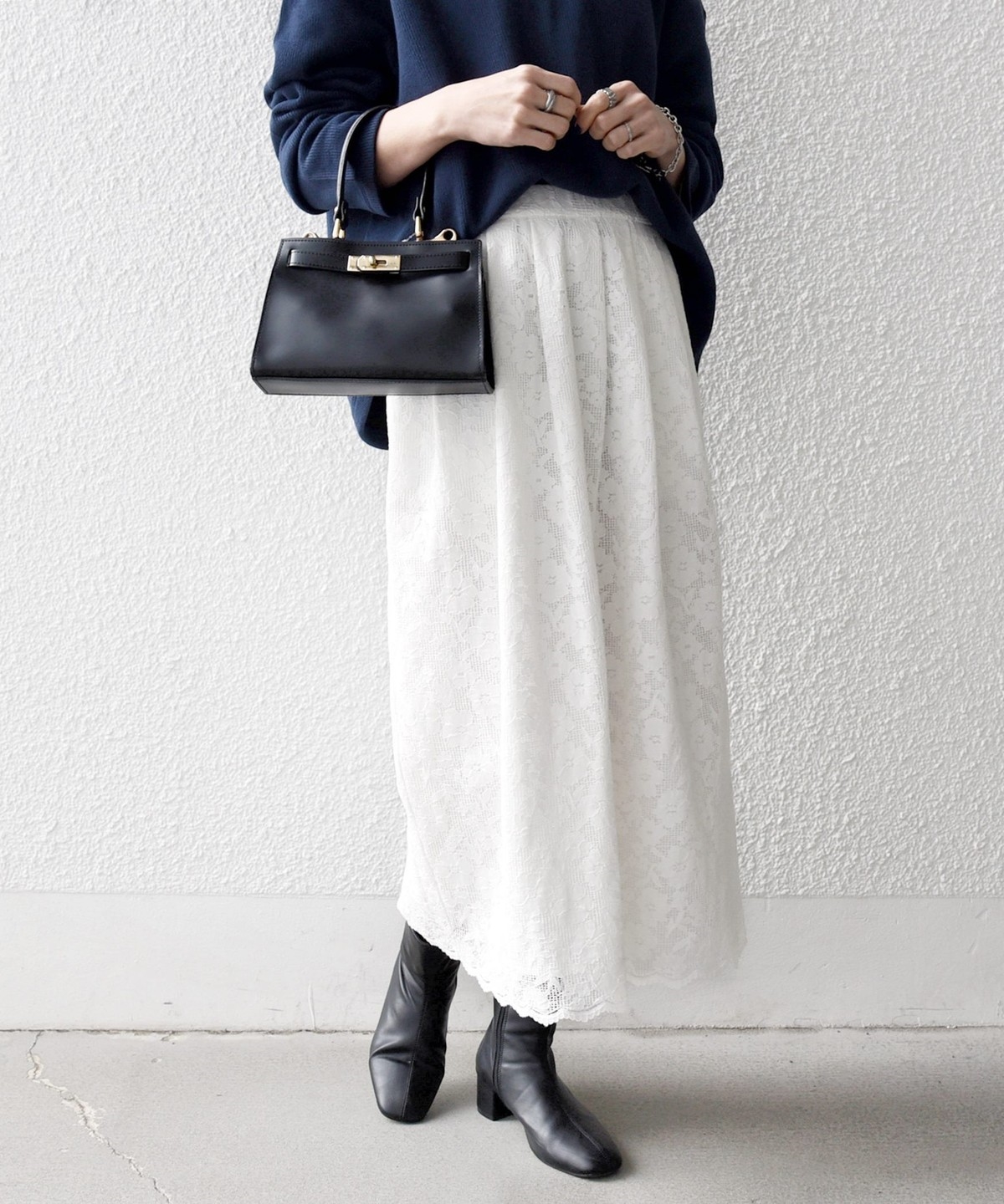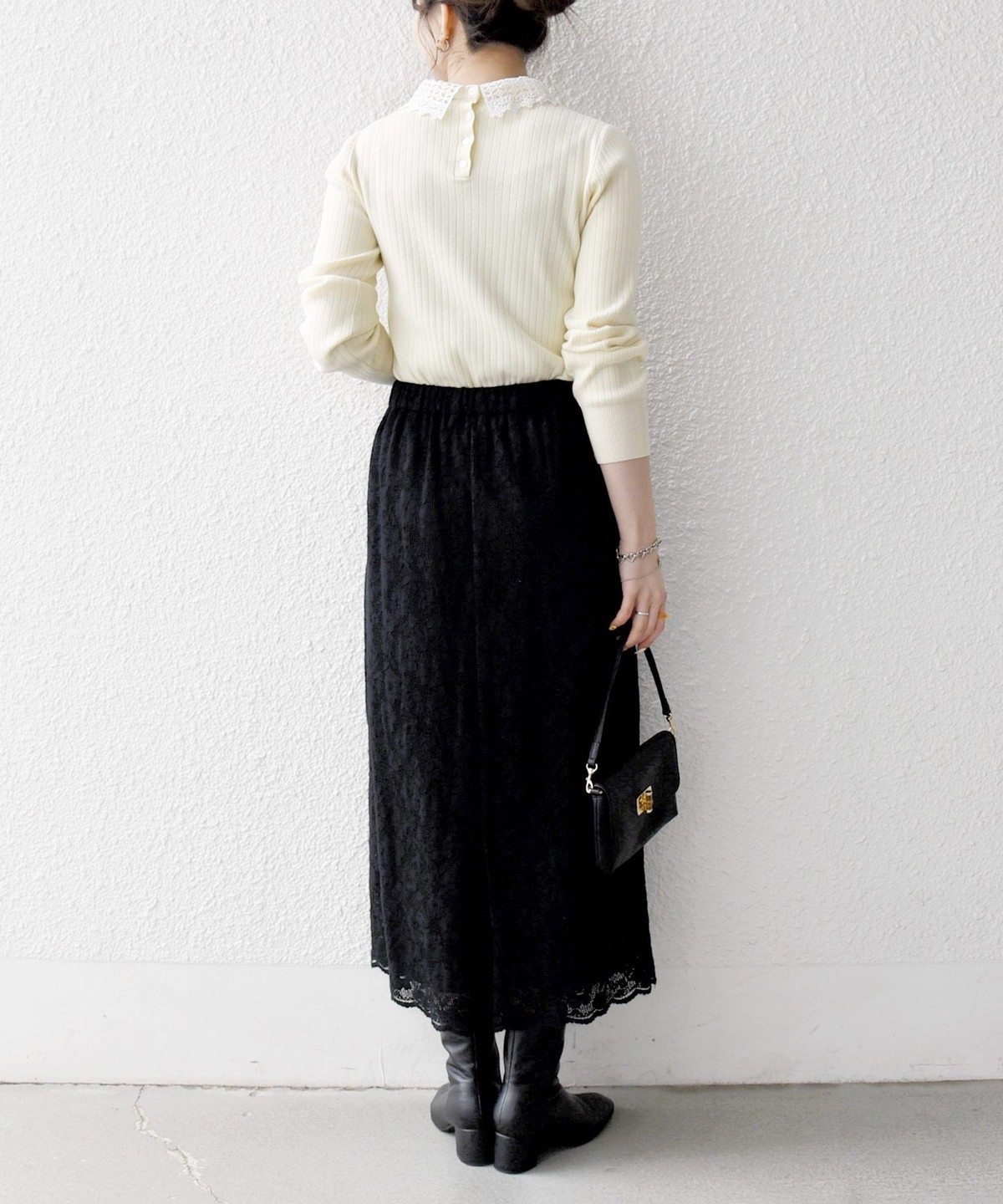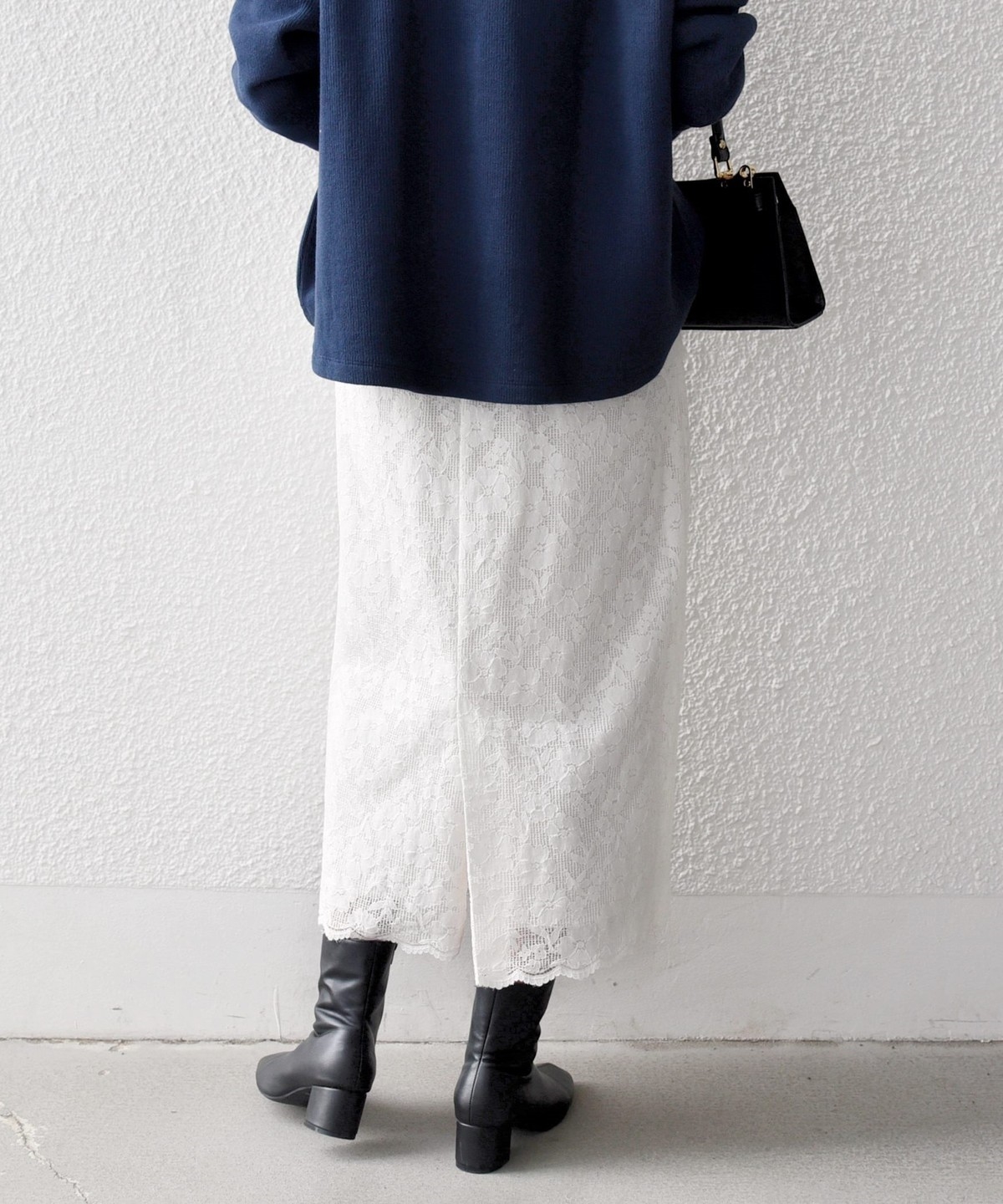 フラワーレースを主役に、シンプルなトップスと合わせたスタイリングがおすすめ。