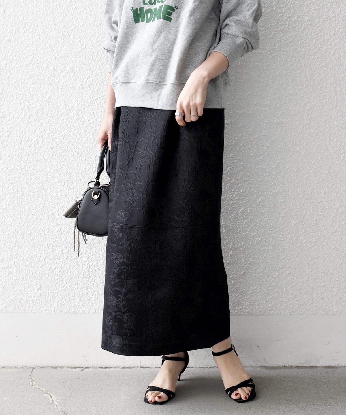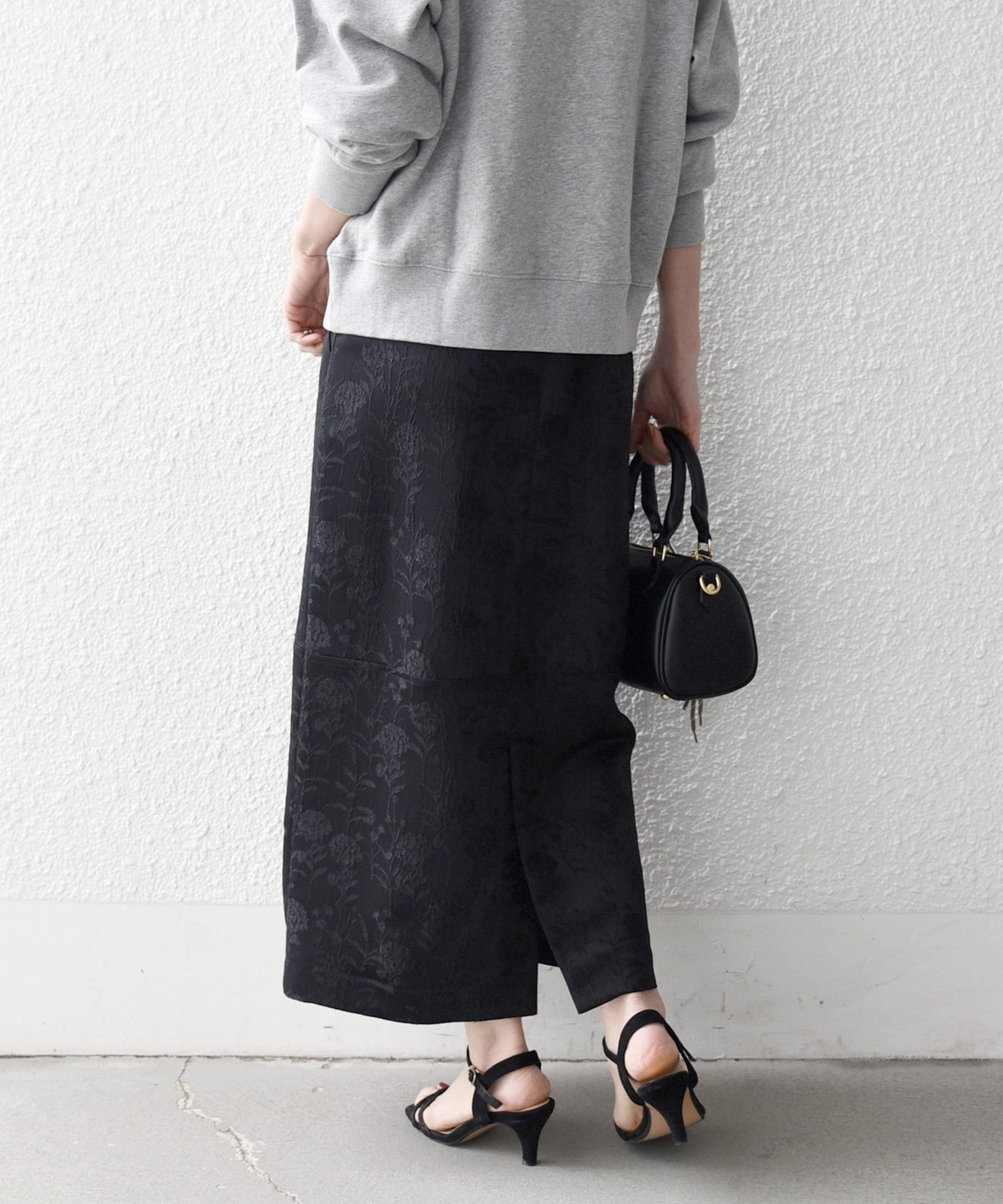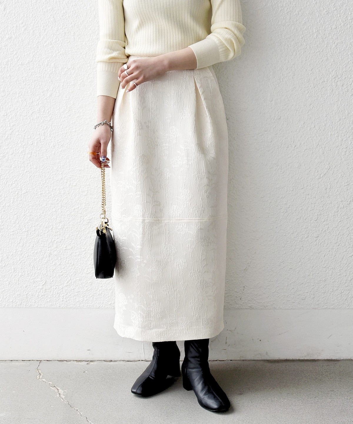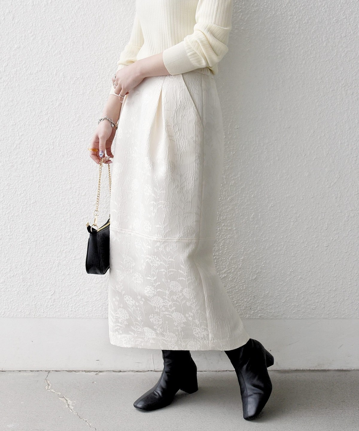 光の当たり方によって表情が変わりフラワー柄が上品に映える、ジャカードスカート。