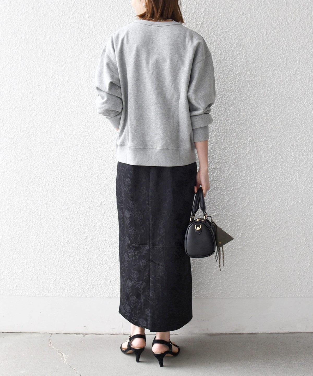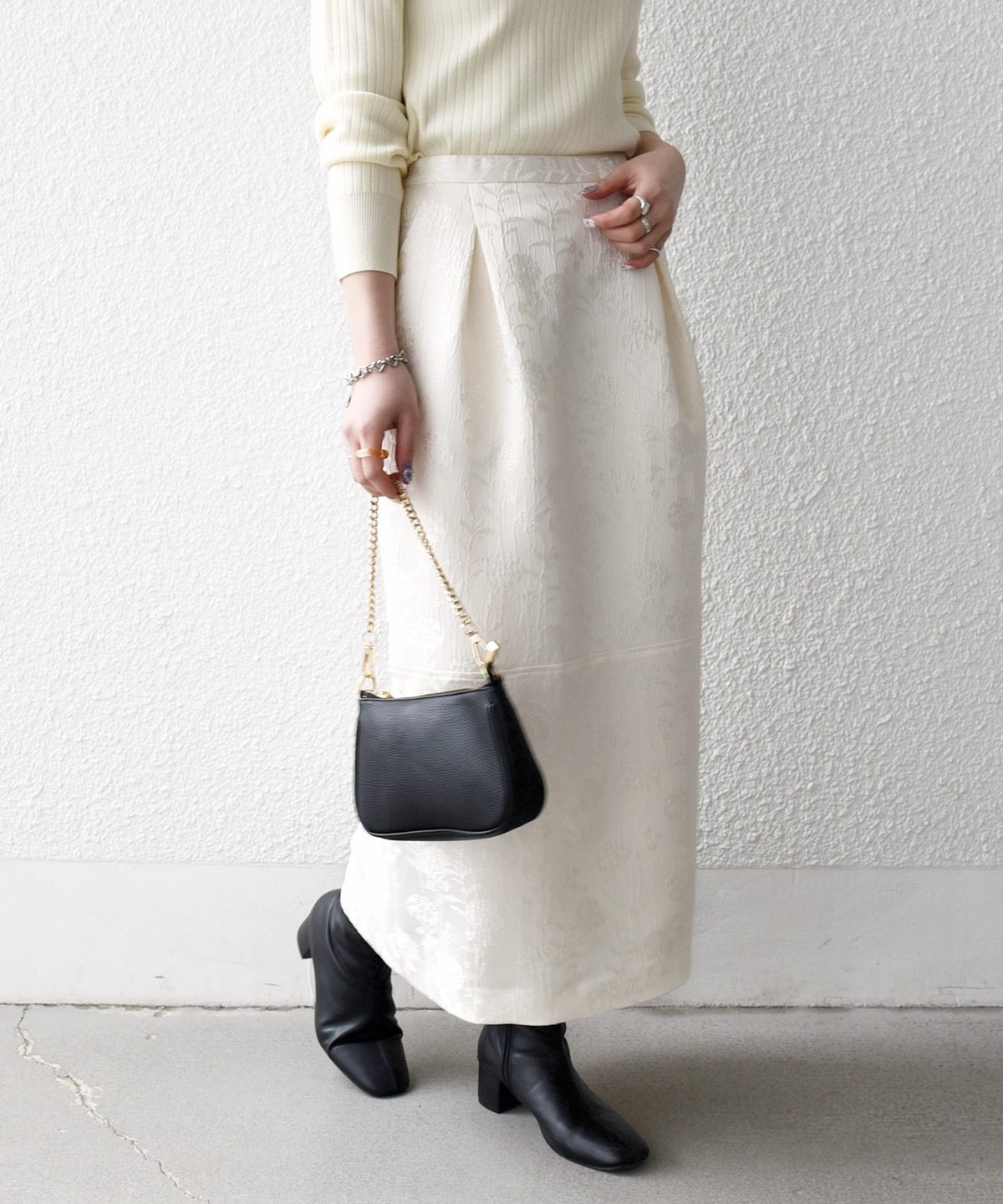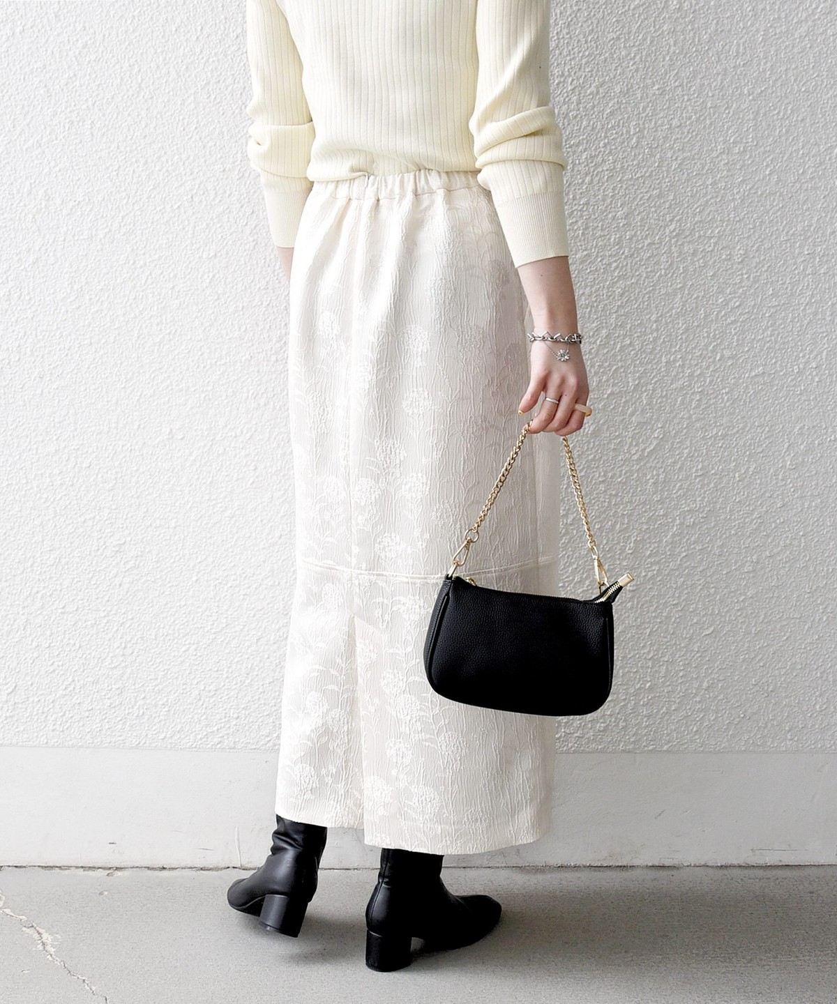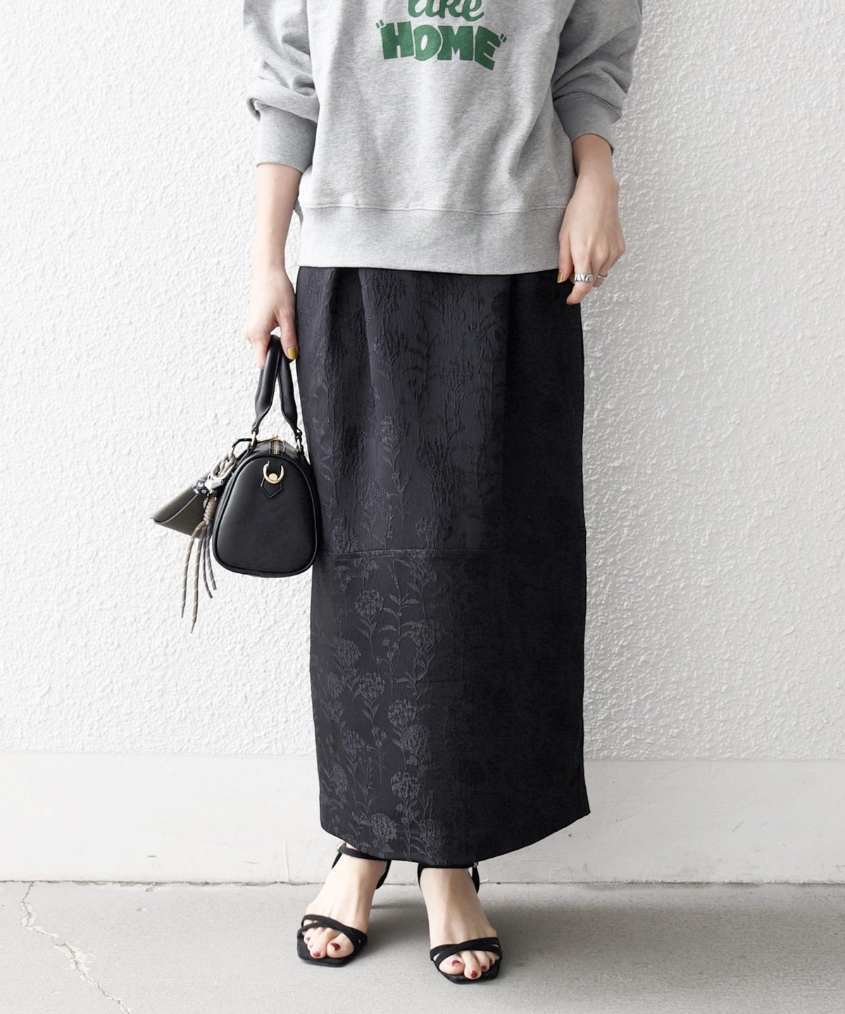 光の当たり方によって表情が変わりフラワー柄が上品に映える、ジャカードスカート。