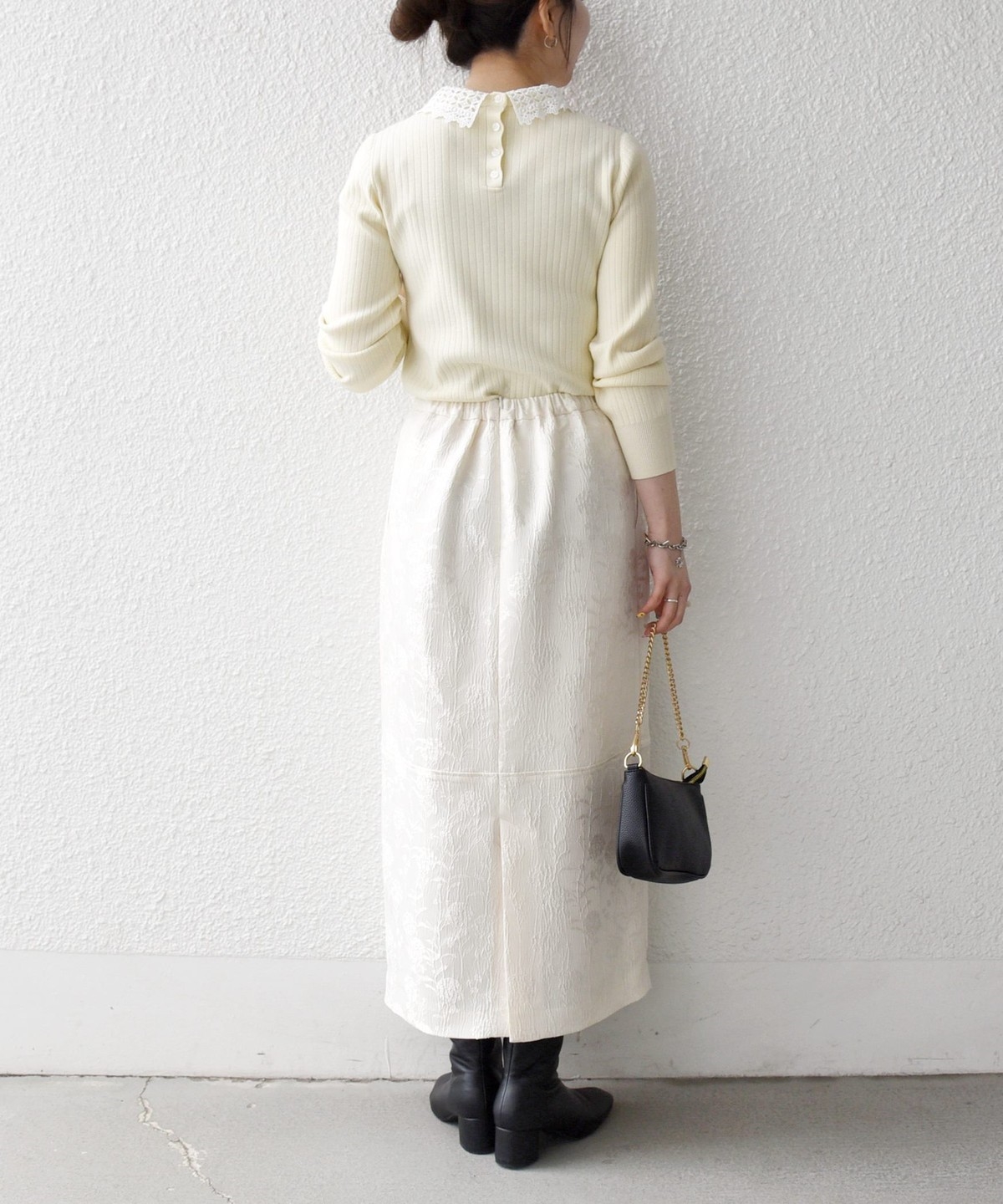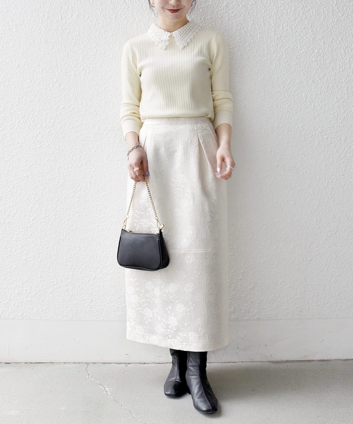 立体感のある表情がさりげない華やかさをプラスし、オンオフ兼用で幅広いシーンに活躍してくれます。