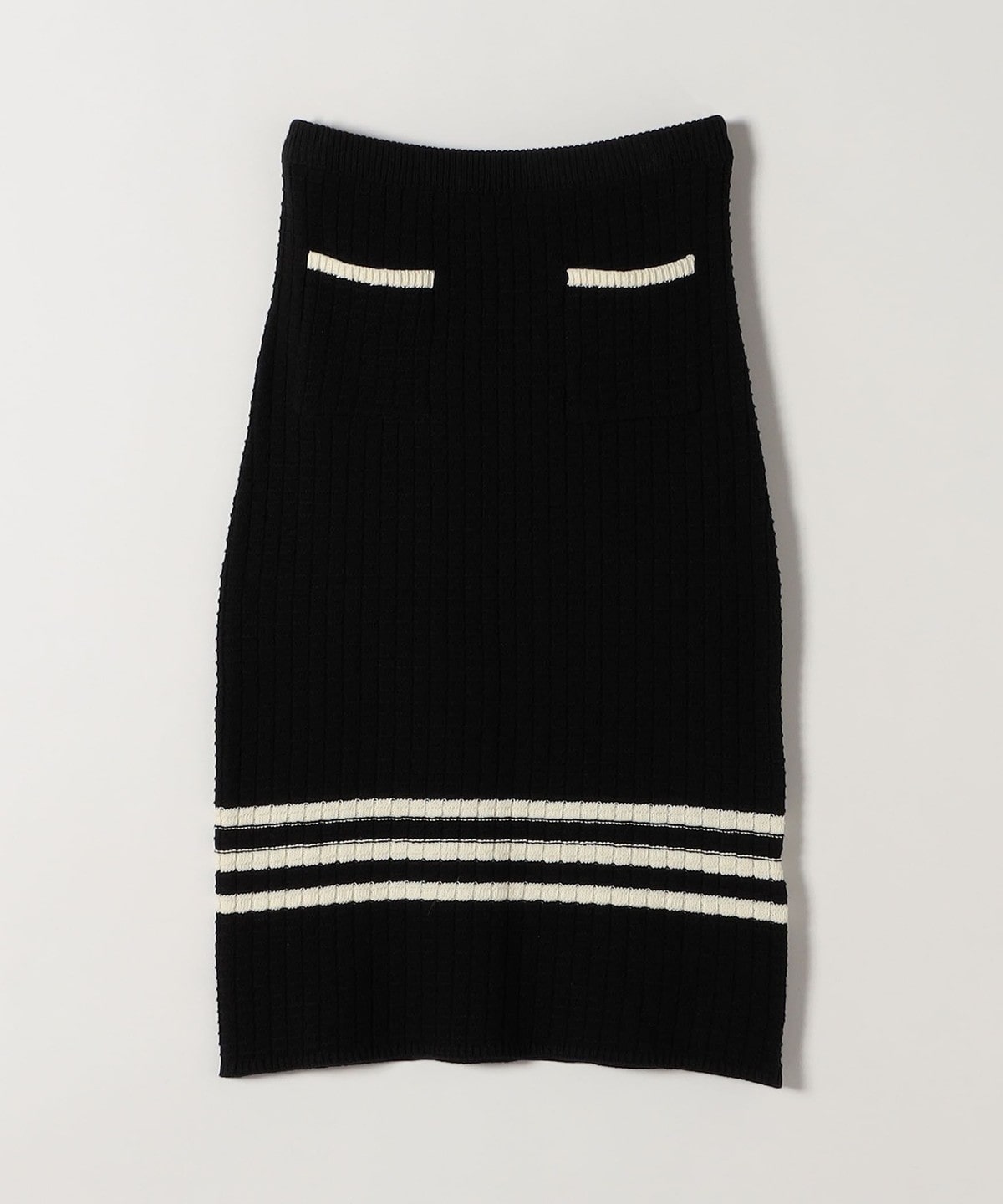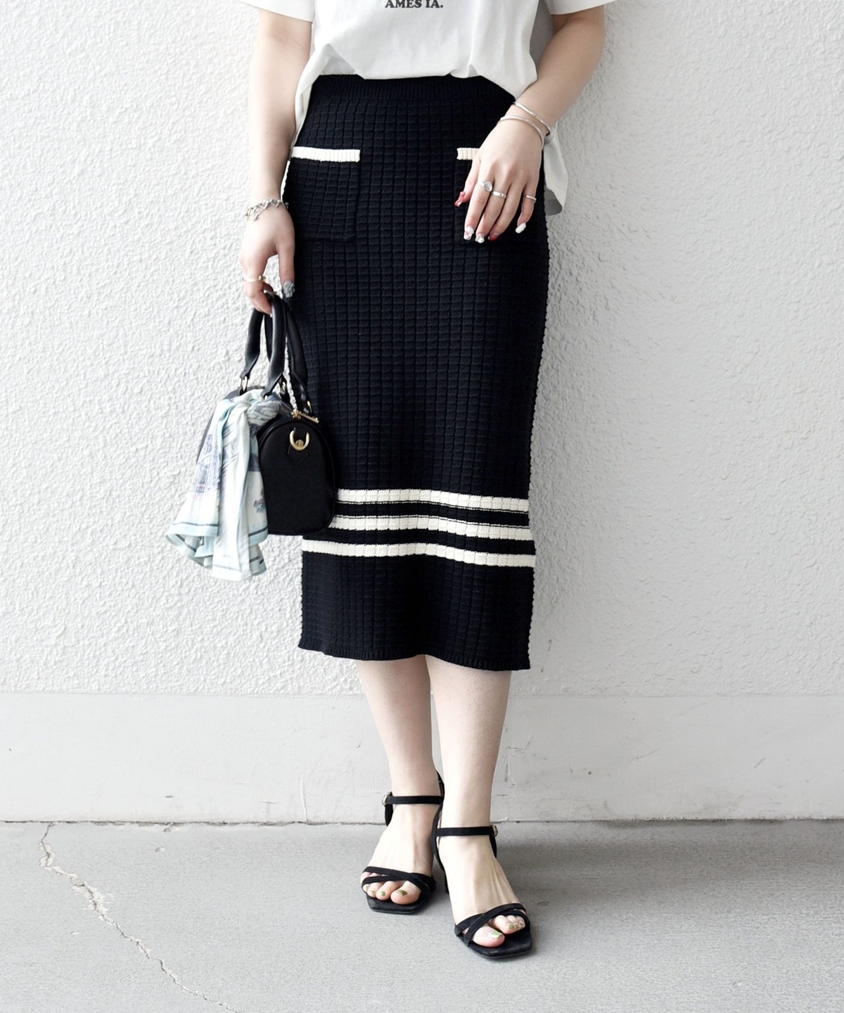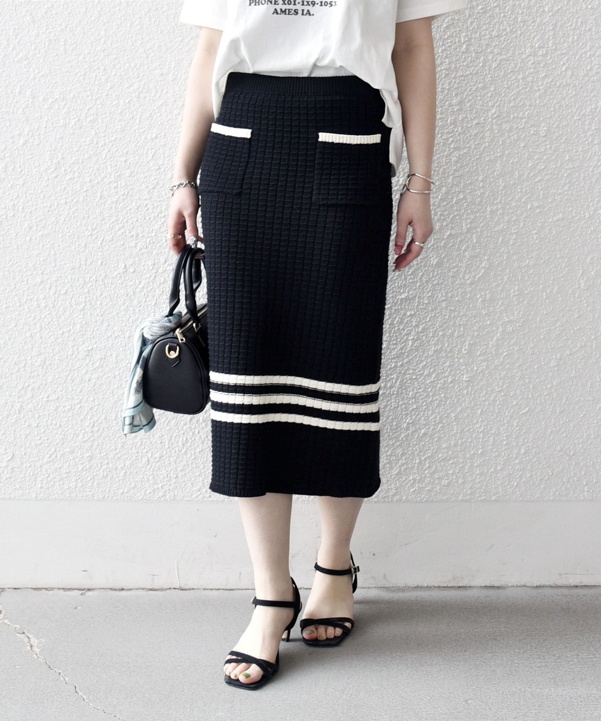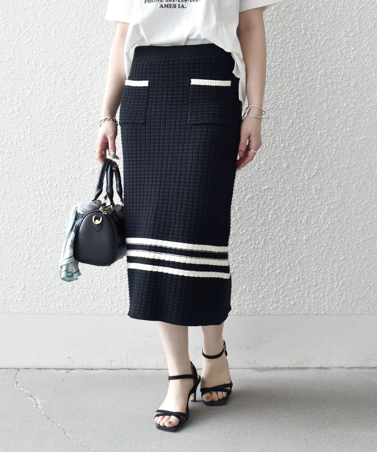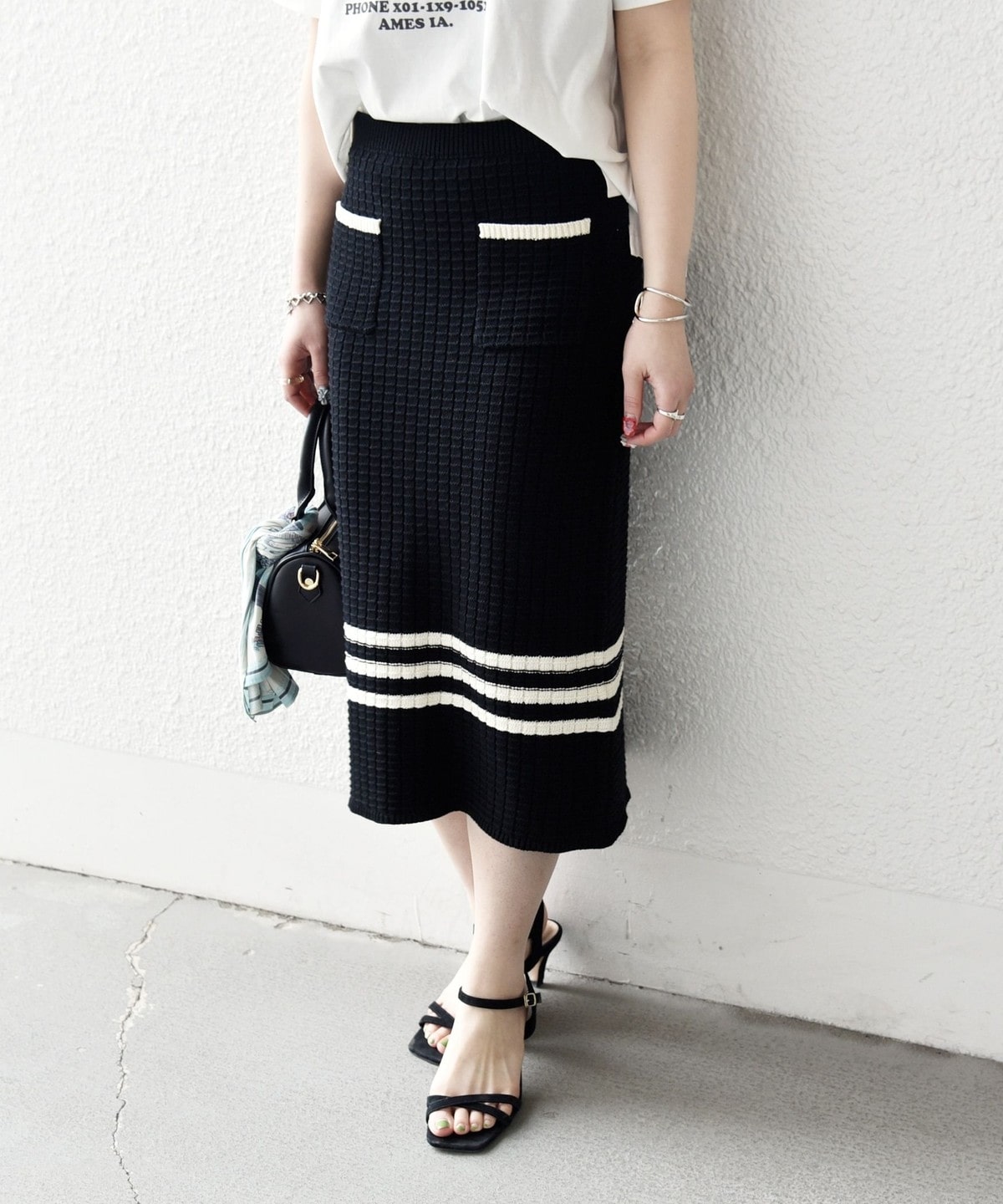 裾とポケットのバイカラーラインが目を惹く、ニットスカート。