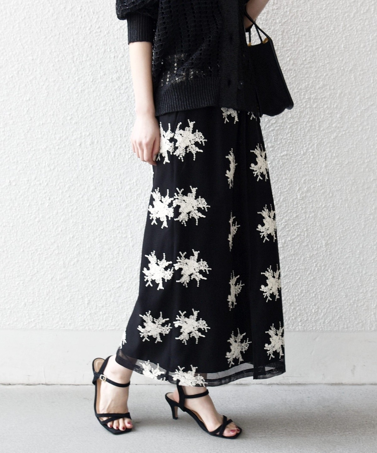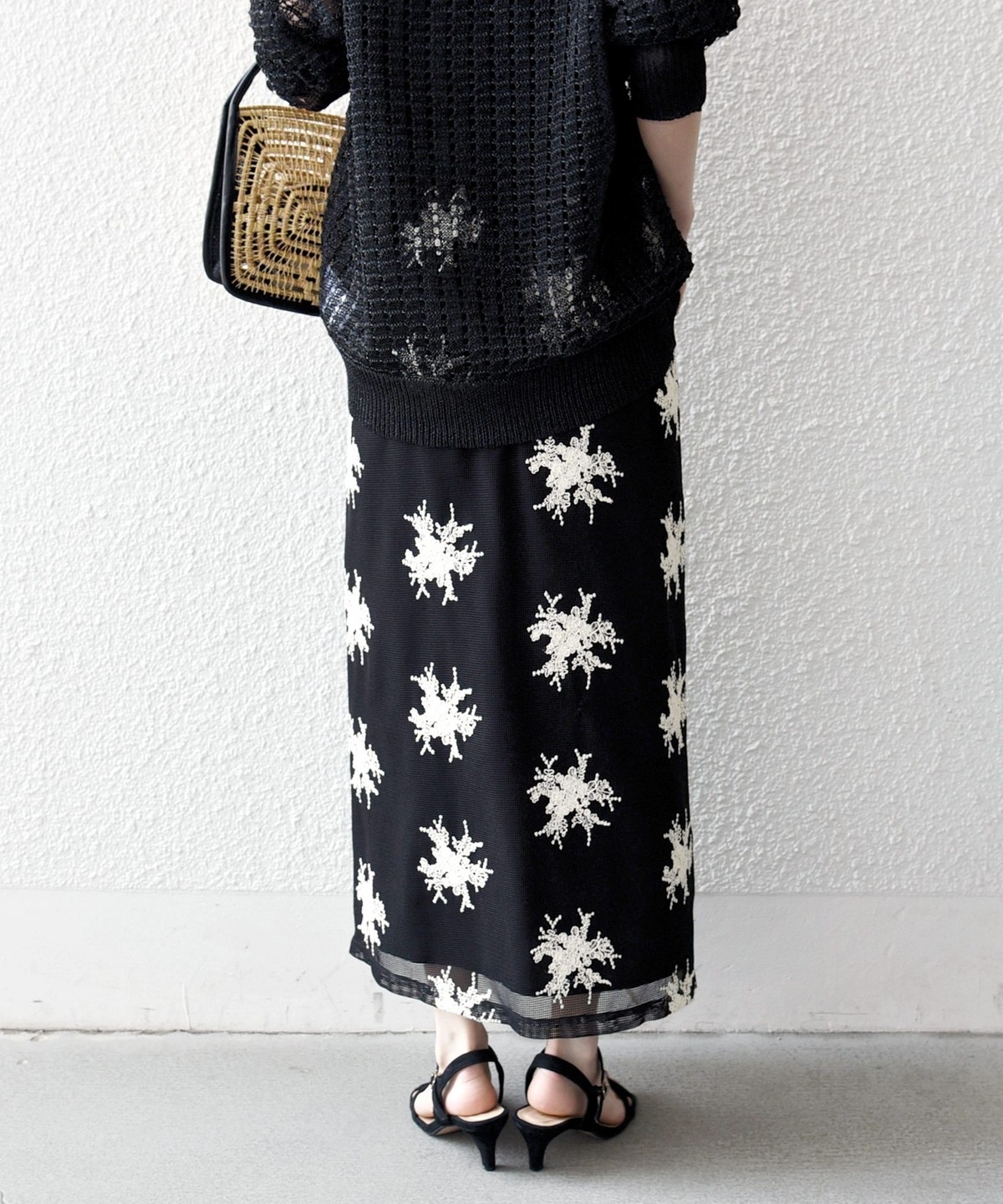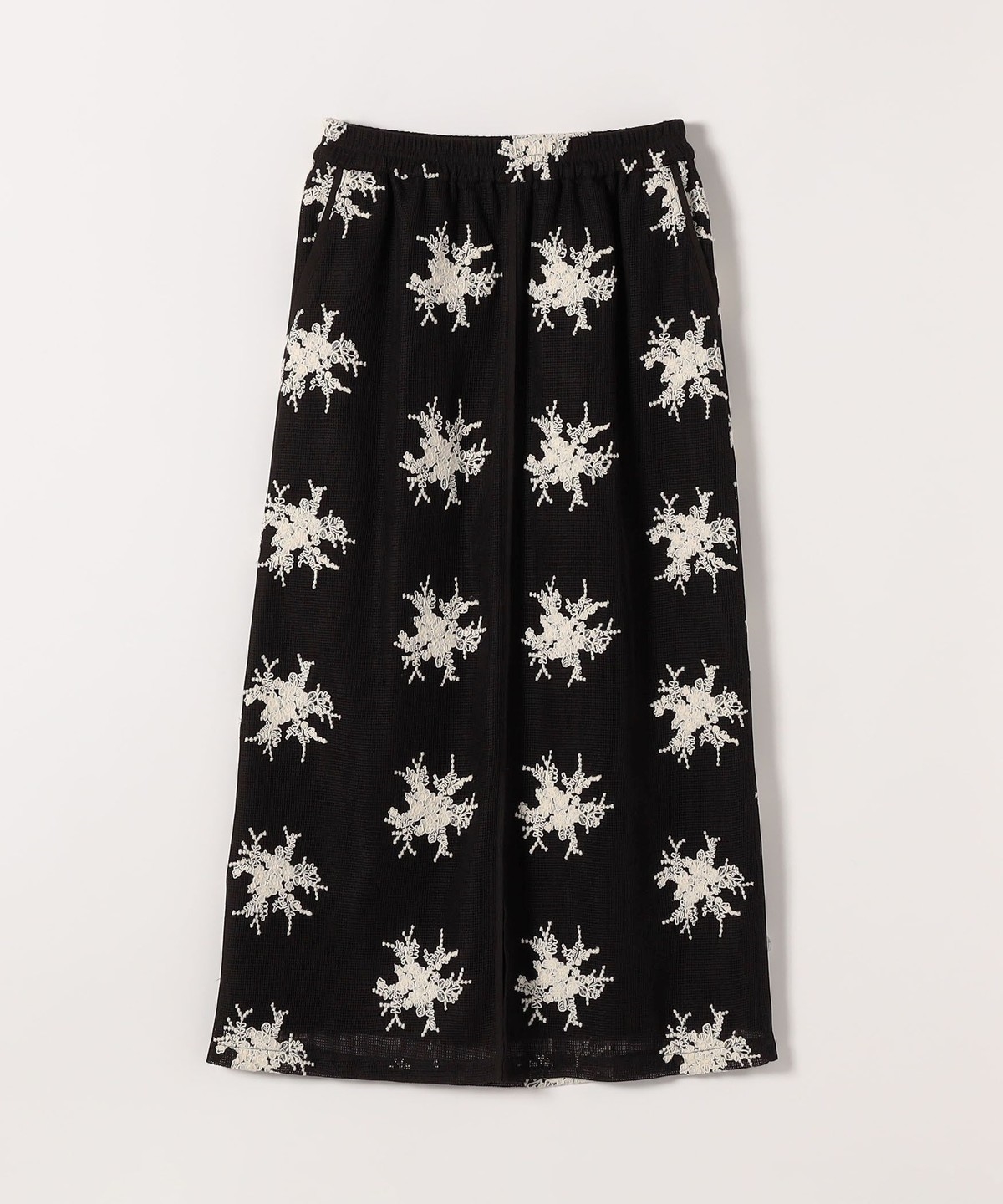 細いコード状の紐を使って立体的なフラワーモチーフを表現した、華やかなタイトスカート。