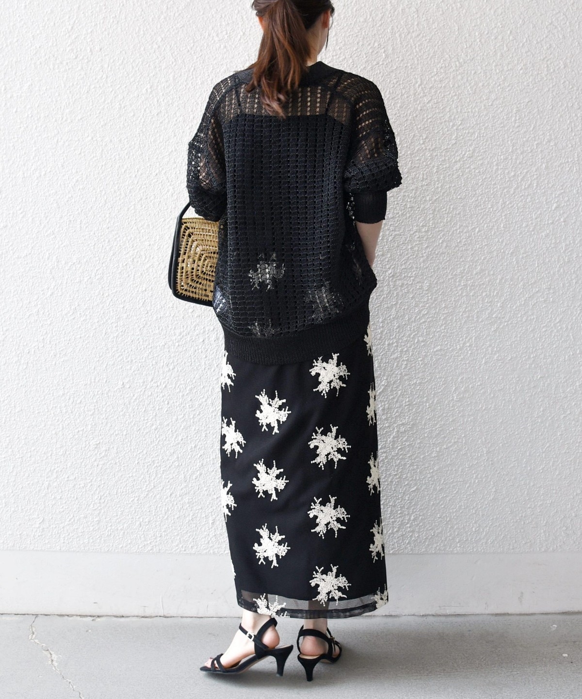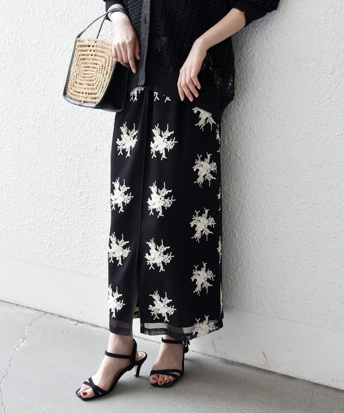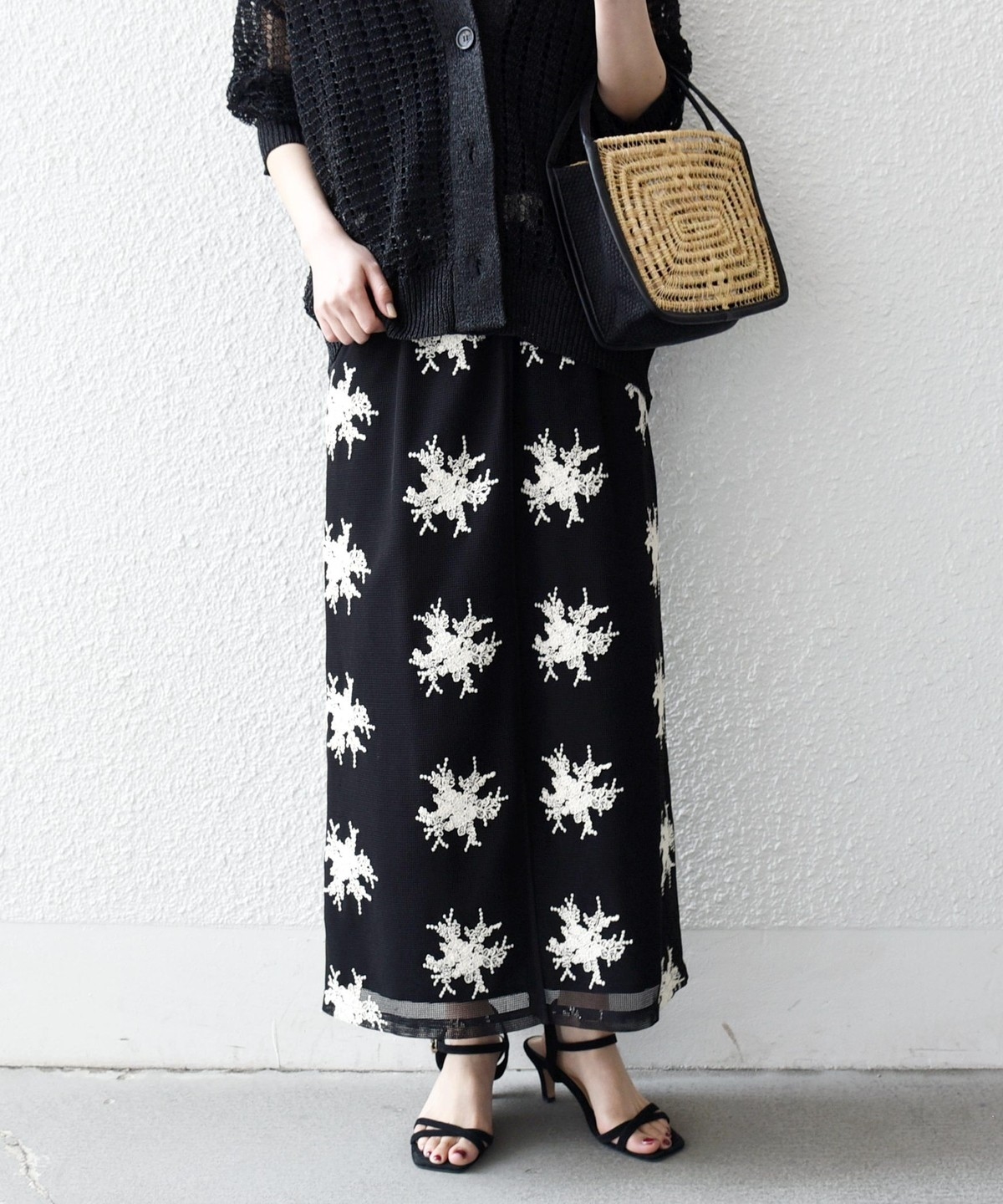 細いコード状の紐を使って立体的なフラワーモチーフを表現した、華やかなタイトスカート。