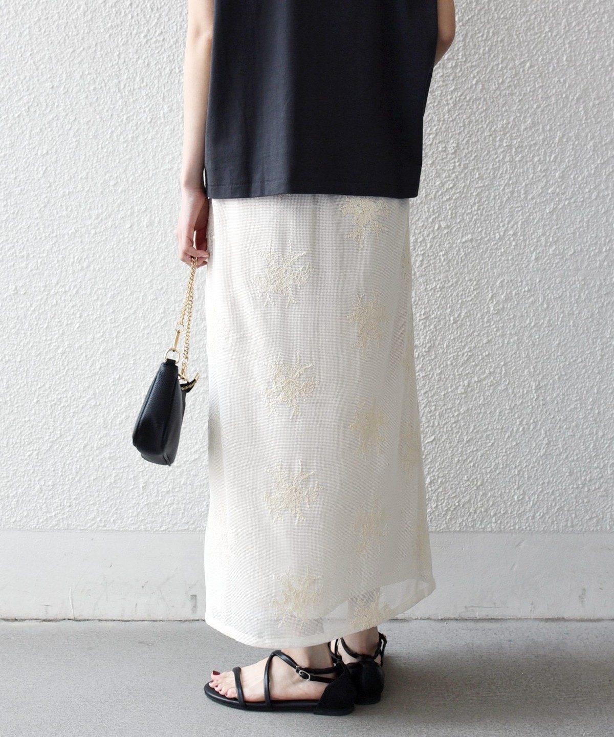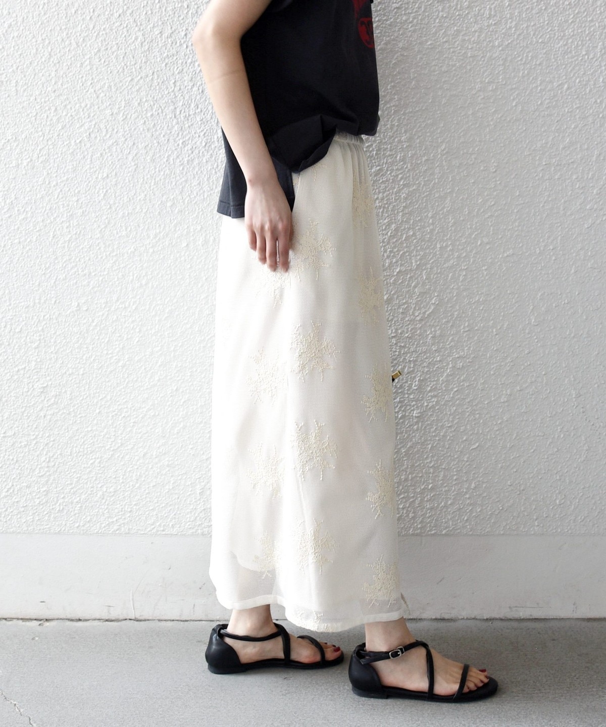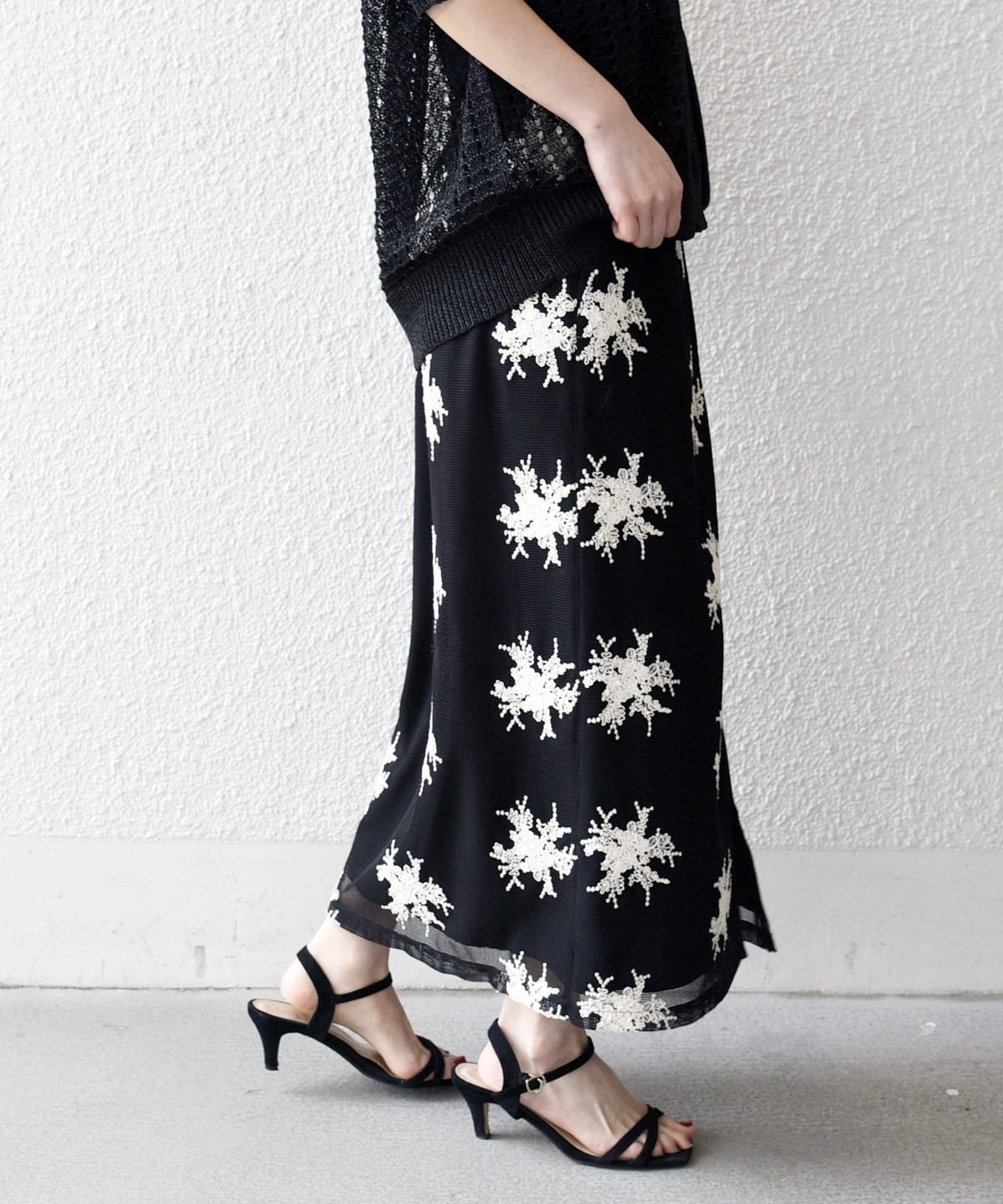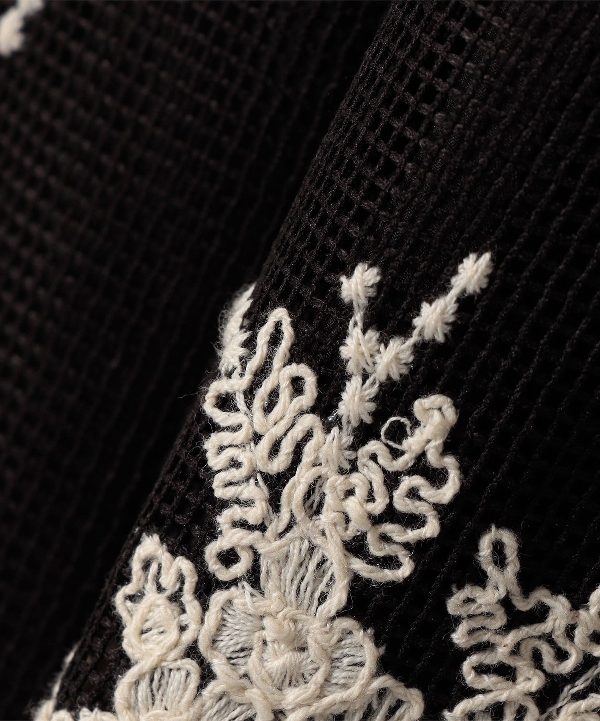 メッシュ組織の上から繊細な花柄を刺繍した素材を使用。
