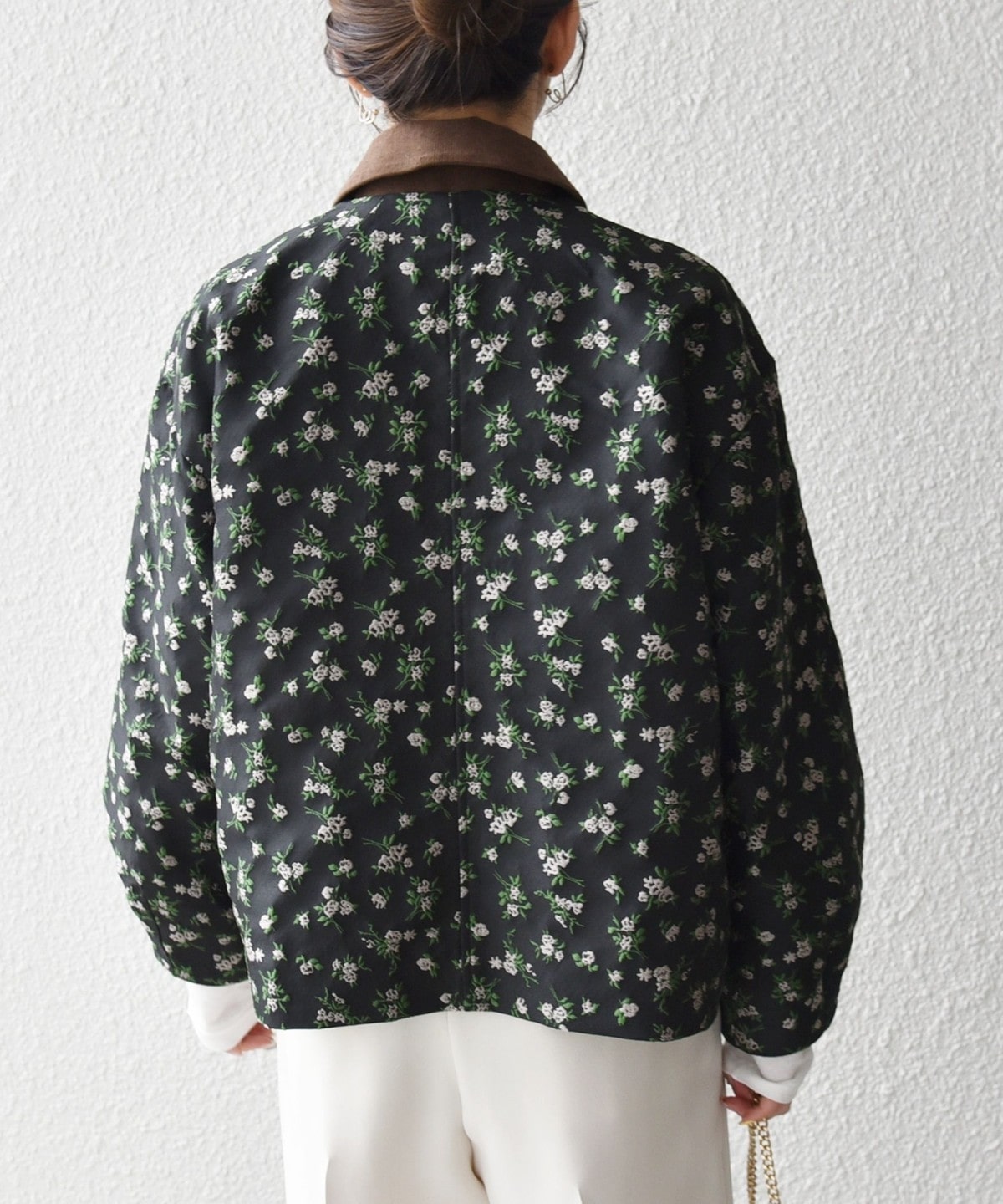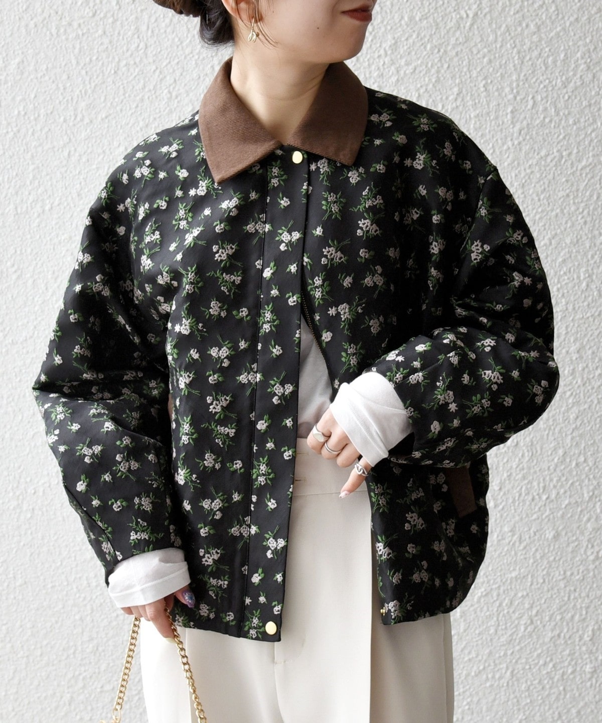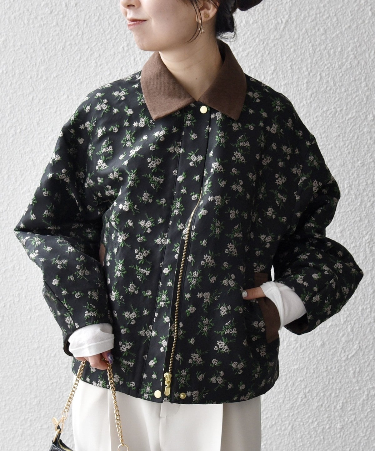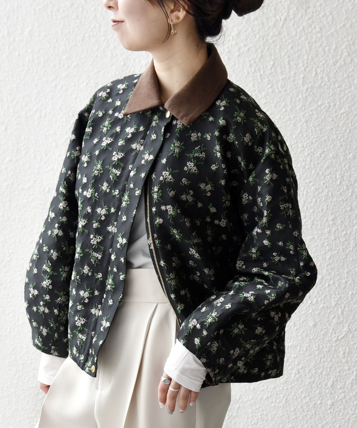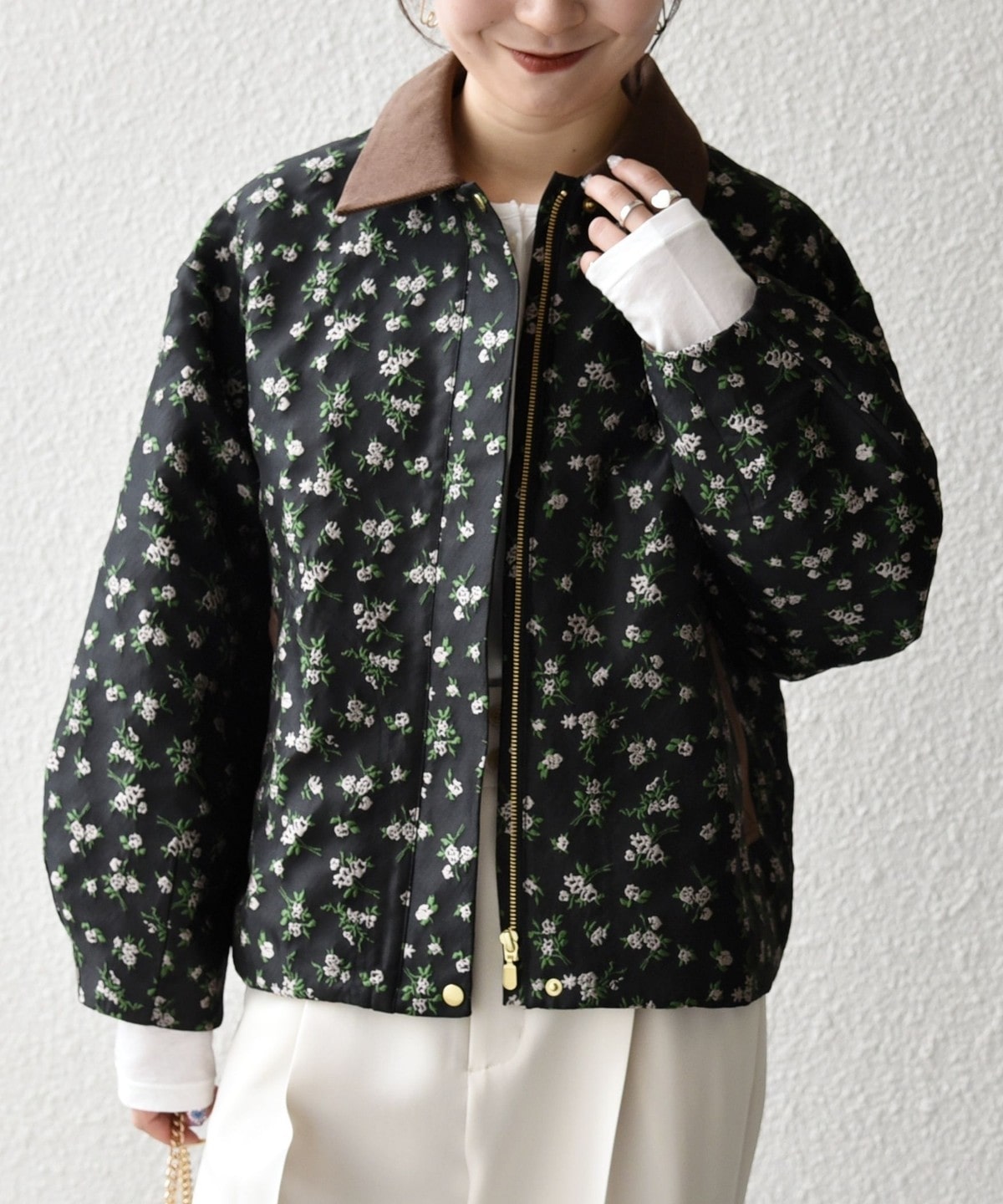 フラワーモチーフのフェミニンさと、ジップブルゾンのカジュアルさが融合したジャケット。