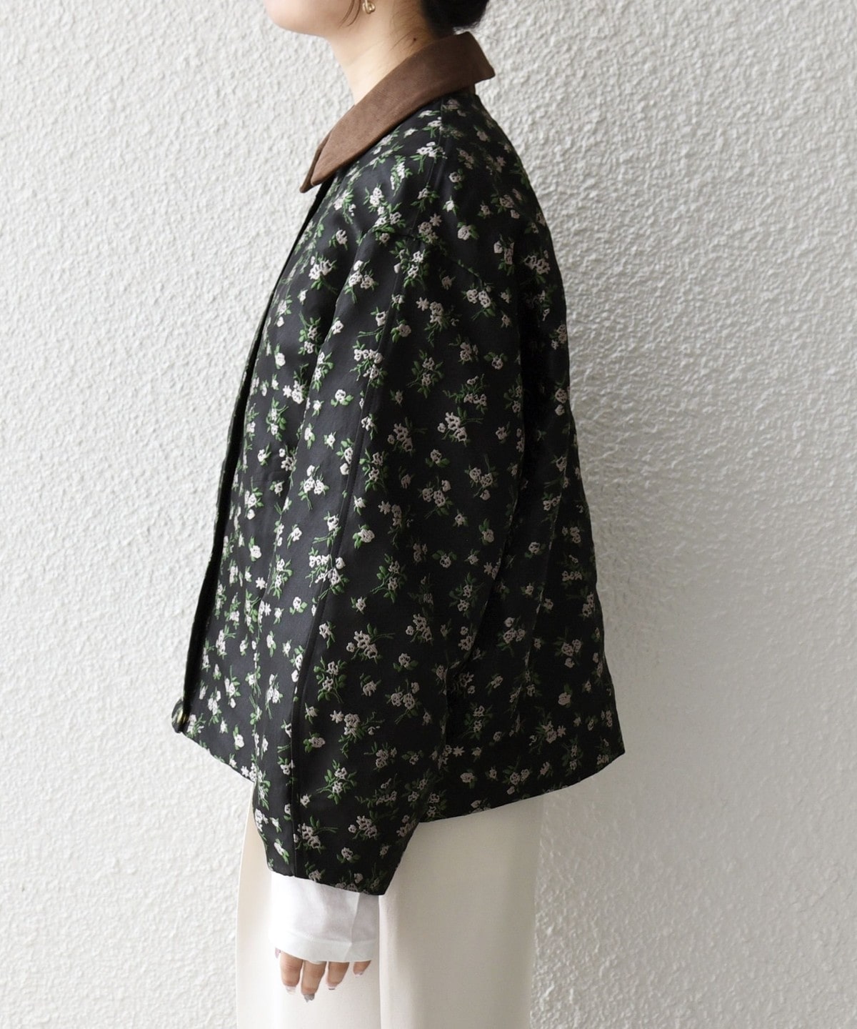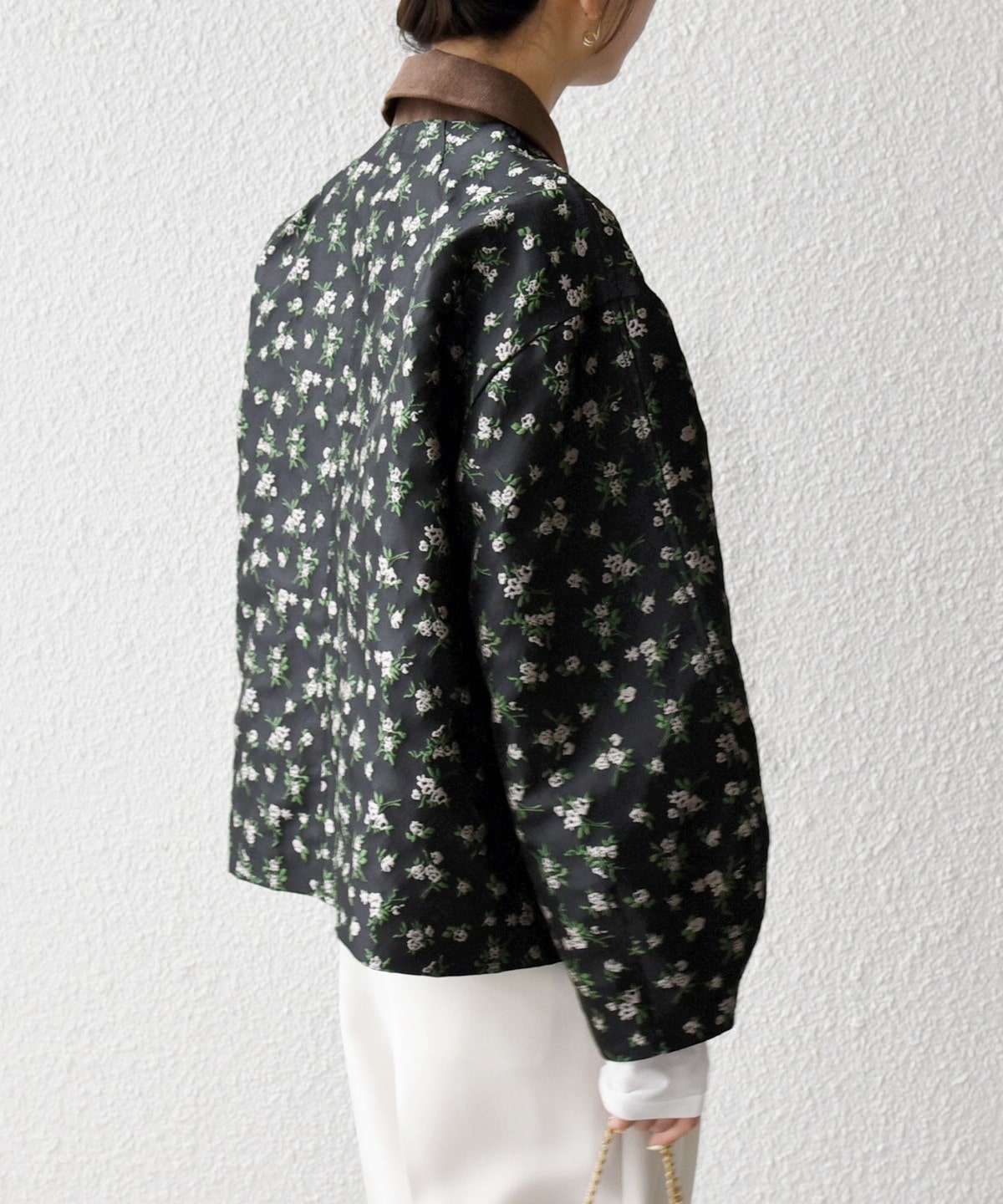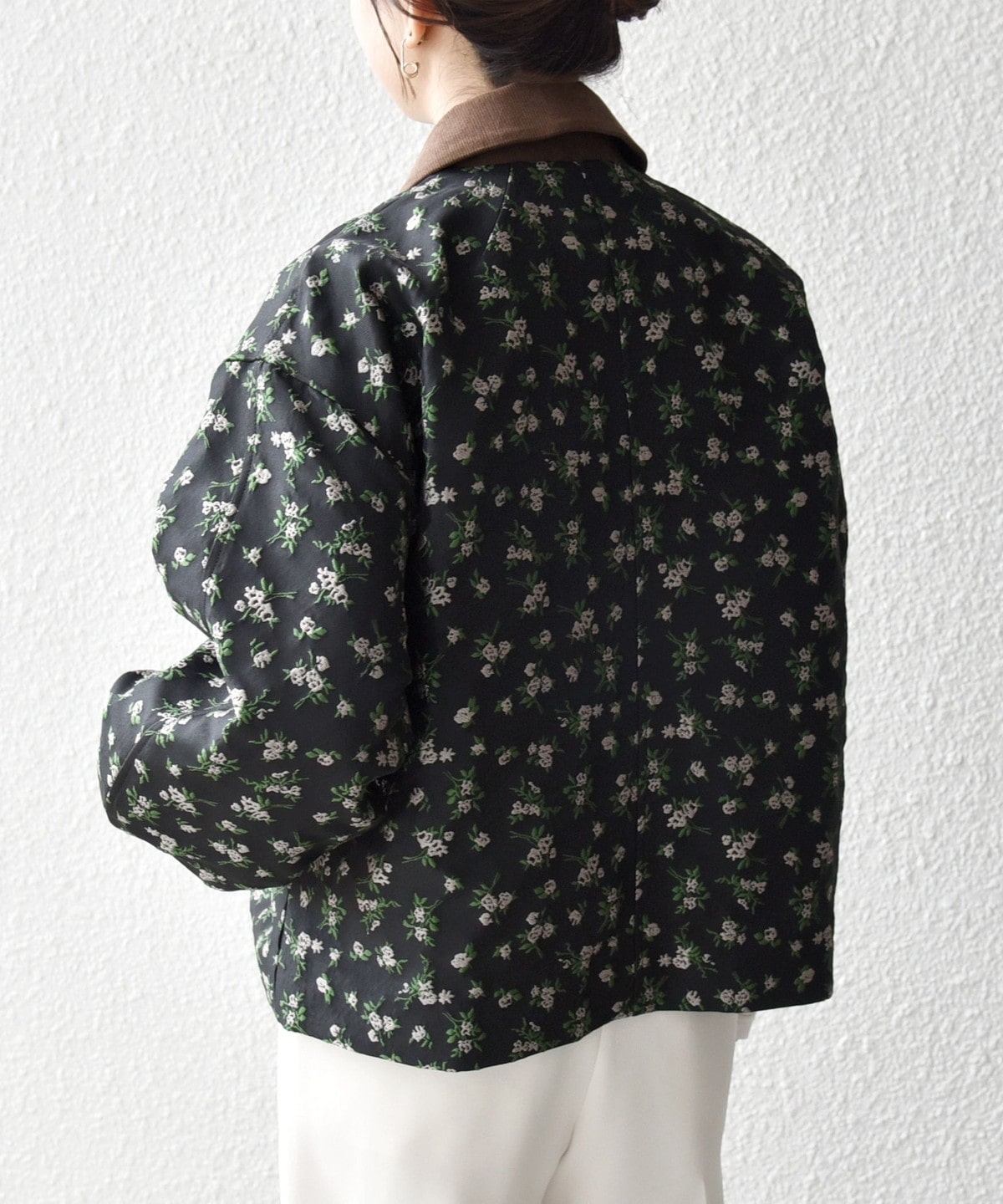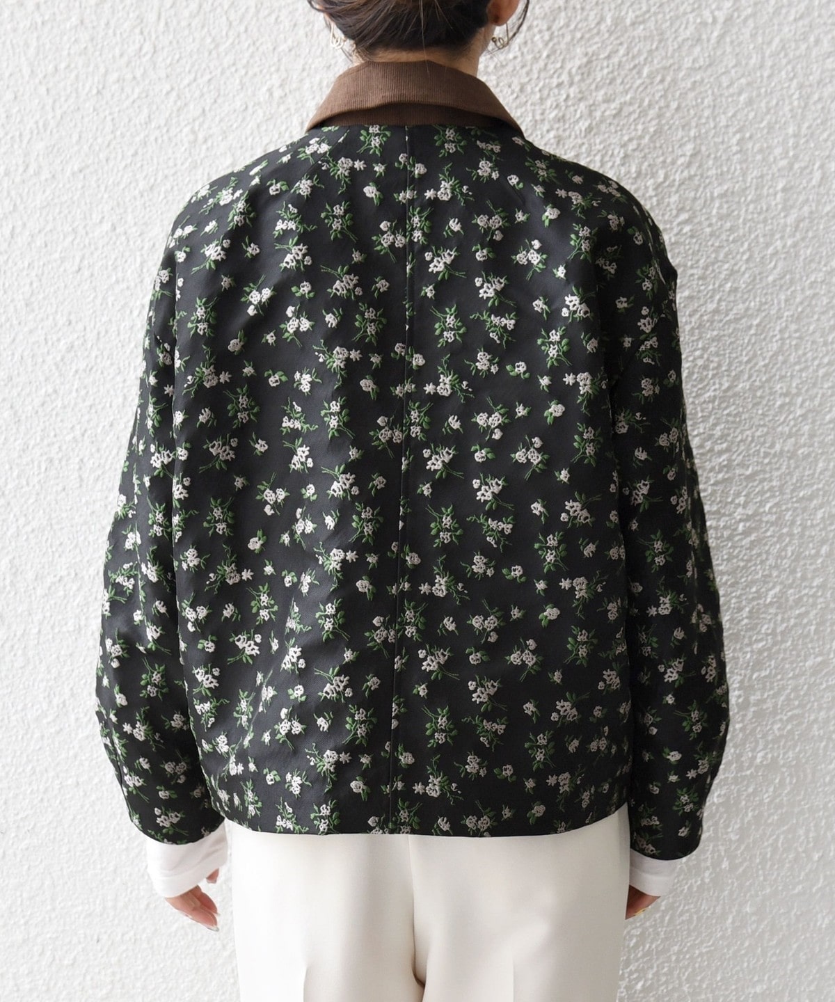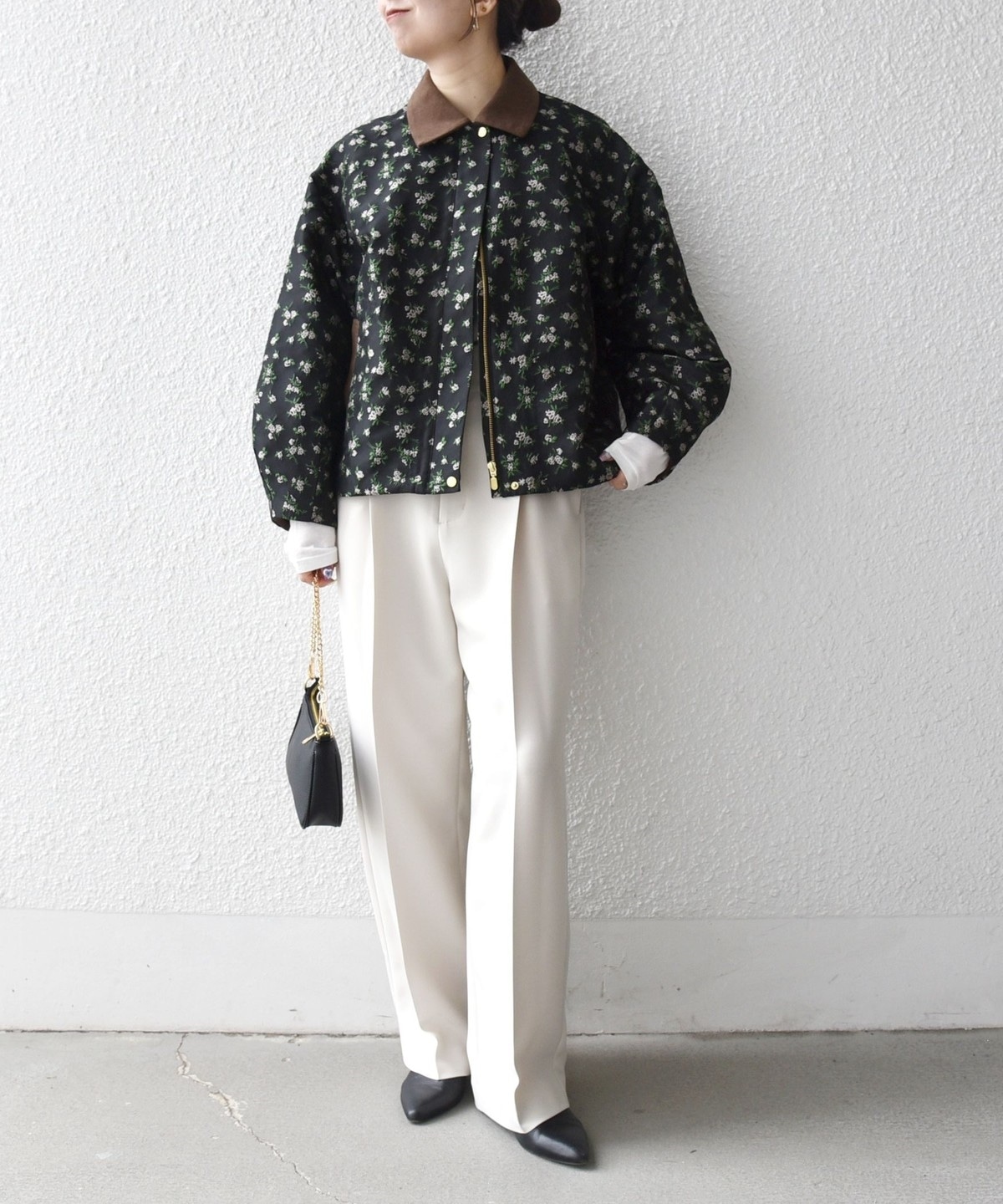フラワーモチーフのフェミニンさと、ジップブルゾンのカジュアルさが融合したジャケット。