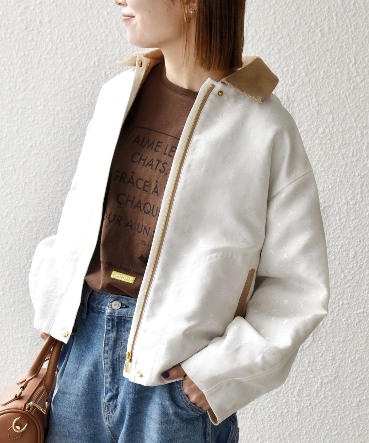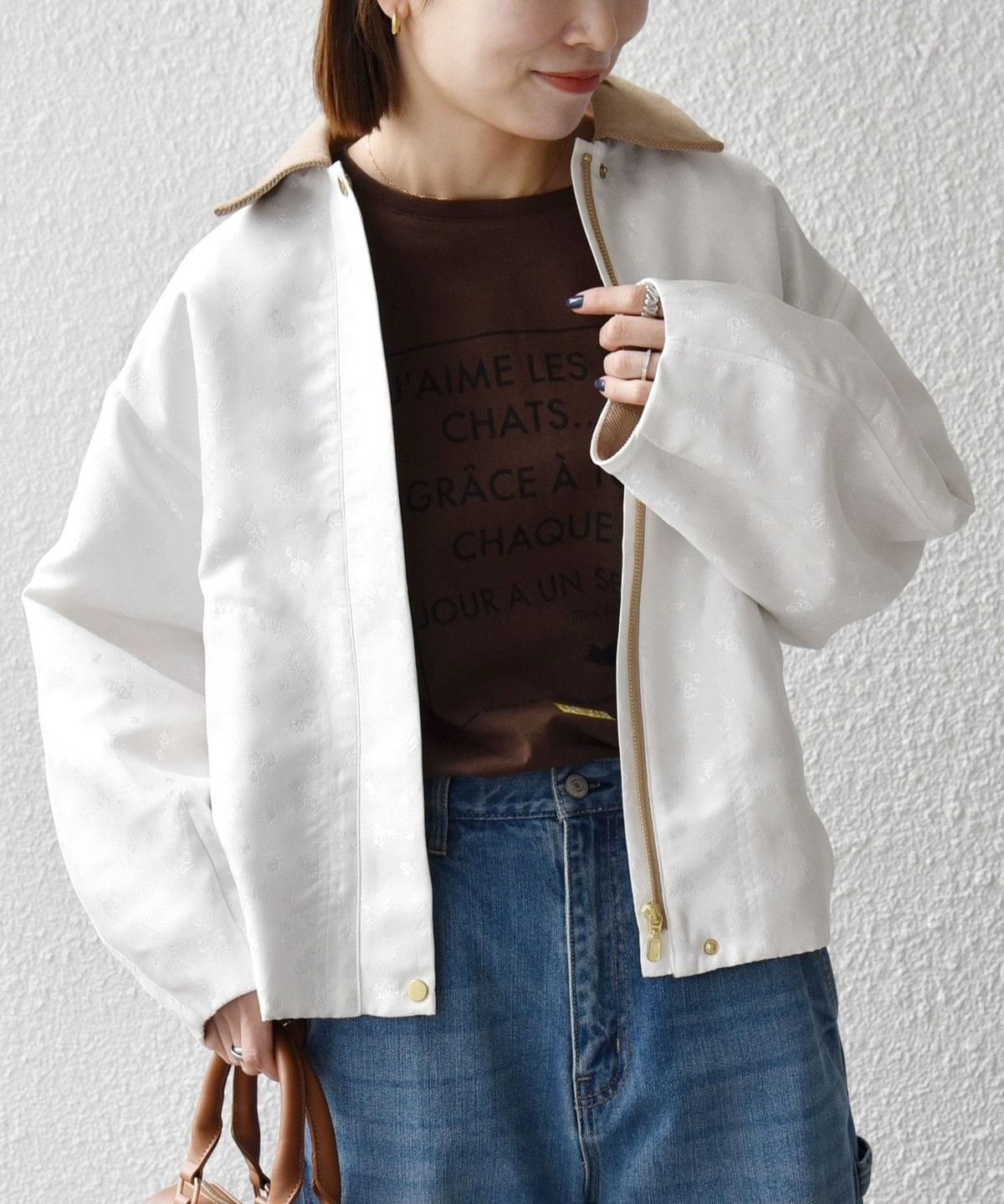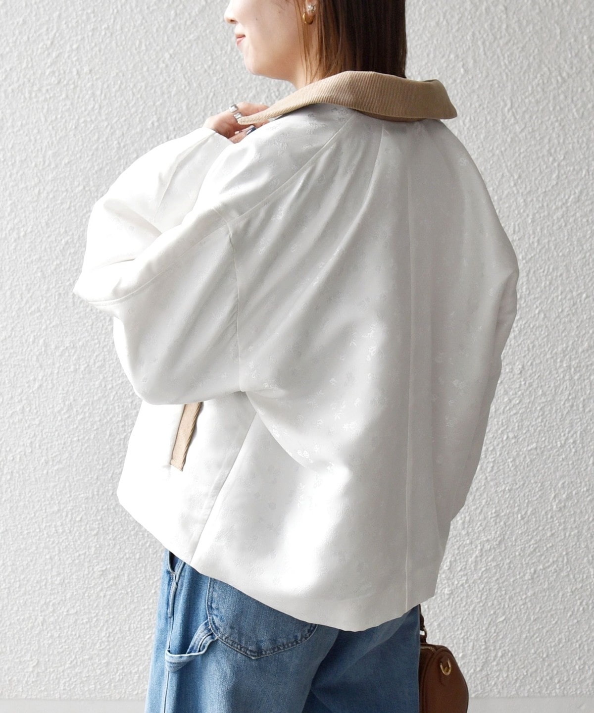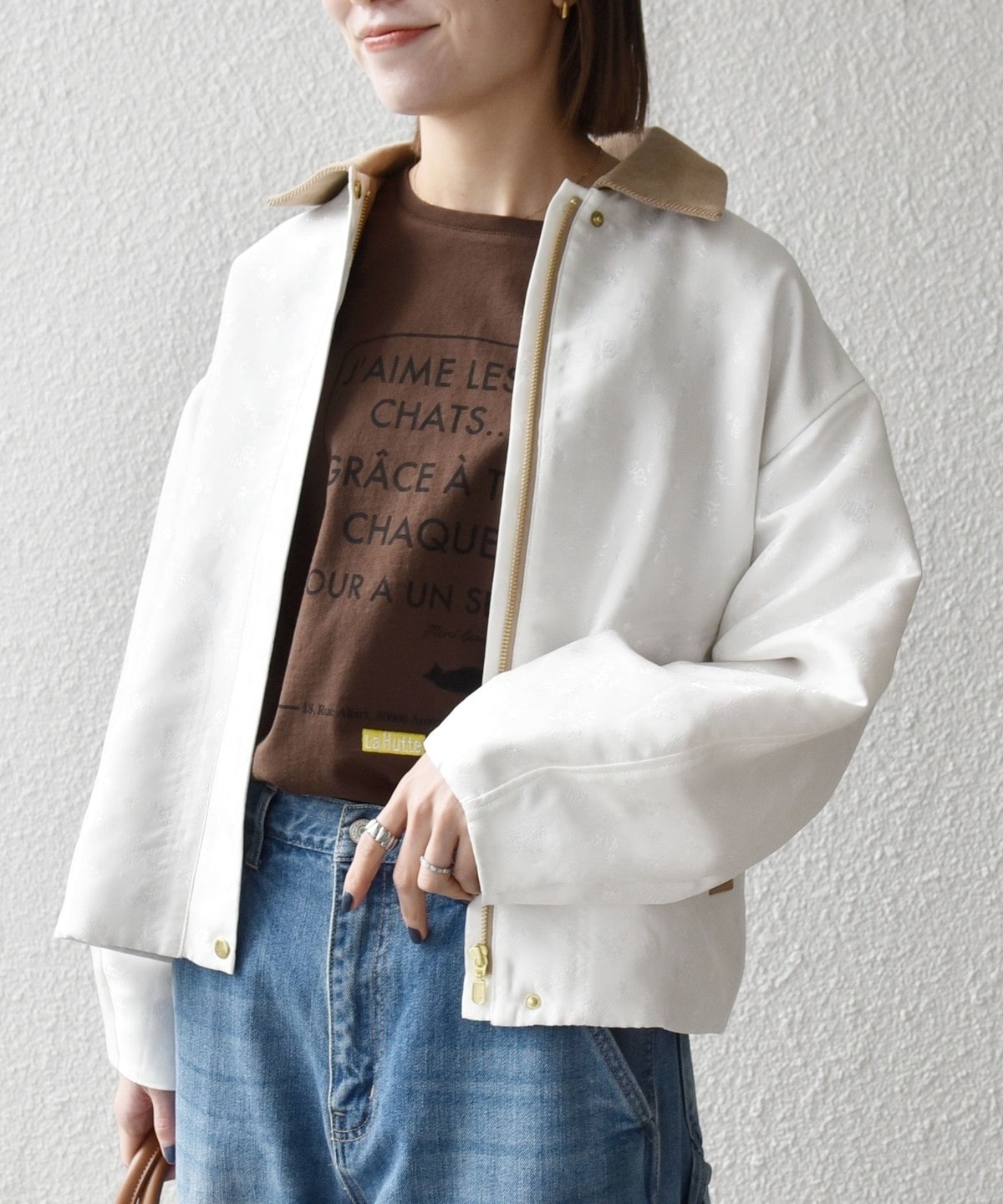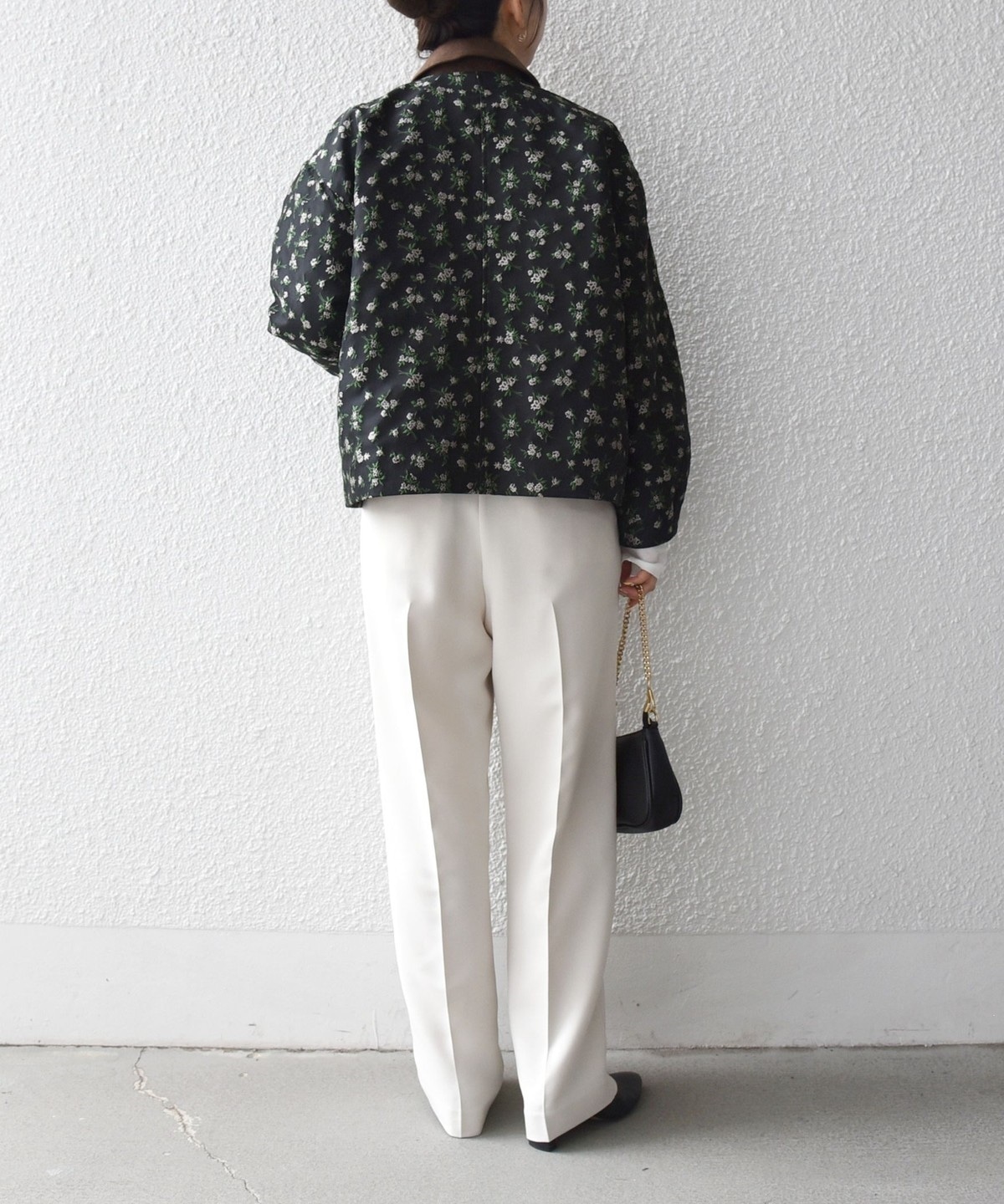 フラワーモチーフのフェミニンさと、ジップブルゾンのカジュアルさが融合したジャケット。