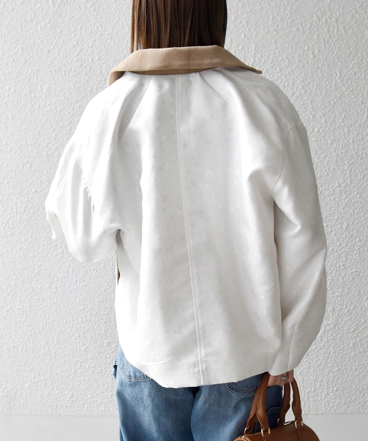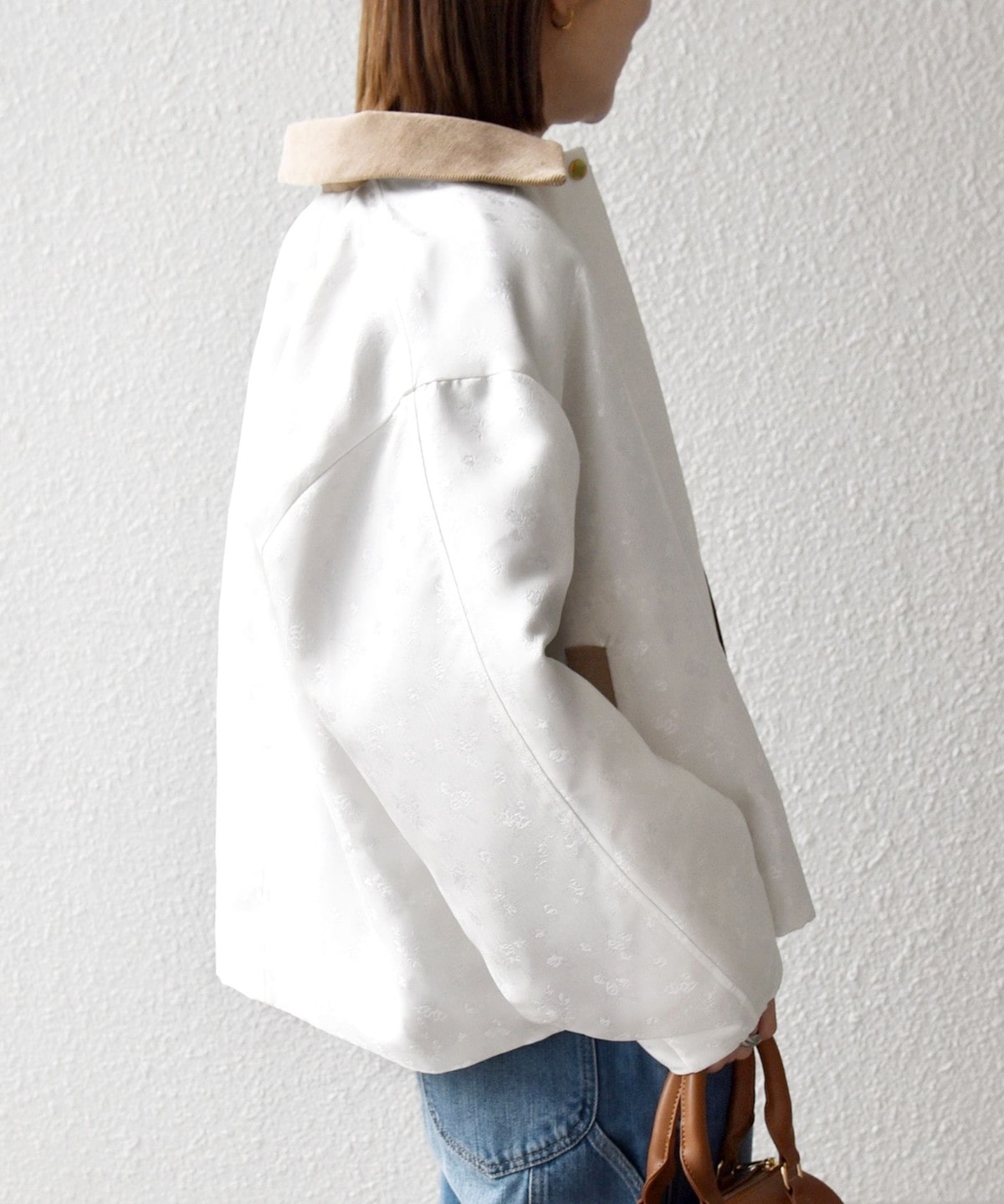 レトロな雰囲気に加え、襟や袖口裏のコーデュロイ素材がアクセントになり、トレンド感あふれるデザインです。